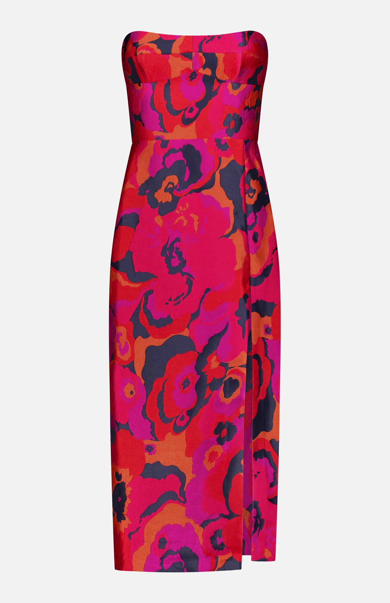 Walk through life with sensuality and strength. This bold red midi dress is a perfectly structured piece featuring a warm, floral print with a leg-baring slit that keeps things formal but fresh. This piece is perfect for romantic dinner dates, formal parties and wedding receptions. Style with black heels and let the dress do the talking.