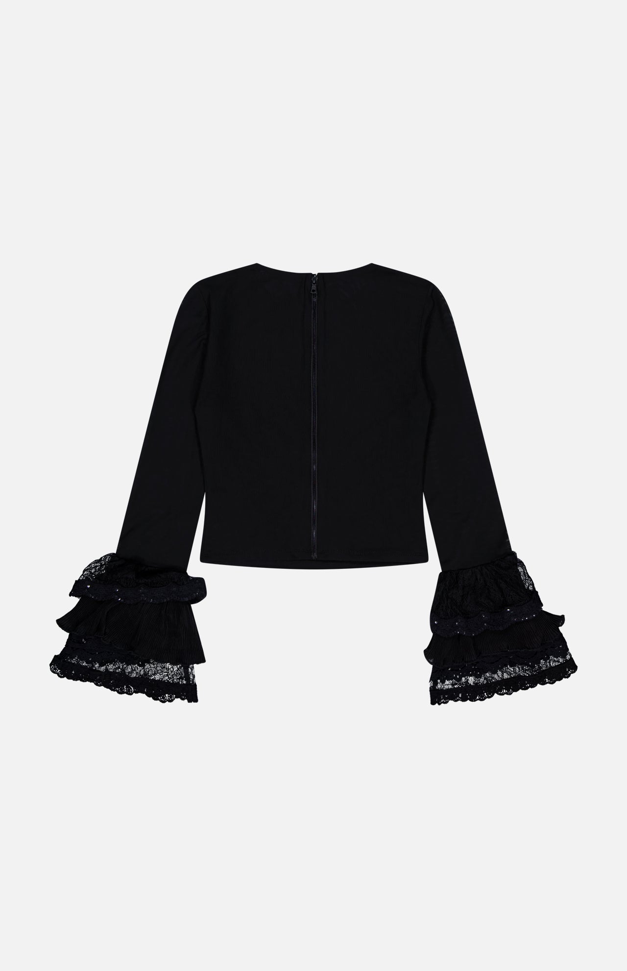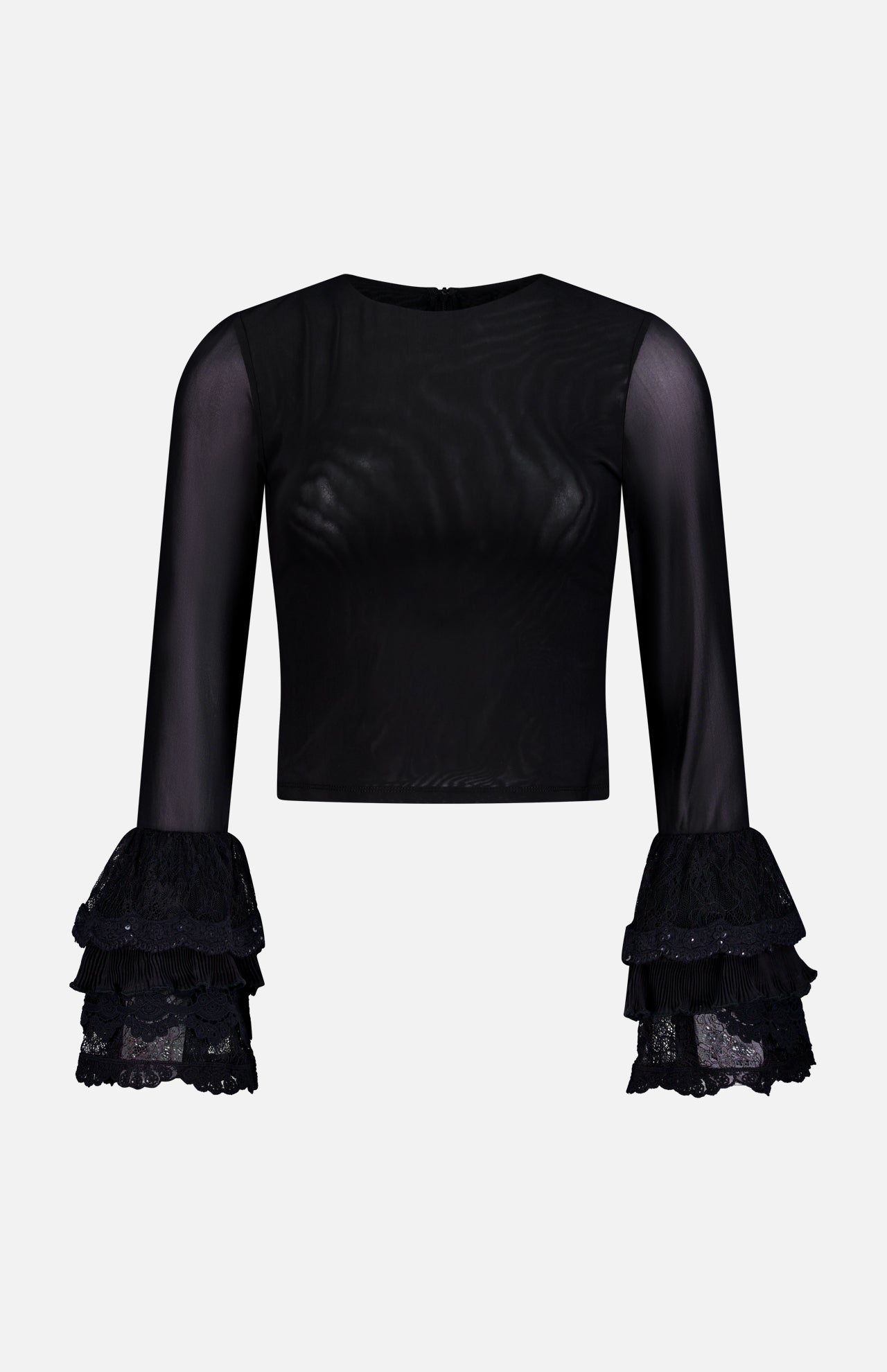 Reach for this going-out top when the crew wants to let loose. This black sheer mesh crop top has a lined bodice with sheer sleeves. You'll love the ruffled and sequined cuffs that feel like built-in accessories. Slim and simple, but with just enough whimsy, it instantly elevates denim or looks ethereal layered under blazers. Have fun styling this Victorian-inspired piece.