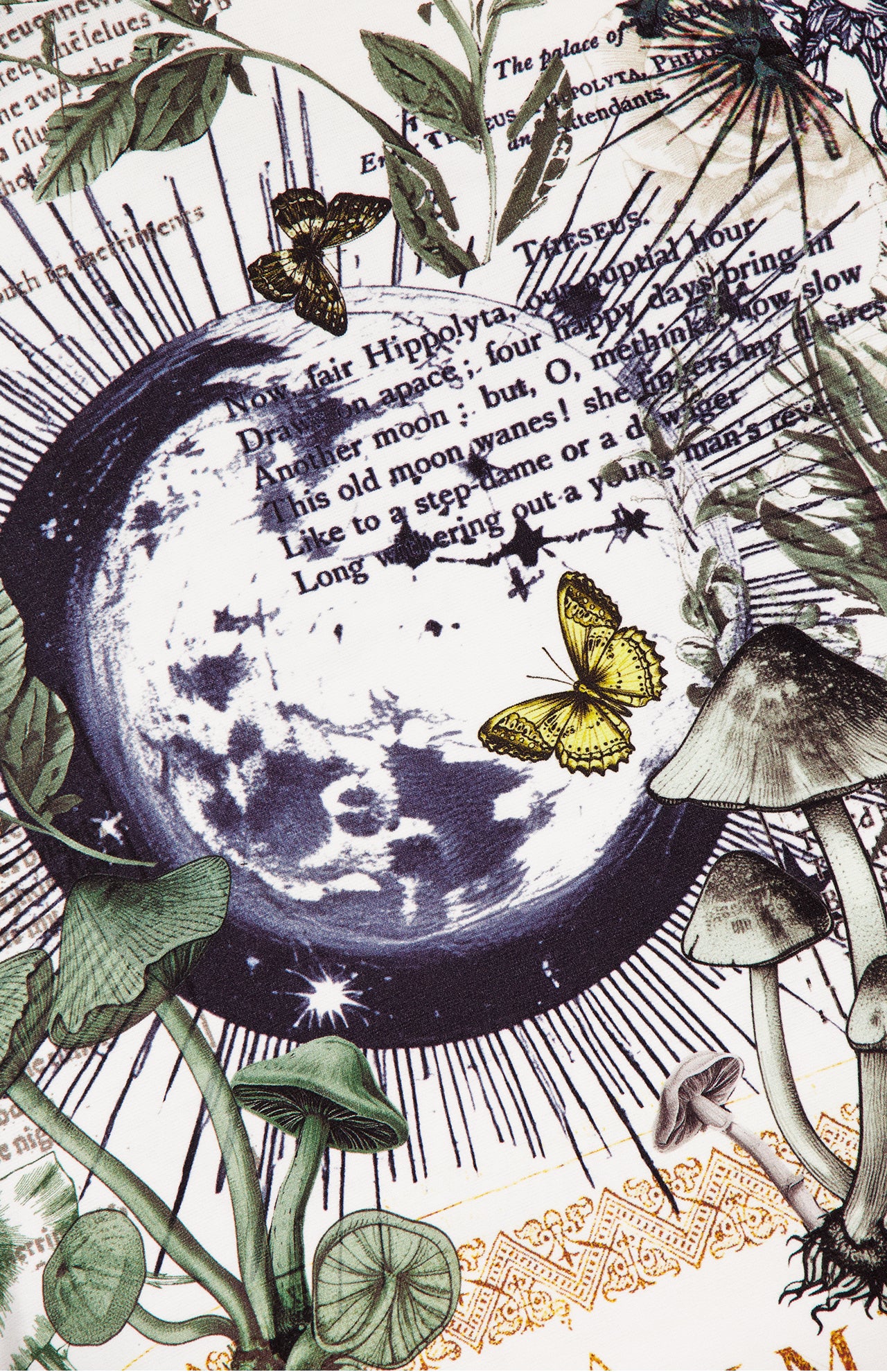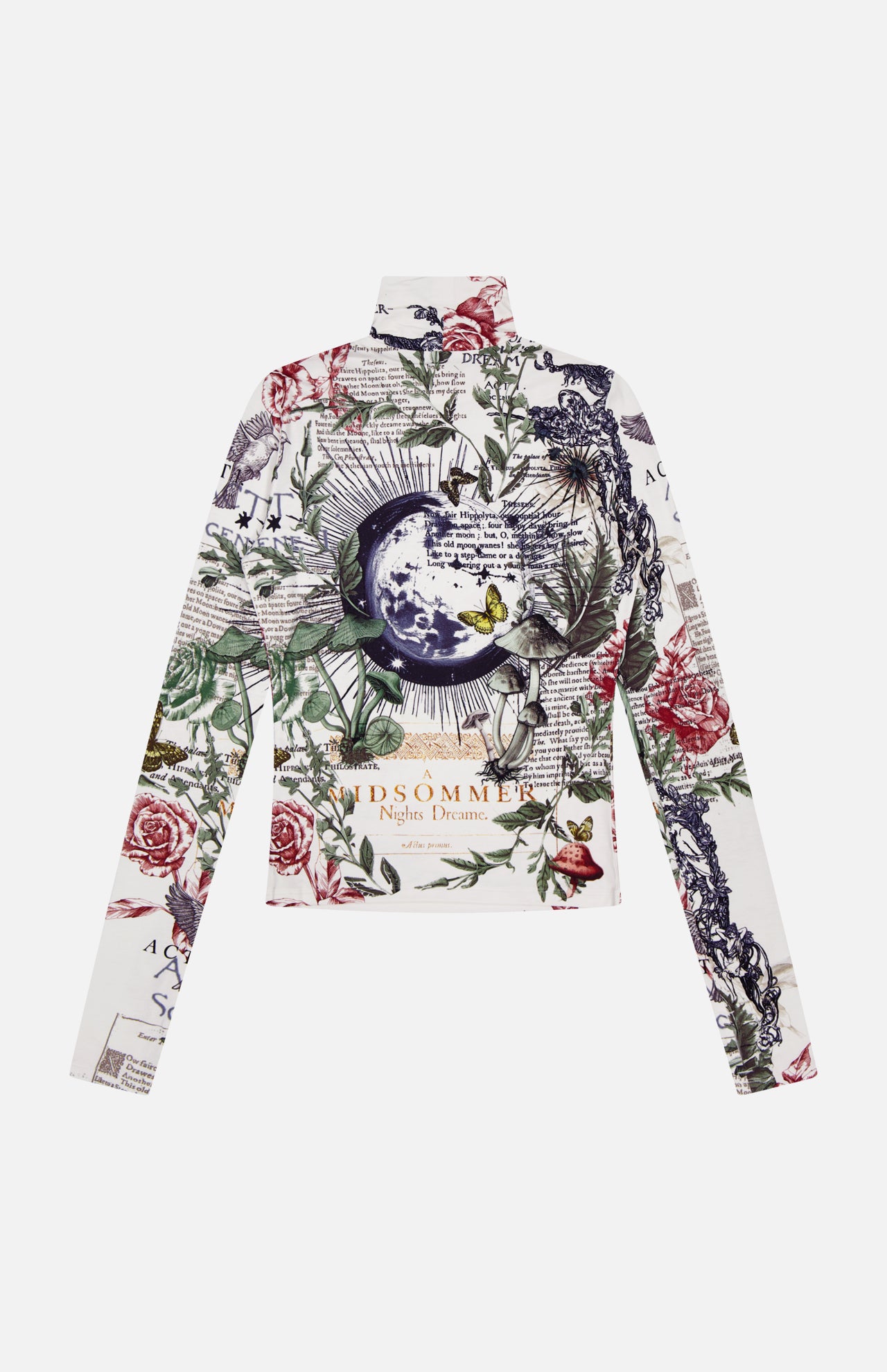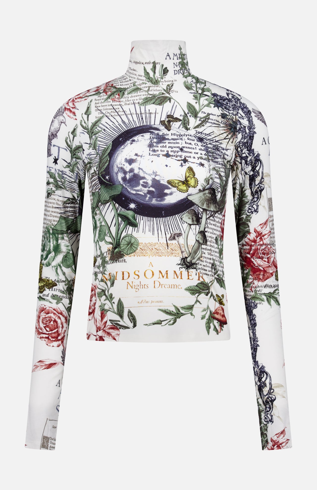 This multicolored turtleneck top is part of a collection inspired by the Royal Shakespeare Company's costume archive. It’s bold, fanciful and features a striking dreamscape print in an ultra-soft viscose body. Wear it with high-waisted trousers and boots for a fashionable and fitted look.