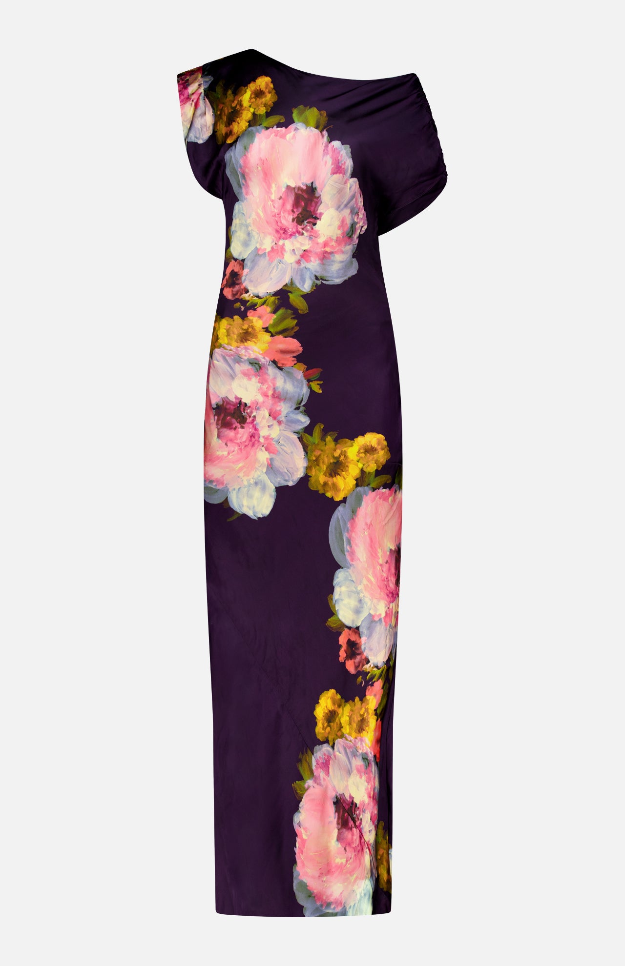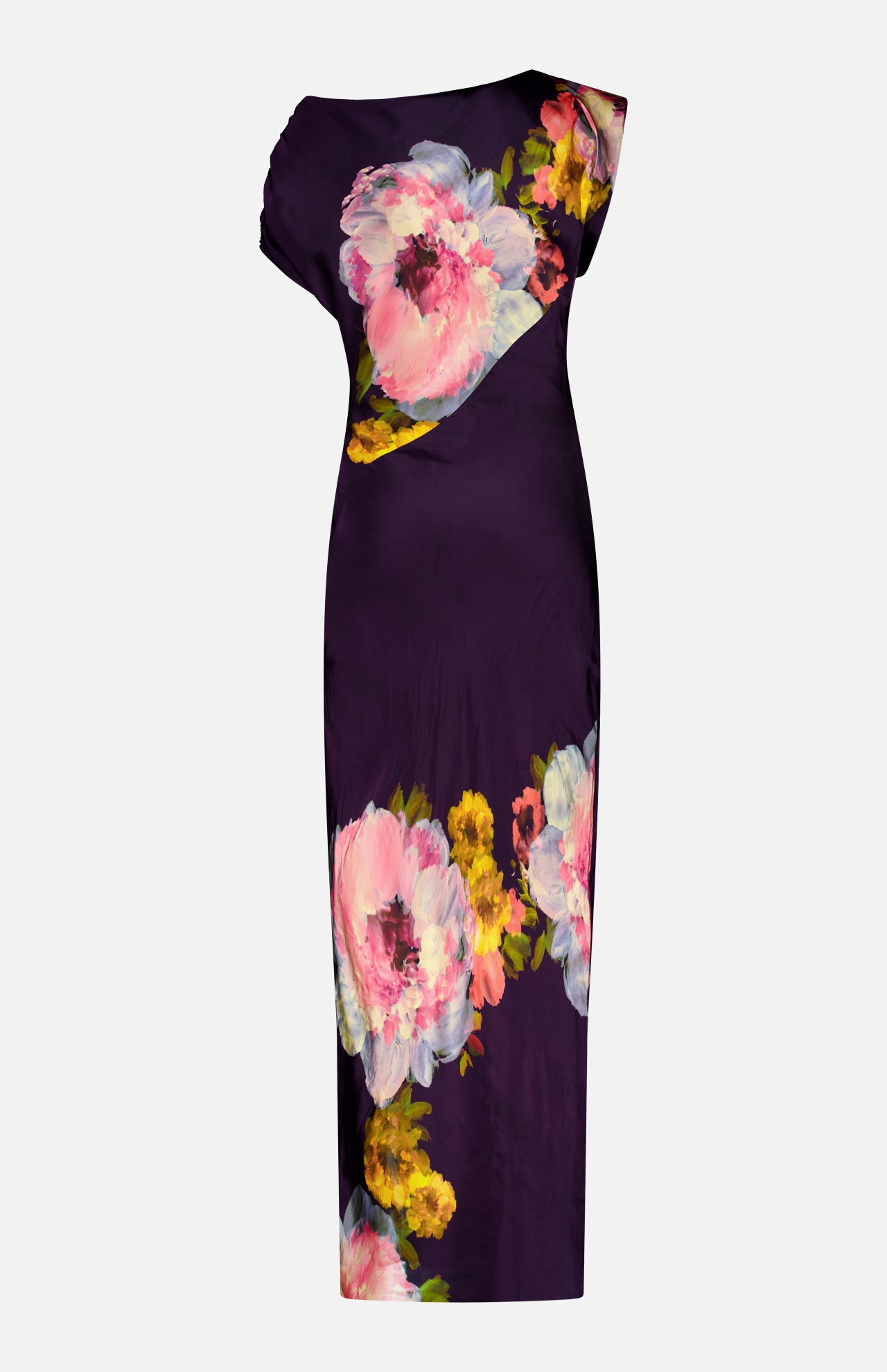 Walk through life with sensuality and strength. An easy choice for special occasions, this full-length, loose-fit dark purple dress has a large-scale floral print that’s ignore-proof. Expect an off-the-shoulder bias cut that’s delicately gathered at the shoulder, adding a romantic touch. Wear it to fall weddings, romantic dinners and outdoor galas.