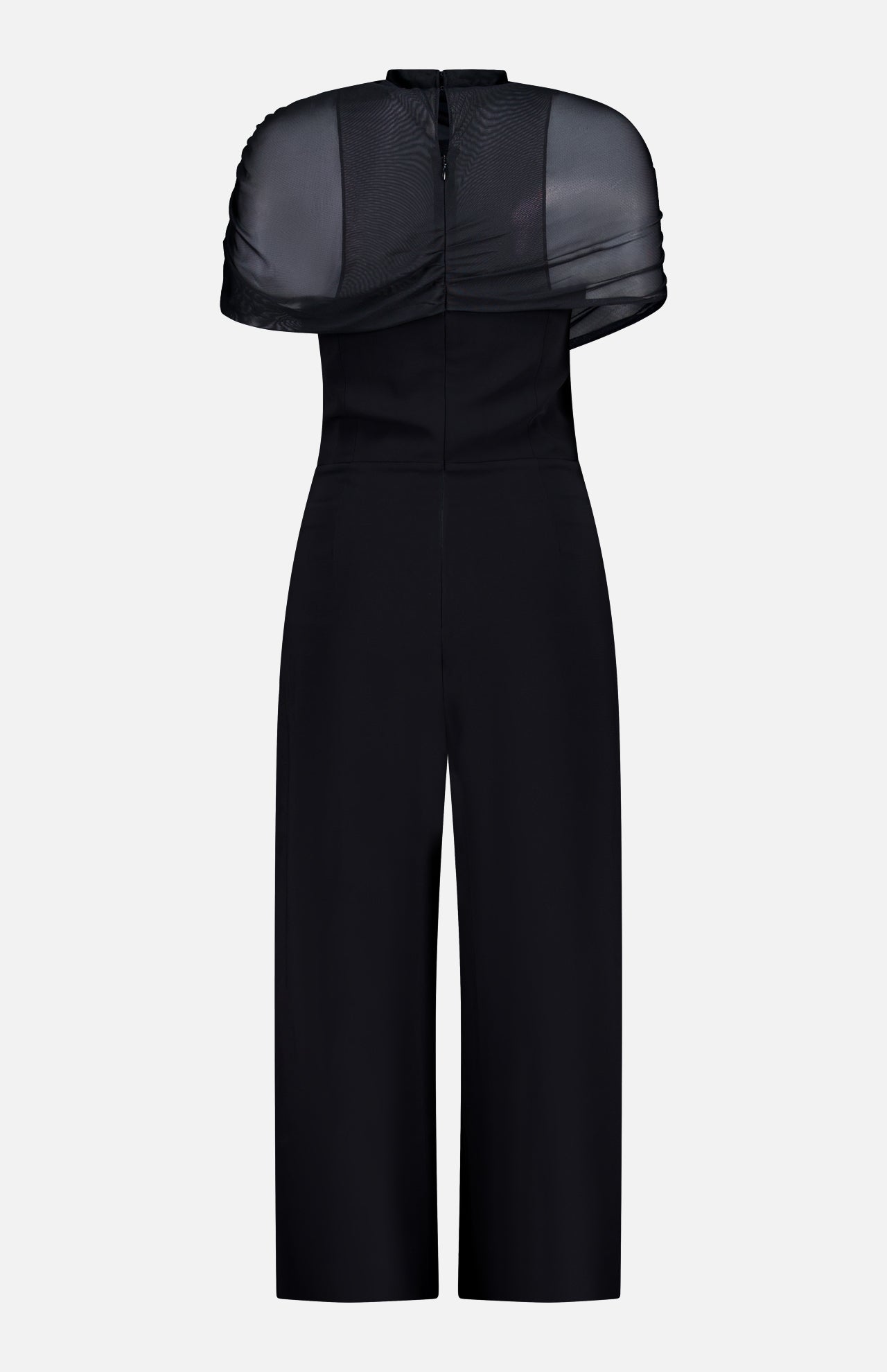 Walk through life with sensuality and strength. This black jumpsuit is the one-and-done piece that delivers a sexy and sophisticated vibe. We love the dramatic detail of the shirred, mesh overlay at the bodice and sleeve area. Wear this look for weddings, romantic dates or vacations.
