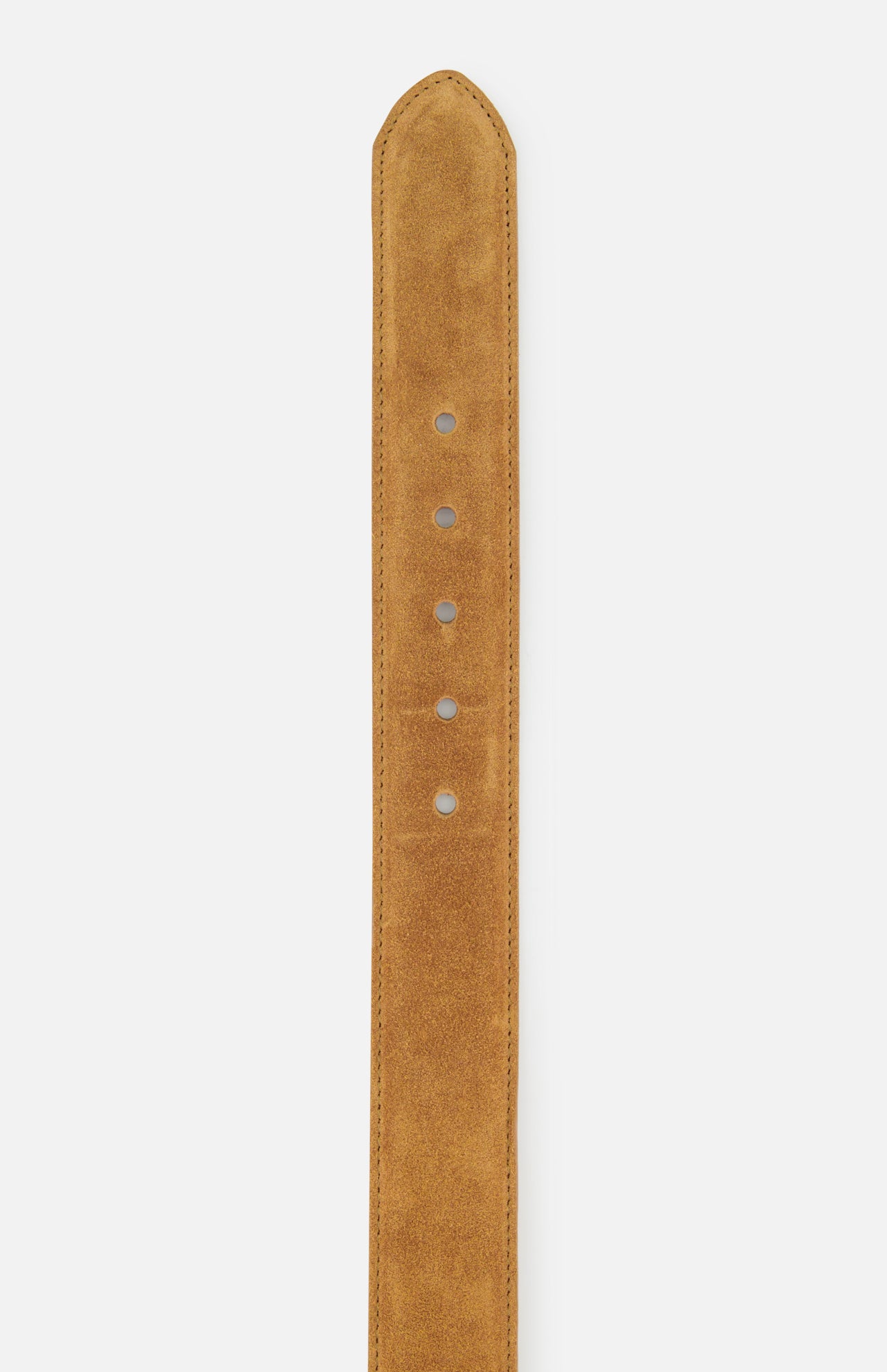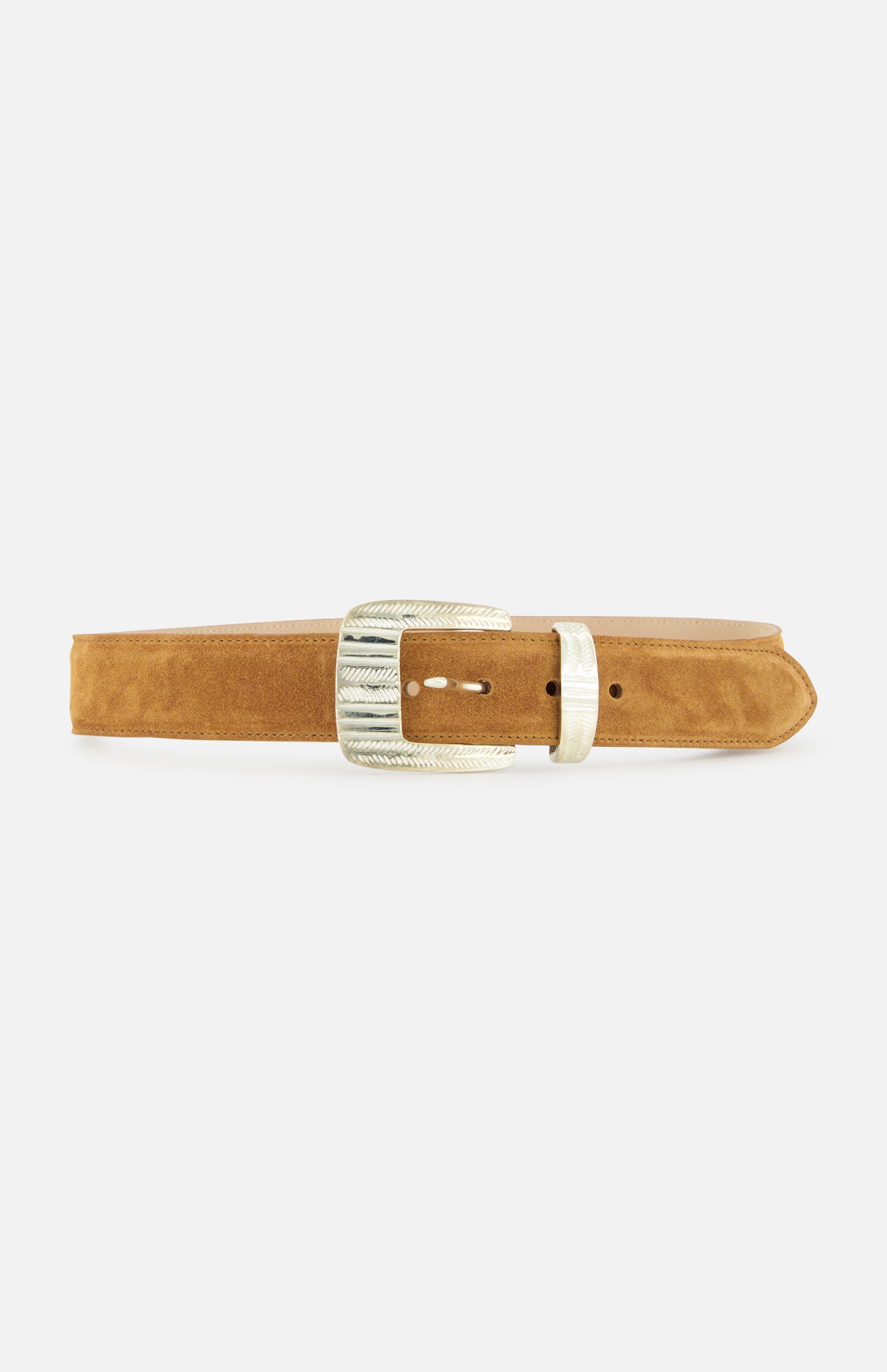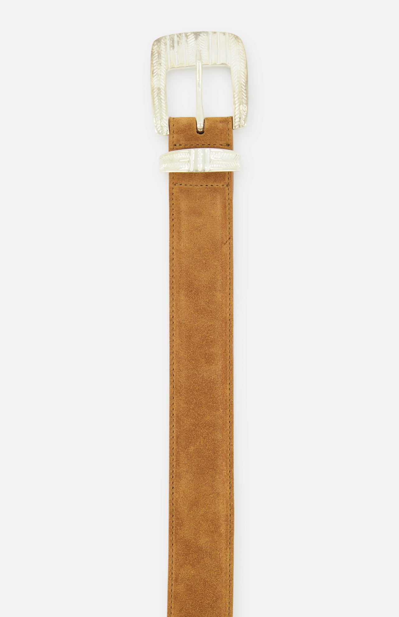 Get more out of your outfit when you add well-placed accessories. This tan belt has subtle, Western-inspired engravings on a solid brass buckle that adds dimension to this classic style. Designed in soft Italian suede, this belt is handcrafted in Los Angeles and is the detail to drive the look home.