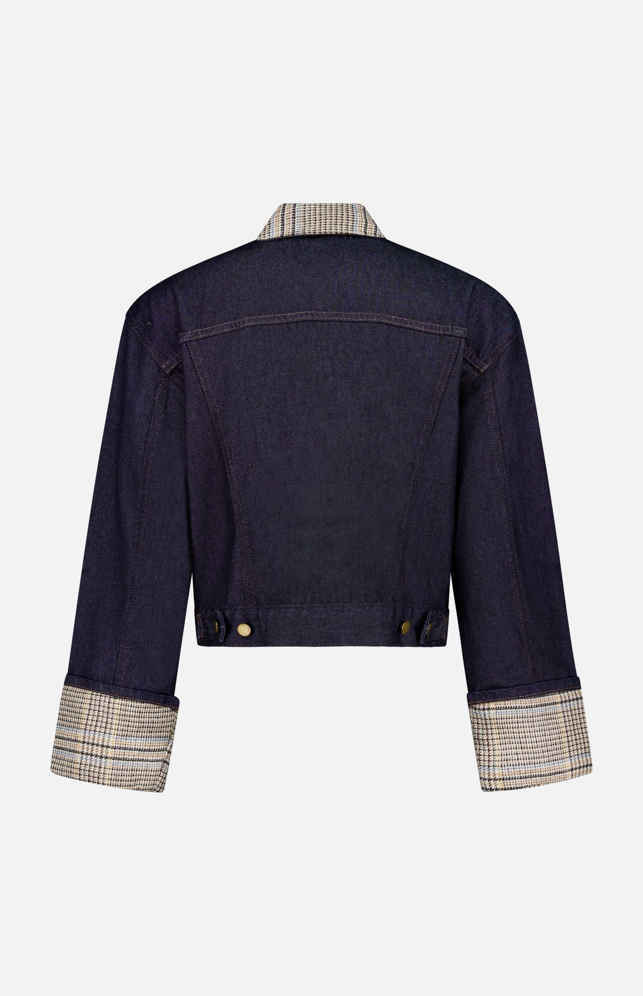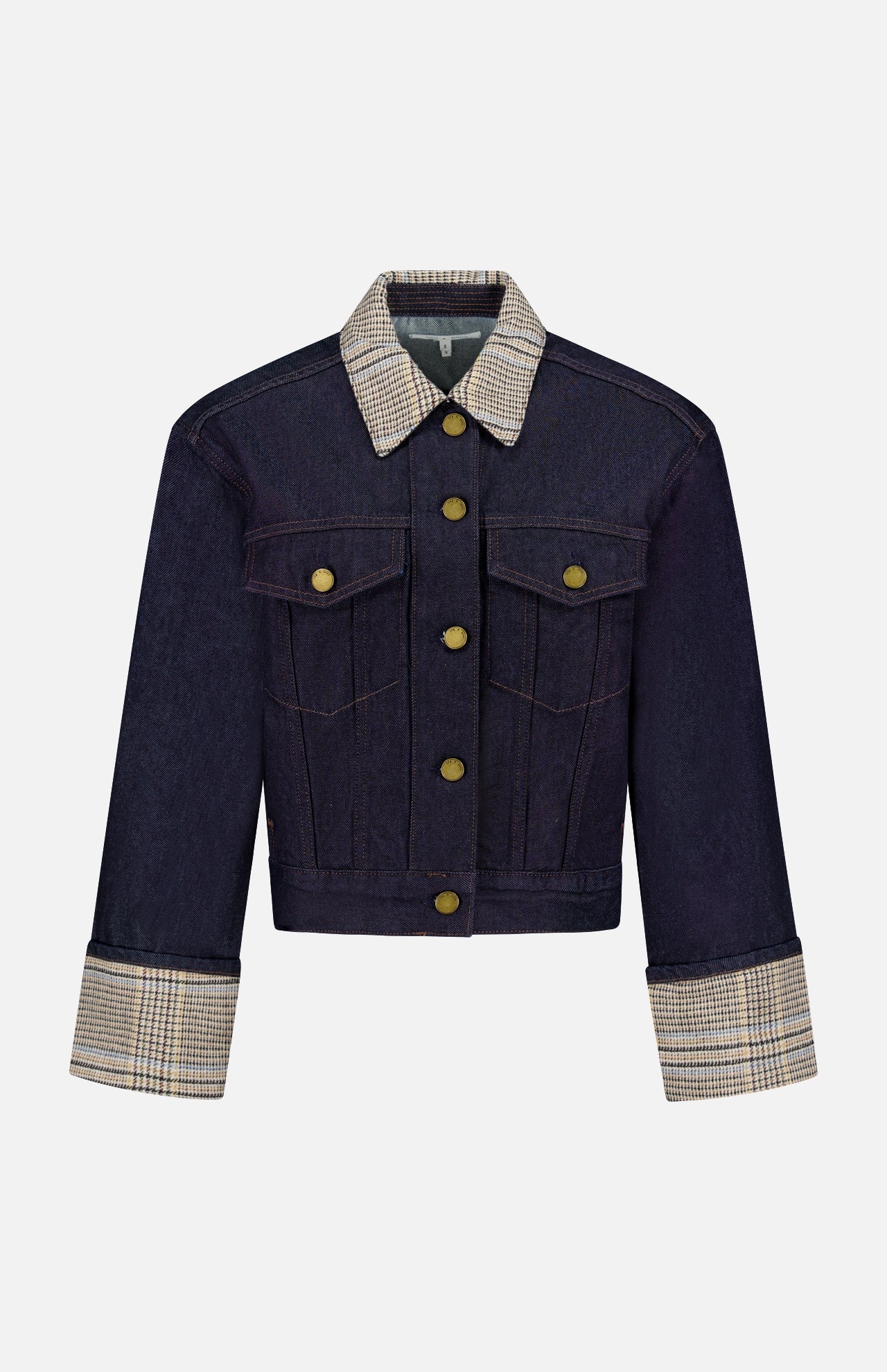 This denim jacket’s inky dark wash has a statement collar and sewn-down cuffs in an Italian-milled heritage wool plaid. It stands in stark contrast to the dark denim and offers a playful touch with a cropped fit. Wear it with tailored trousers or similarly colored jeans for a twist on double denim. It’s traditional with a bit of attitude.