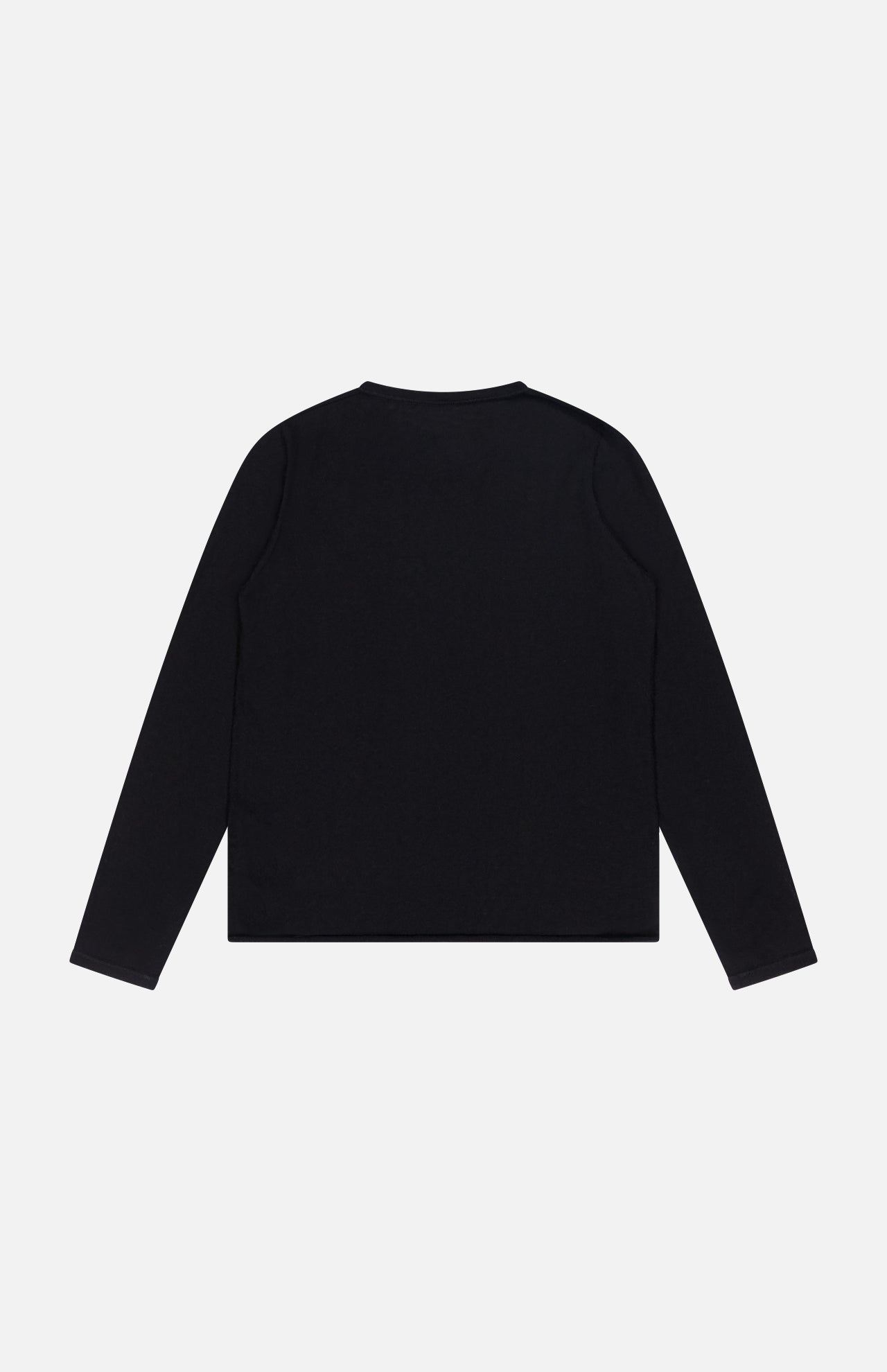 This closet basic is expressed in soft, quality materials that are luxurious with a second skin effect and a strong Parisian spirit. This black, long-sleeve crew neck t-shirt is knitted in 100% cashmere. This lightweight and machine washable cashmere is both timeless and effortless.