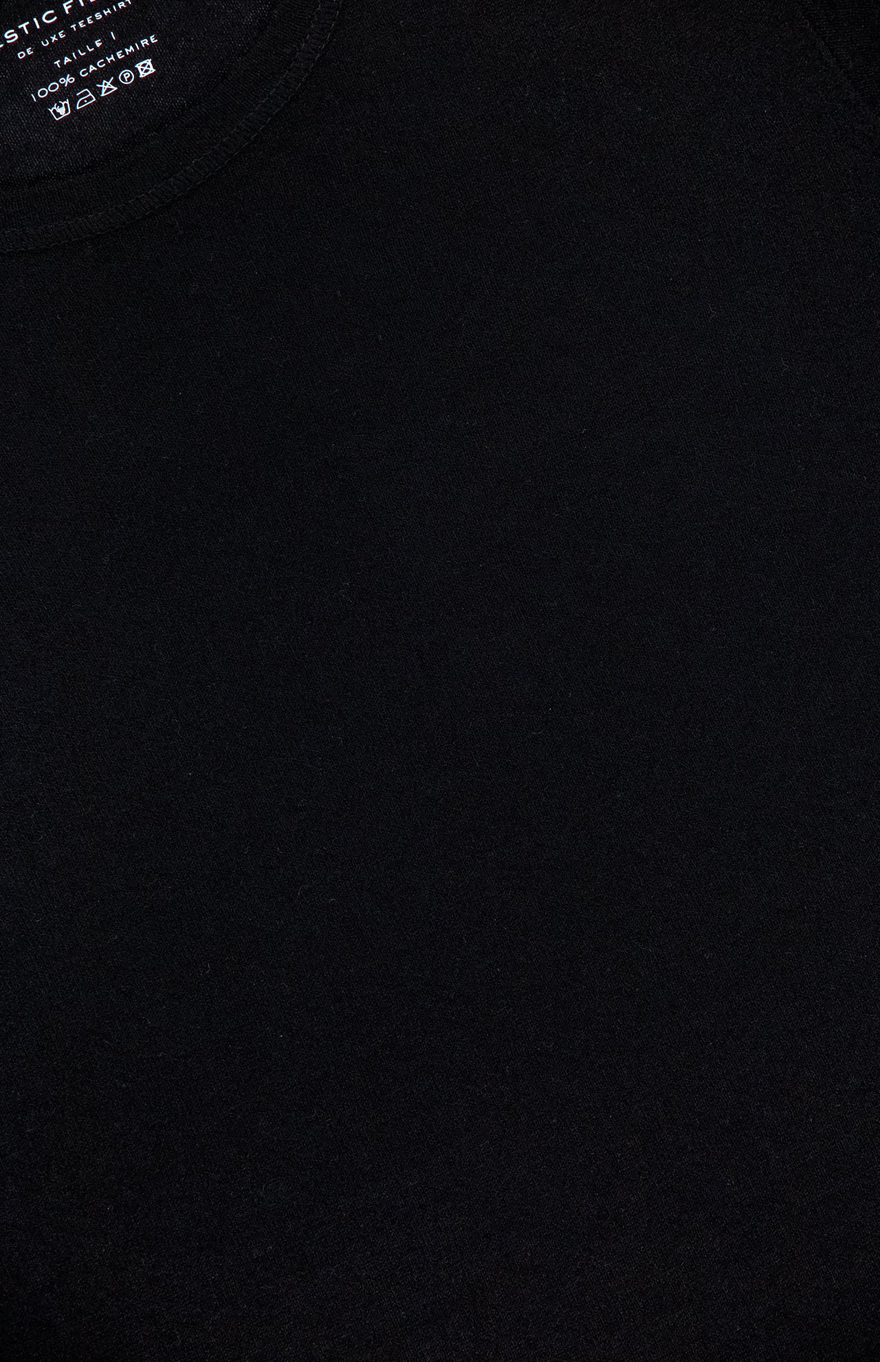 This closet basic is expressed in soft, quality materials that are luxurious with a second skin effect and a strong Parisian spirit. This black, short-sleeve crew neck t-shirt is knitted in 100% cashmere. It’s lightweight, machine washable and both timeless and effortless.