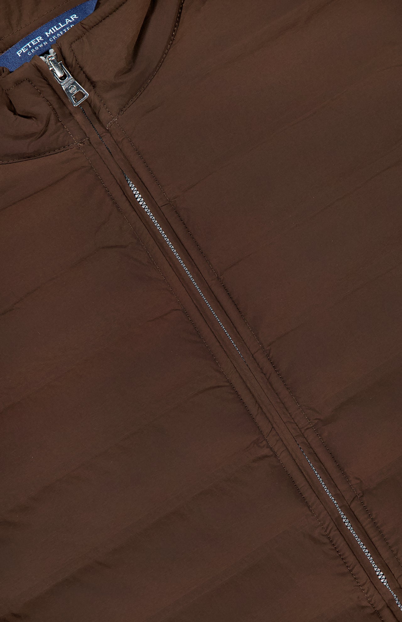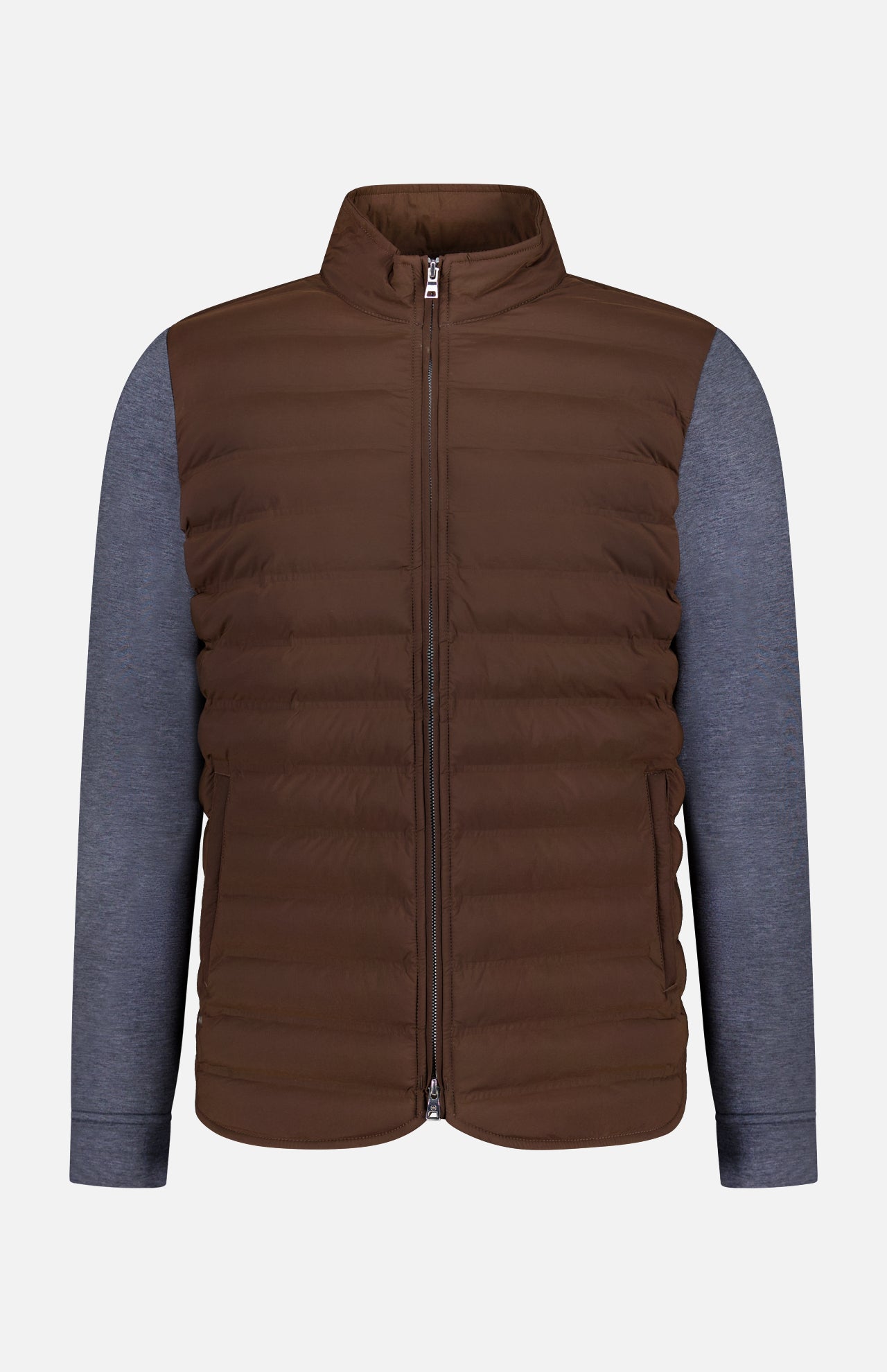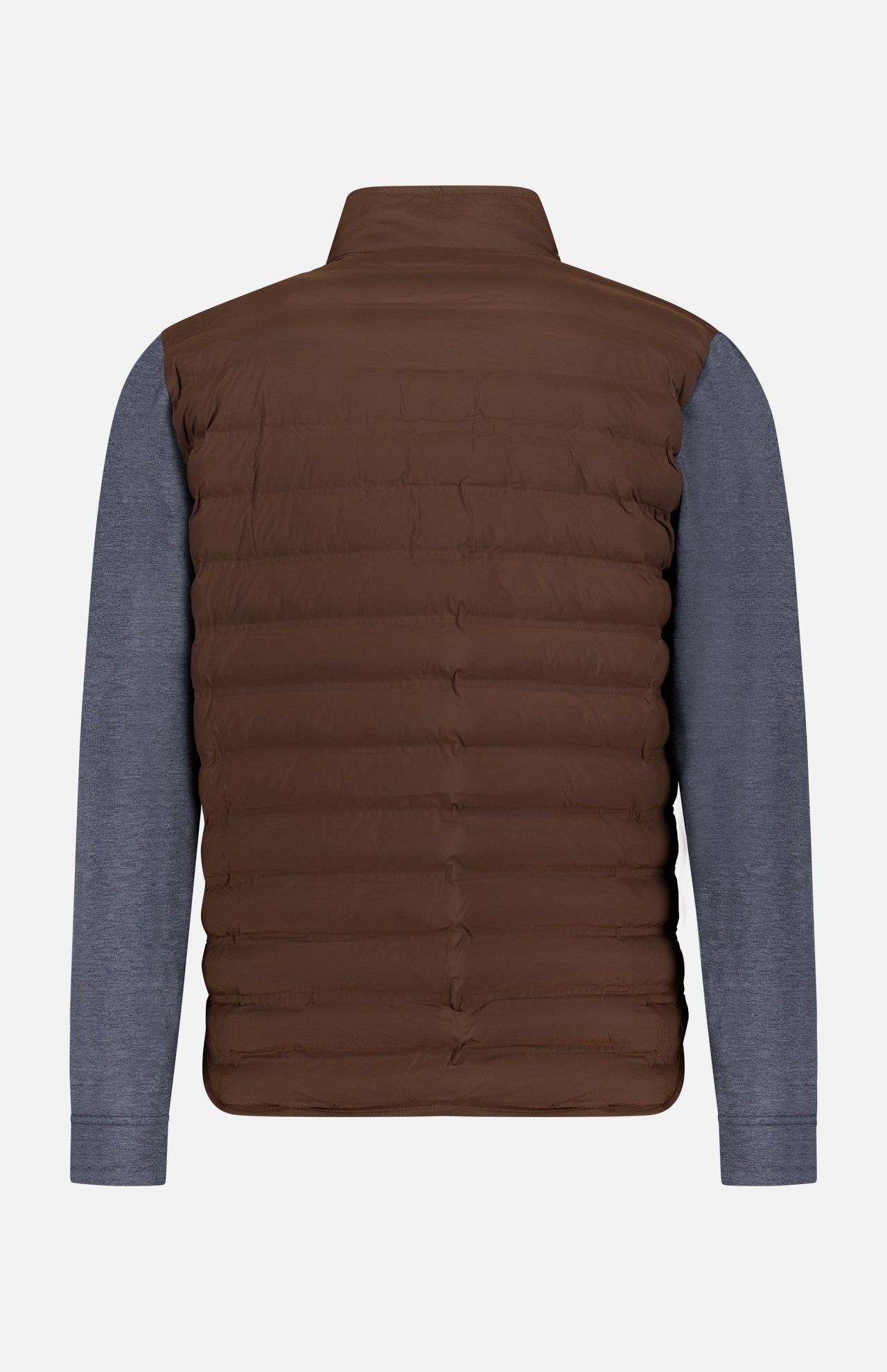 Hybrid pieces are versatile and keep things interesting. This brown jacket is ultra-adaptable and is designed with a channel-insulated body combined with grey fabric sleeves that bring exceptional functionality and a sleek detail. Soft and with stretch mobility, this piece is perfect for chilly days on the course but is equally at home in the city.