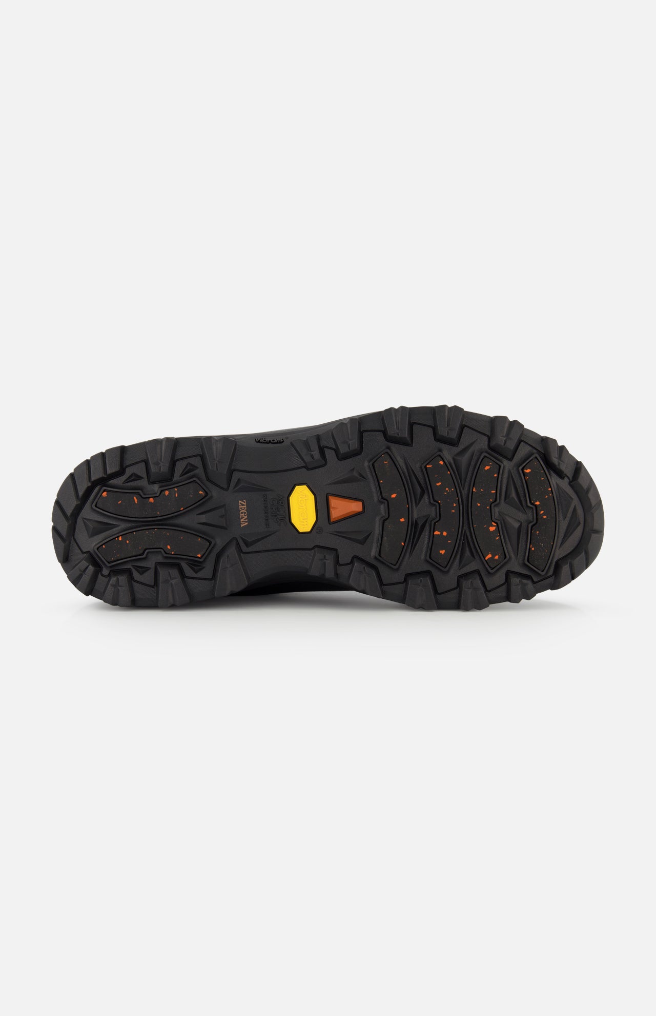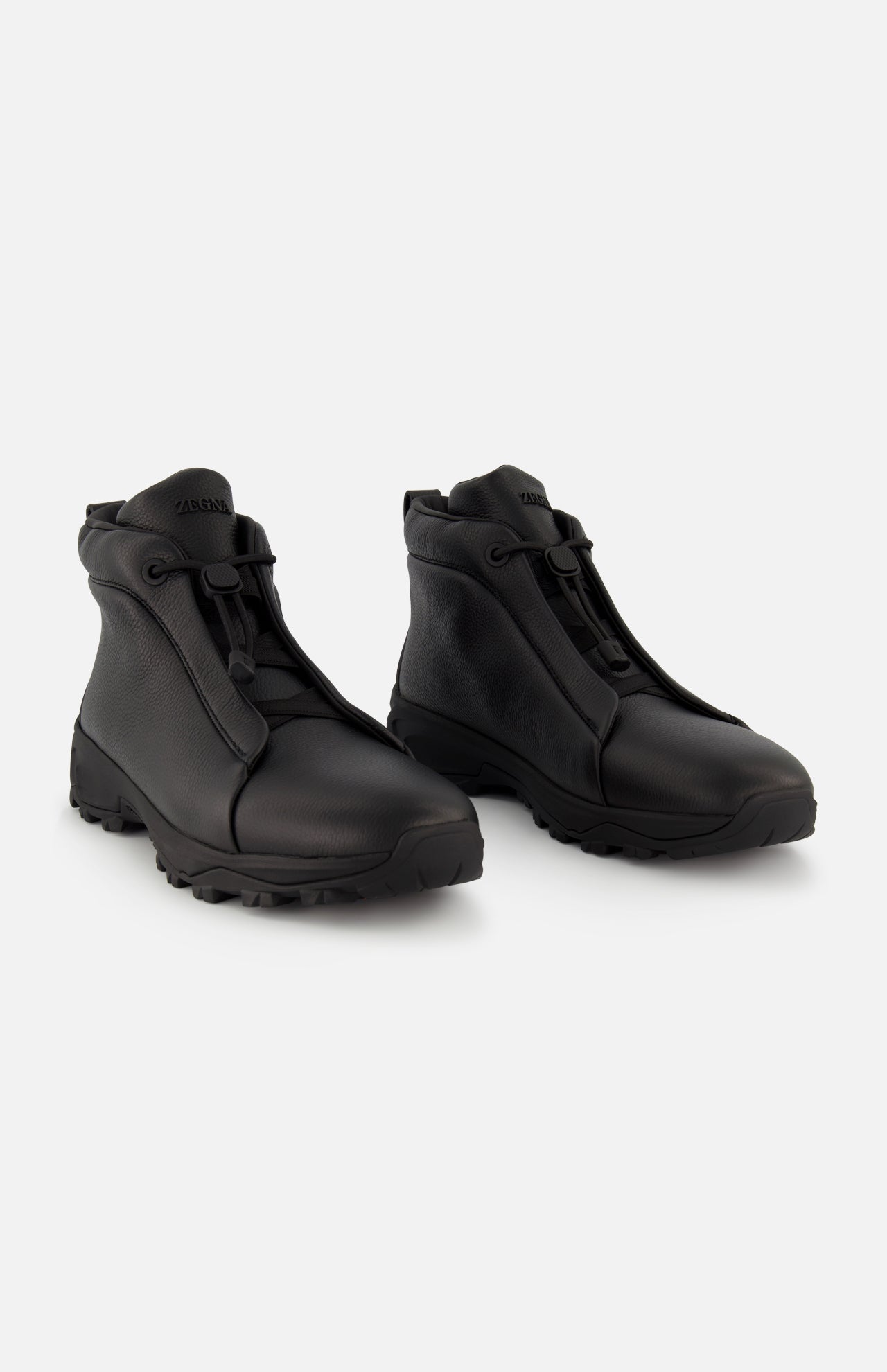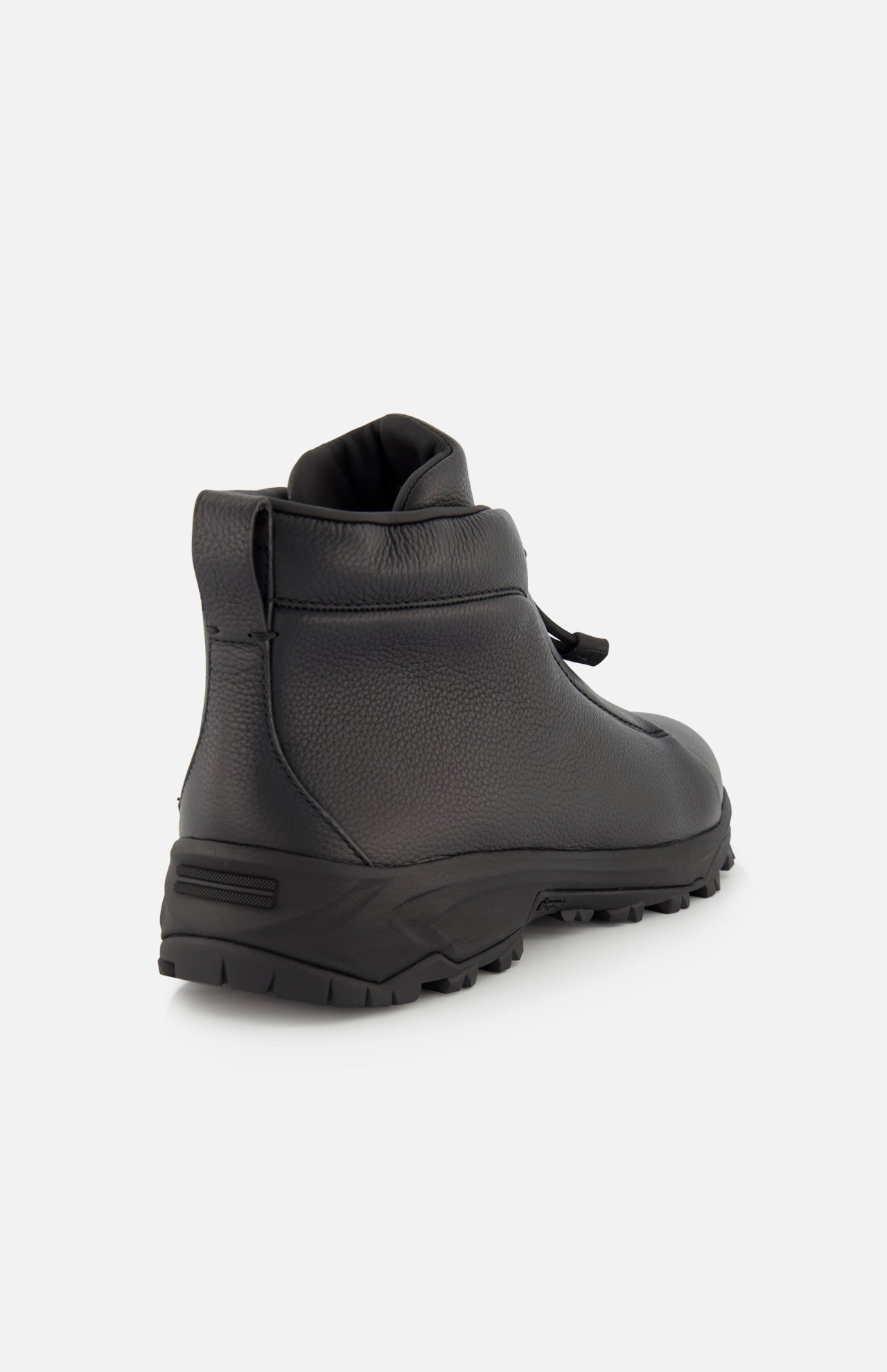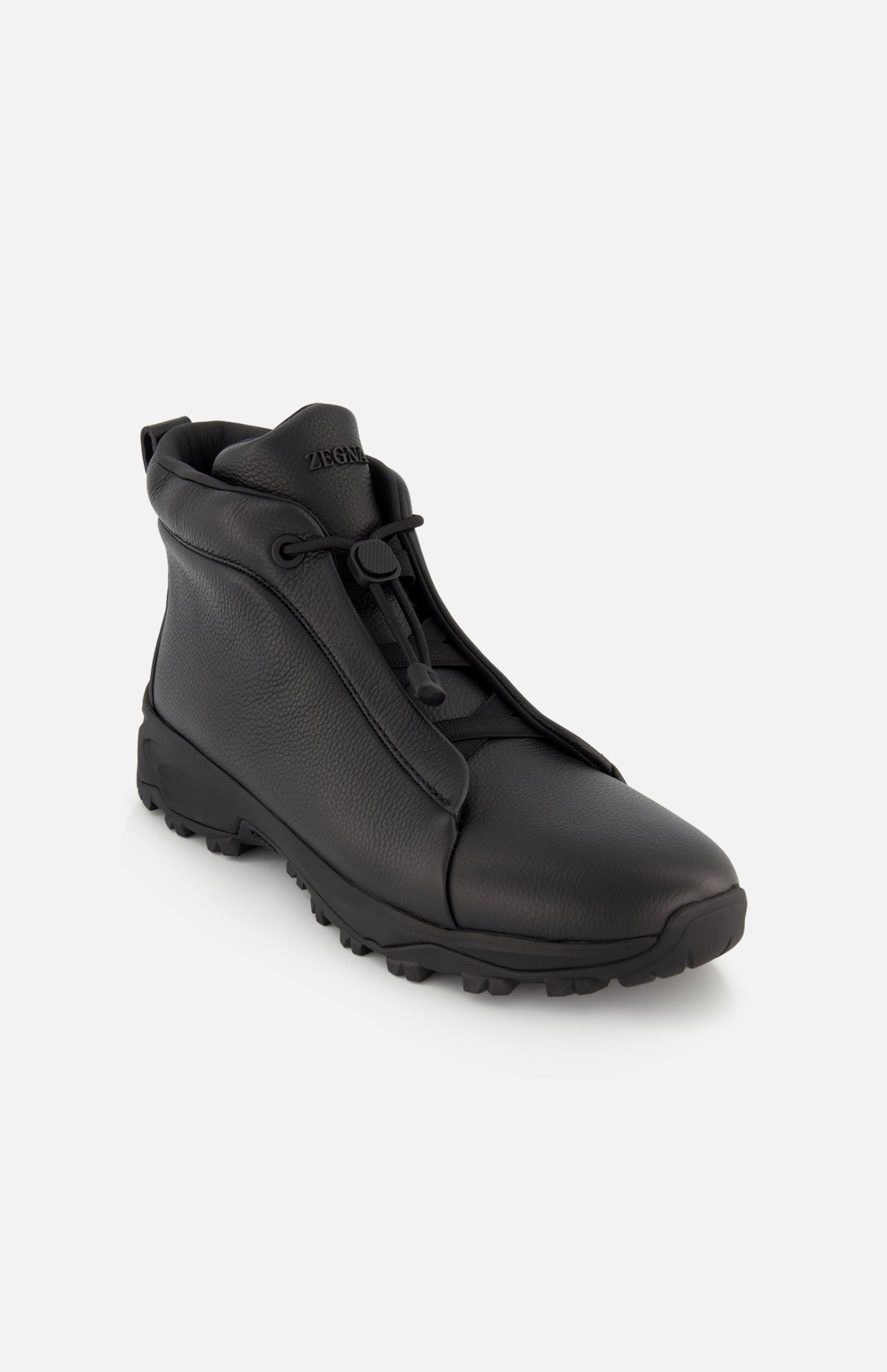 The Triple Stitch sneaker is a showpiece in your shoe collection. This is a flexible design that puts a luxurious spin on casual footwear for fast-paced lifestyles. This black leather option slips on easily thanks to the collection's iconic, triple-crossed elastics with the addition of a drawcord. This is a high-top version of the brand’s signature style with an aggressive tread at the outsole for a sturdy durability.