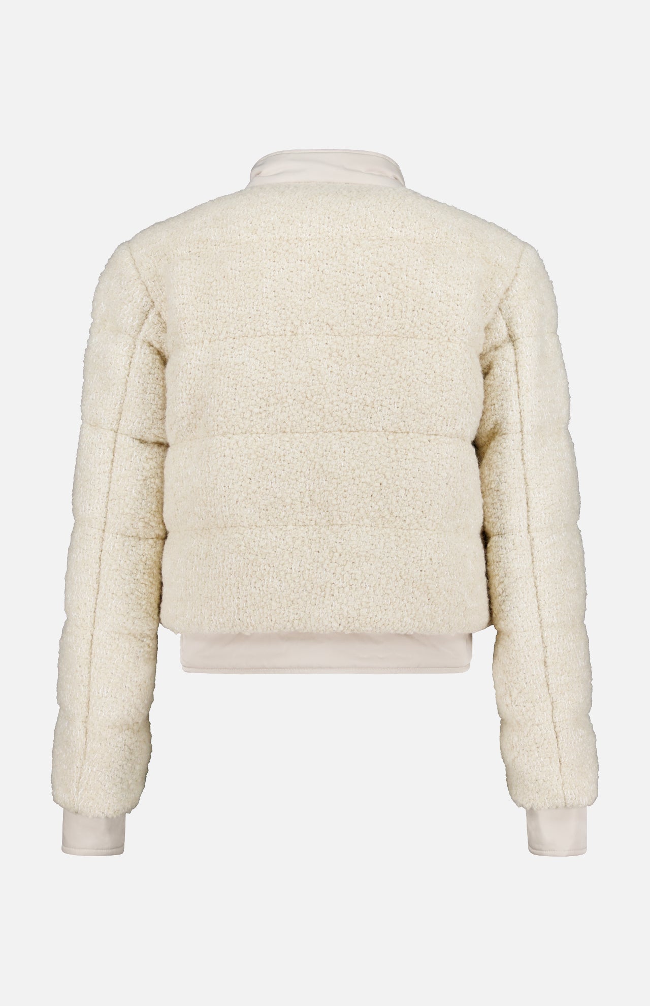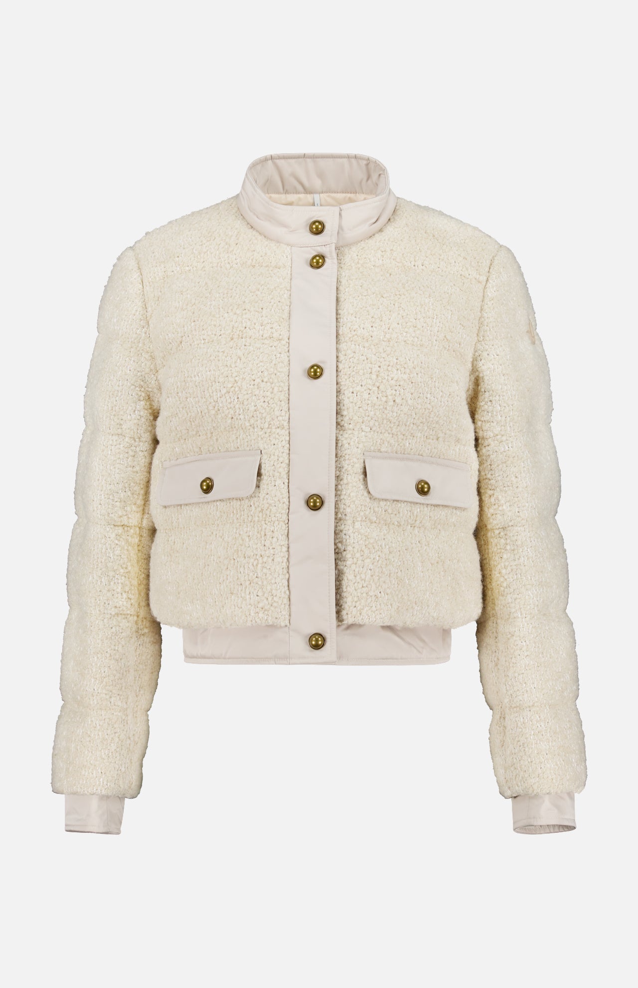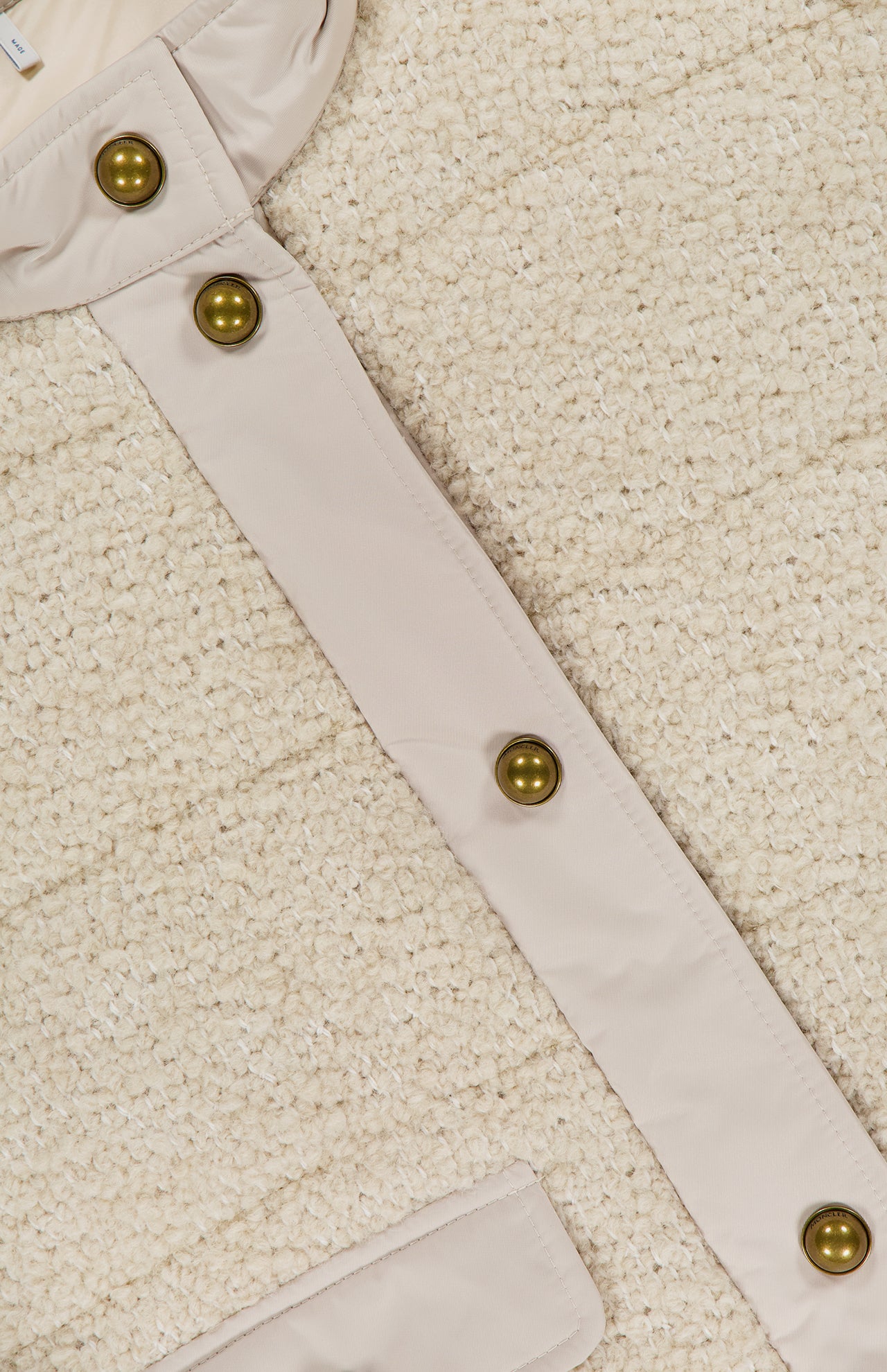 Guided by the motto, “born in the mountains, living in the city,” Moncler infuses outerwear with high-performance attributes for life’s everyday expeditions. This off-white down jacket offers an elevated version of outerwear in a shorter silhouette. Crafted from wool-blend bouclé, this fabric has a three-dimensional texture and plush feel. A contrasting trim in smooth gabardine and bronze dome buttons complete the look.