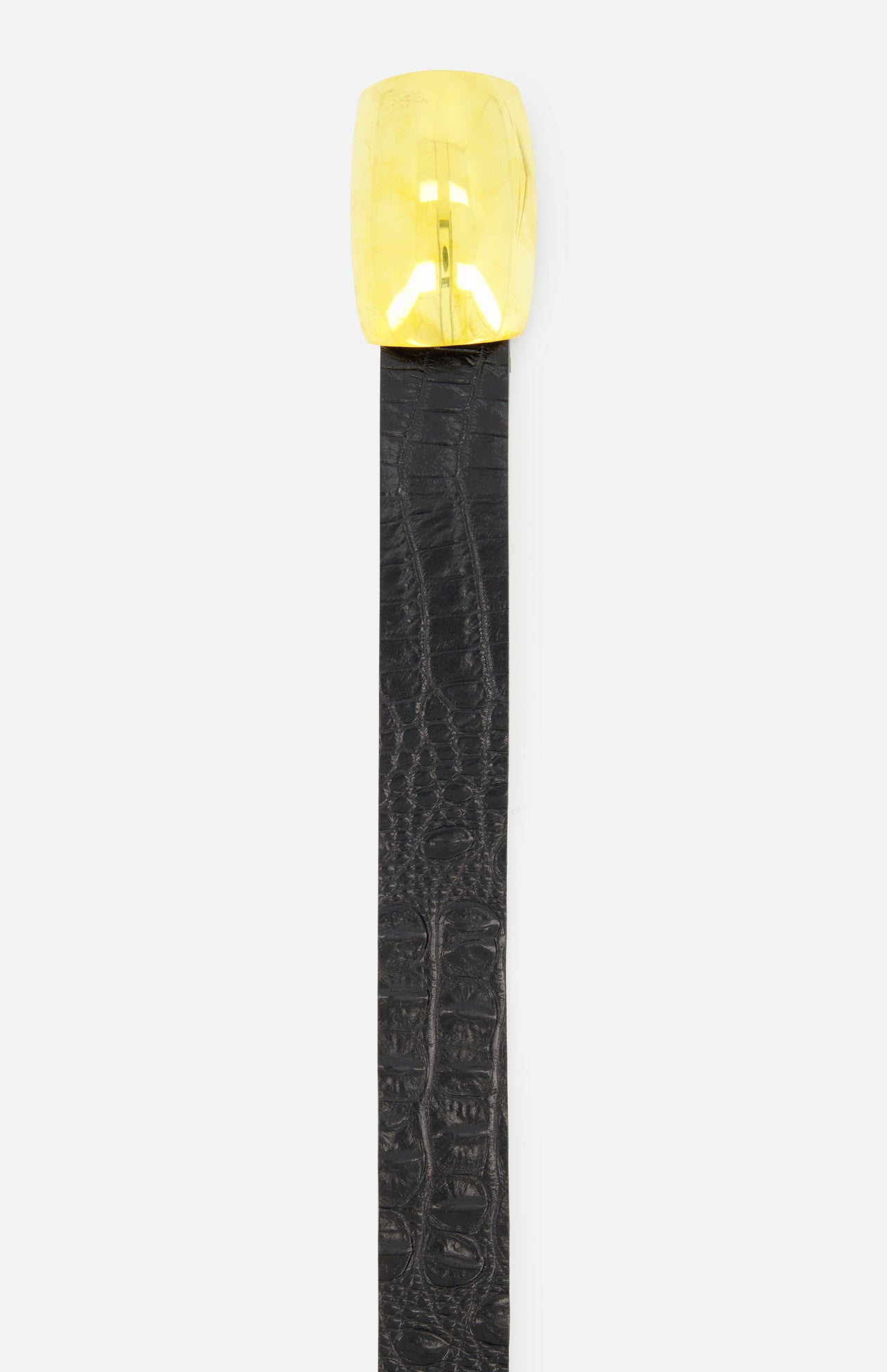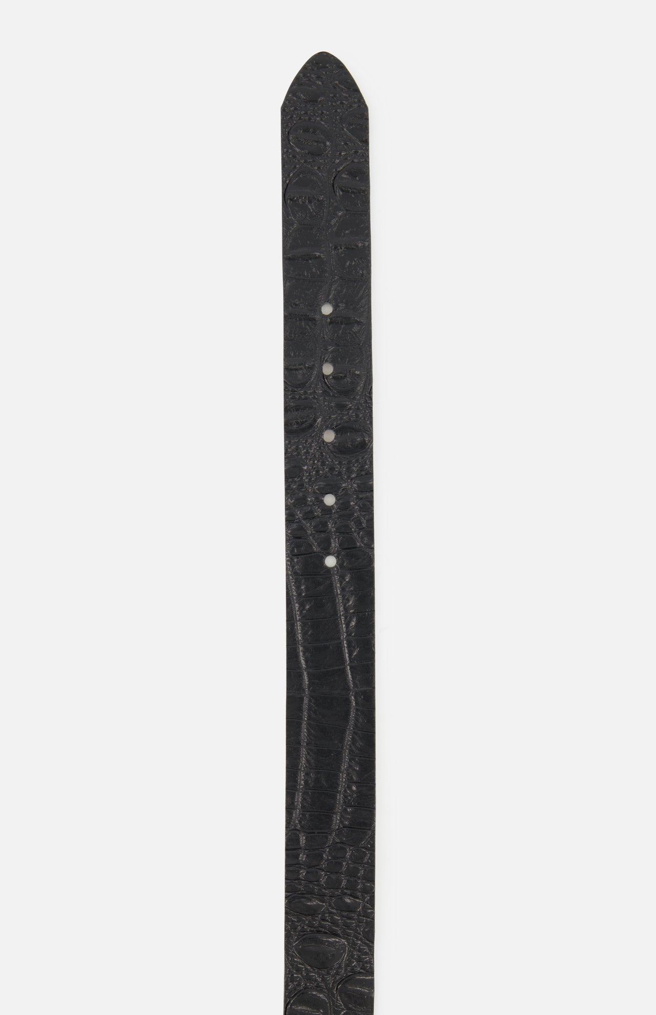 This black, croc-embossed belt is a stunning accessory that helps define your waist and add extra sophistication. A domed brass buckle adds depth and shine. Think your outfit is good alone? Make it great with this animal print option.