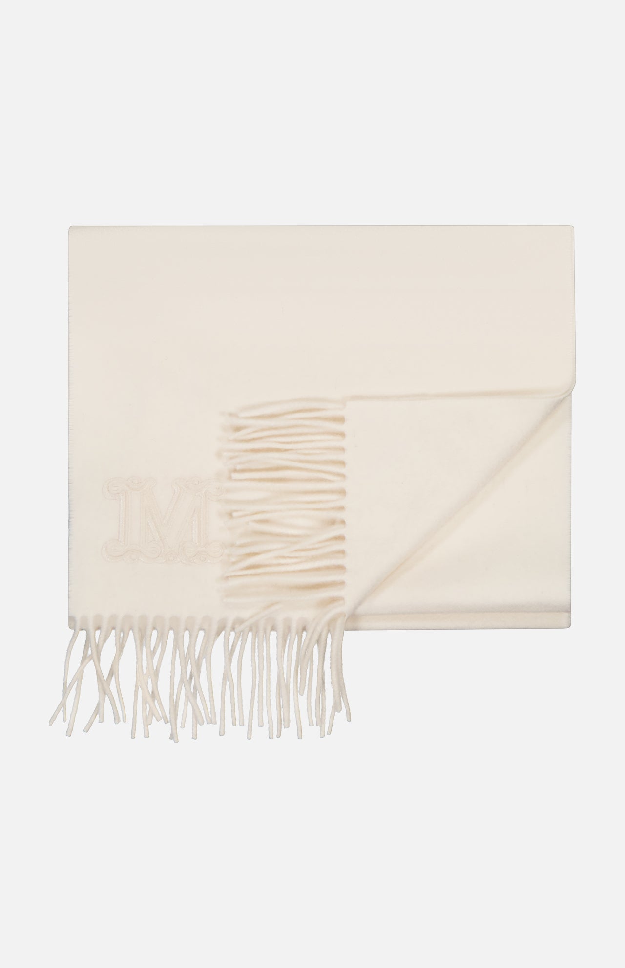 Warmth where you need it. Let this warm and cozy off-white scarf adorn your neckline for a luxurious look. Indulgent yet practical for cold weather, this soft cashmere option is crafted with long fringe trim and a brand monogram. Throw it over your coat for a morning commute that just got way more exciting.