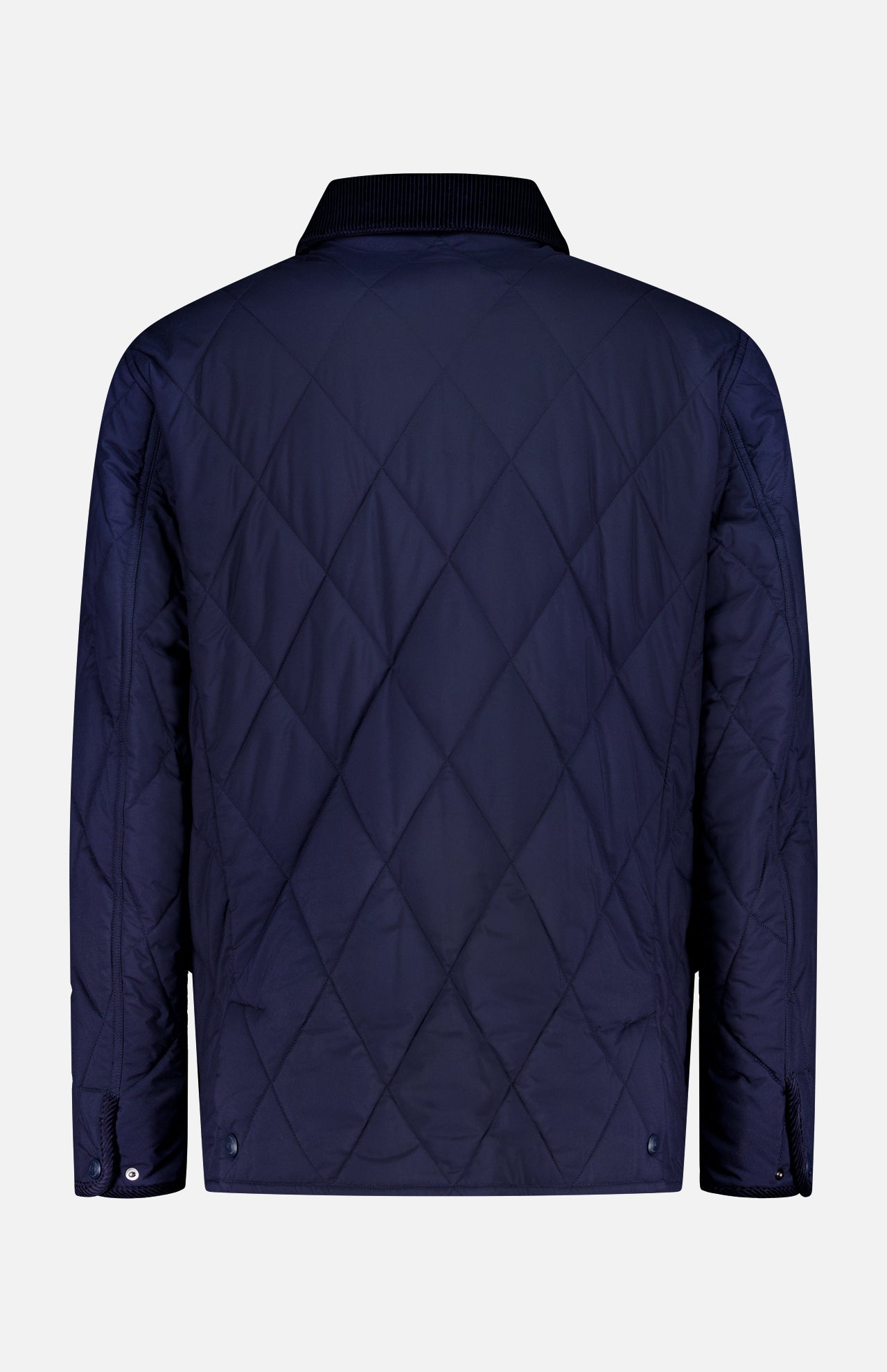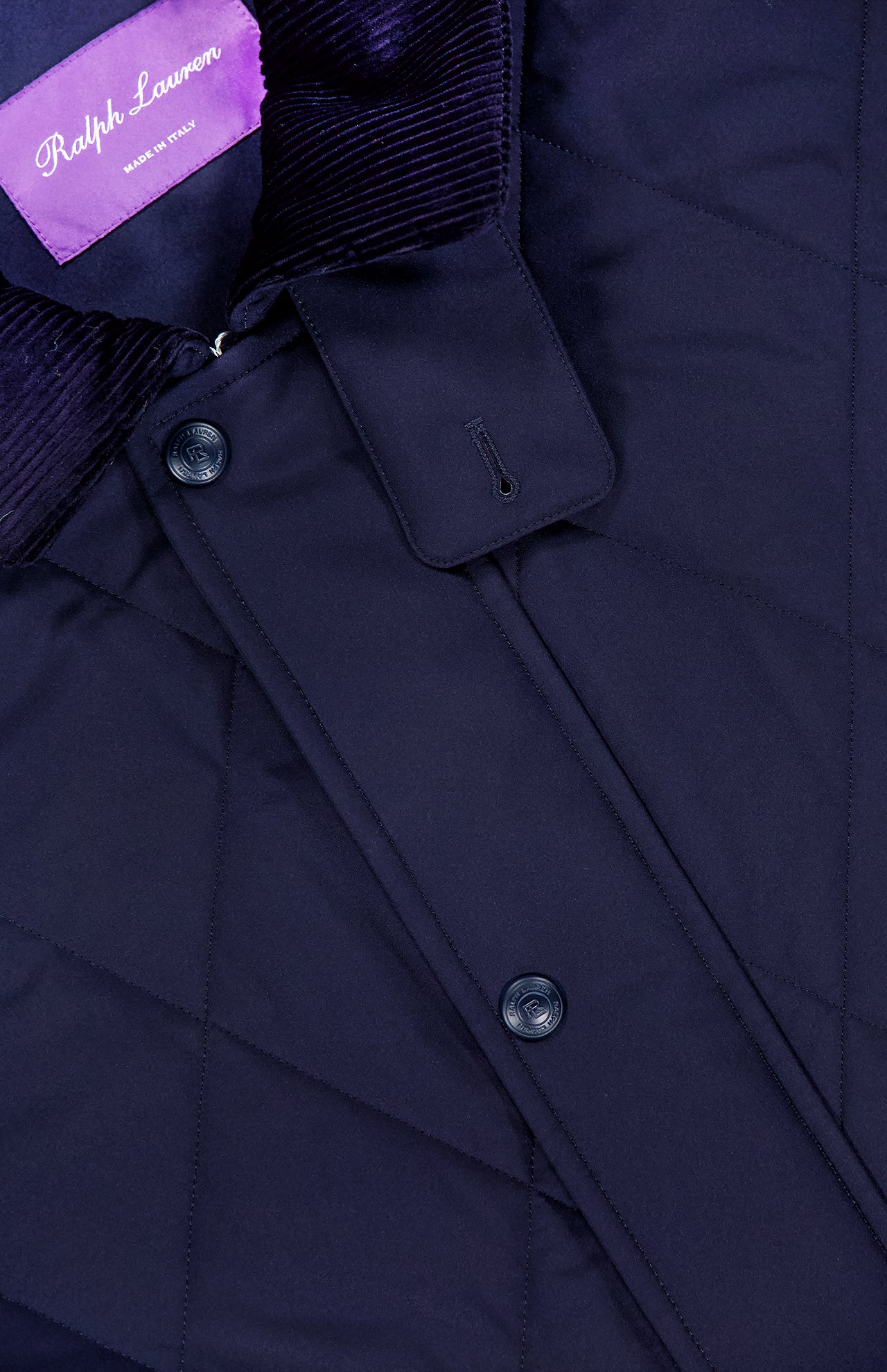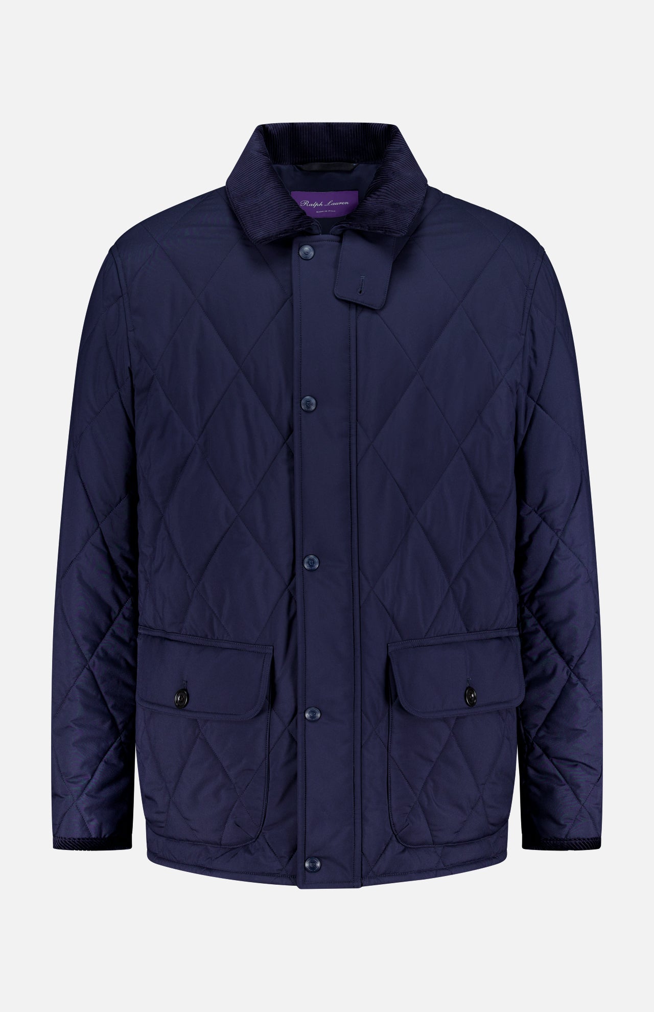 This classic barn coat in navy is elevated with expert Italian craftsmanship and thoughtfully considered details. Special attractions include a suede Ralph Lauren debossed collar stand, diamond quilting and soft Italian corduroy finishes at the collar and cuffs. This piece is insulated with an innovative down fabric, which maintains the garment's slim profile while providing ample warmth.