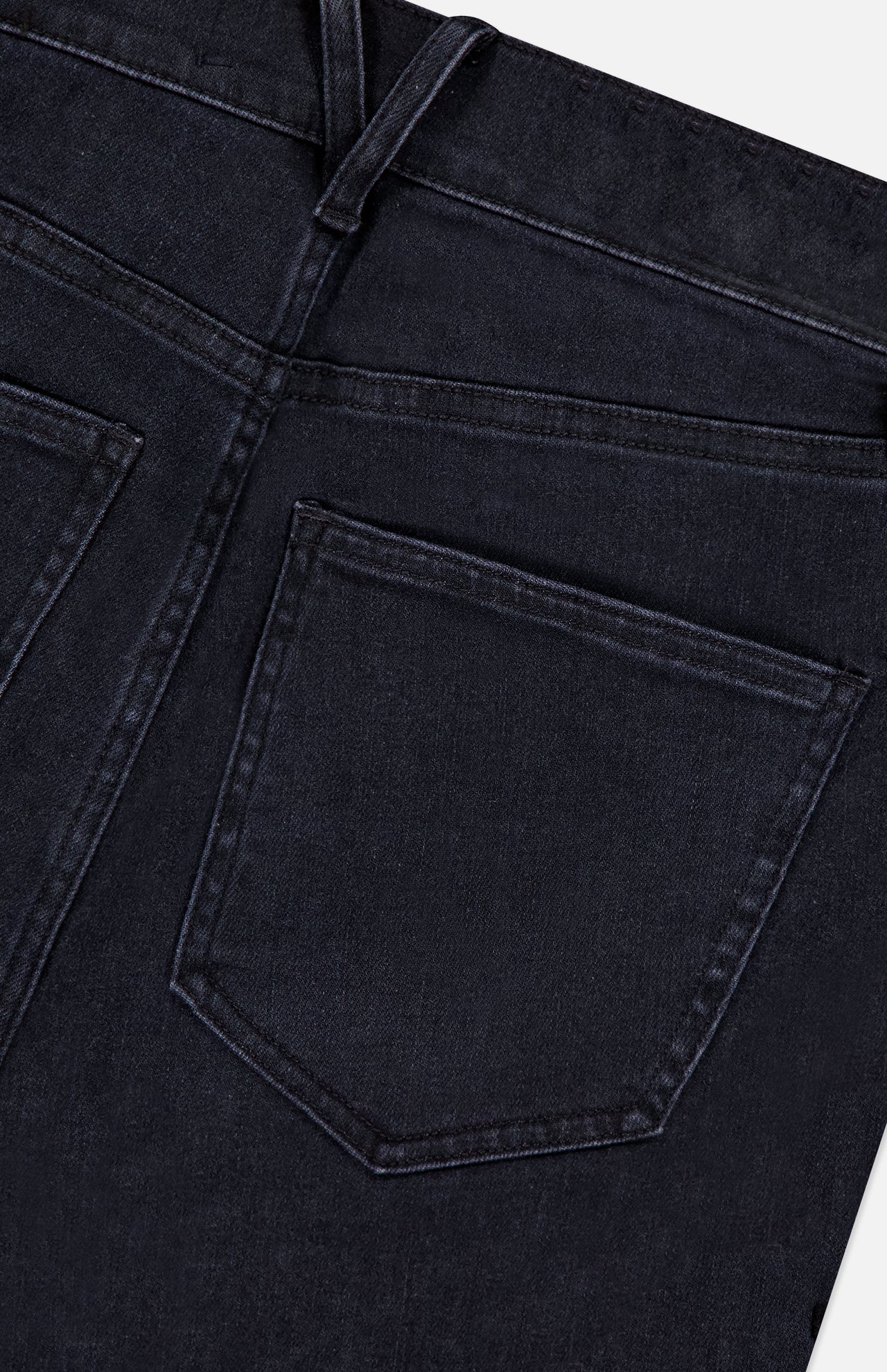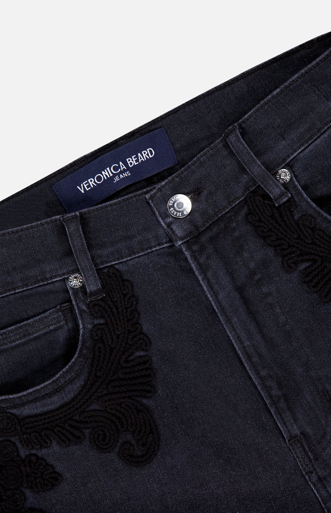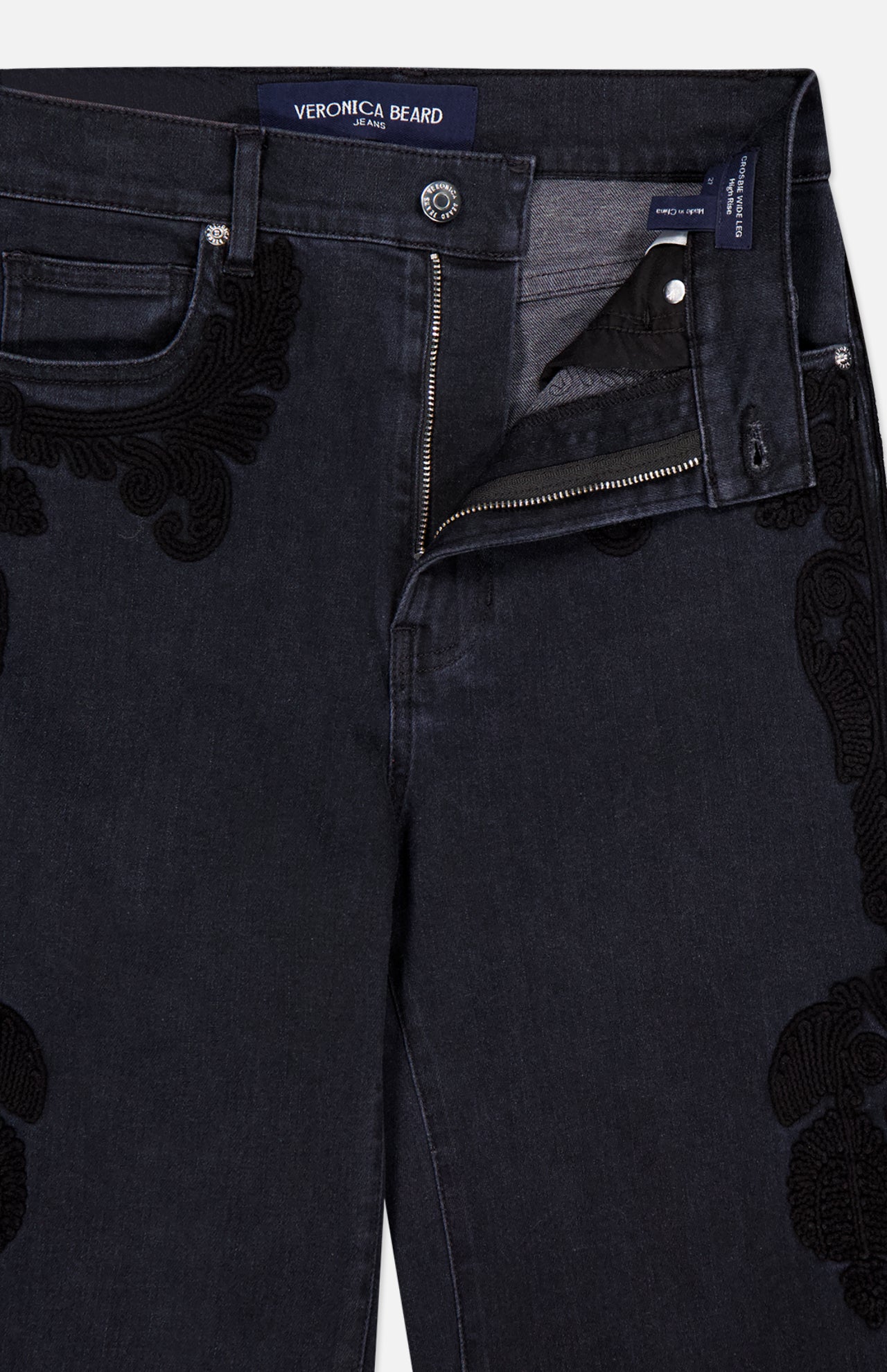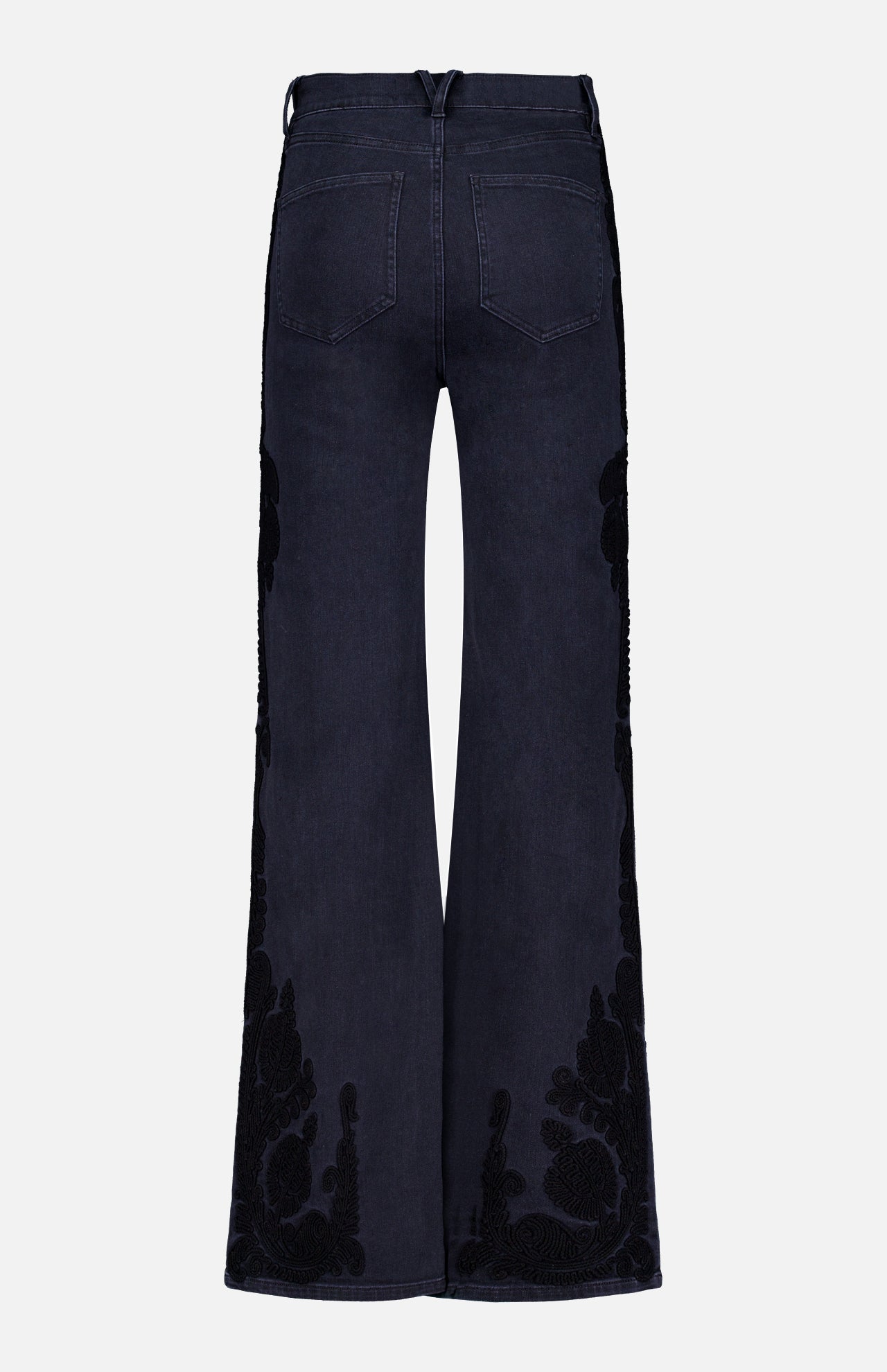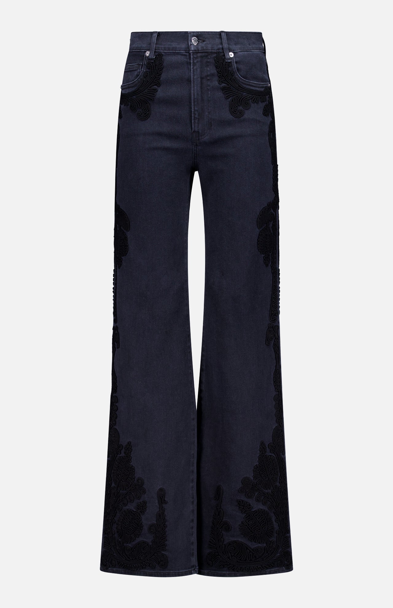 Here’s your Saturday night look. Crafted from super-stretch Turkish denim, these dark grey pants feature playful paisley embroidery along the side of the leg. This jean is fitted through the hips and thighs with a high rise and slimmed out, wide-leg silhouette. It’s an elevated take on casual-chic and pairs well with a simple t-shirt and heels.