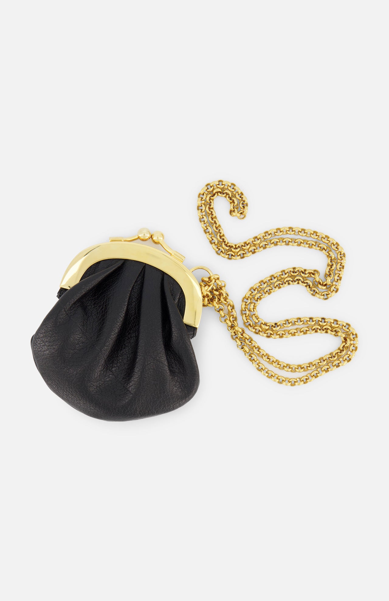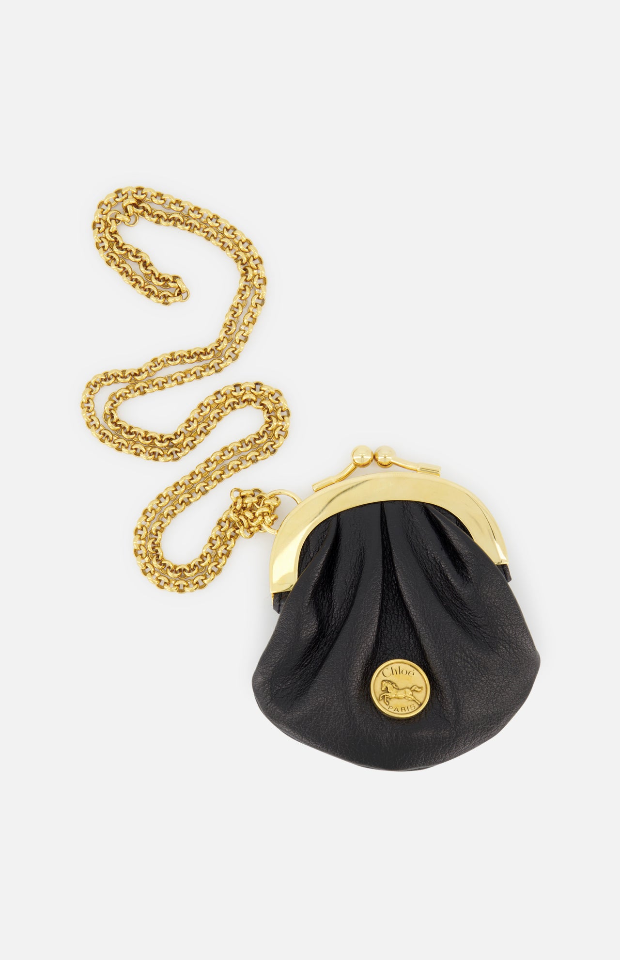 Mini purses move over. This micro coin purse is crafted in black grained buffalo leather with a gold-tone clasp and a removable necklace chain strap. The front is embellished with the Maison's iconic medal featuring an embossed image of a galloping horse and a Chloé Paris logo engraving. Carry it by hand or wear it on your shoulder. This one is for the girls that love their accessories on a small scale.