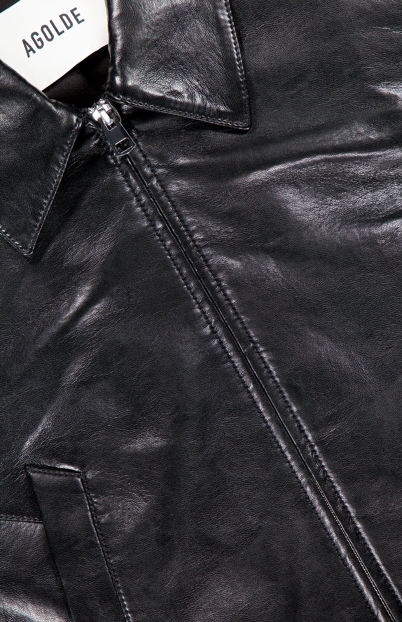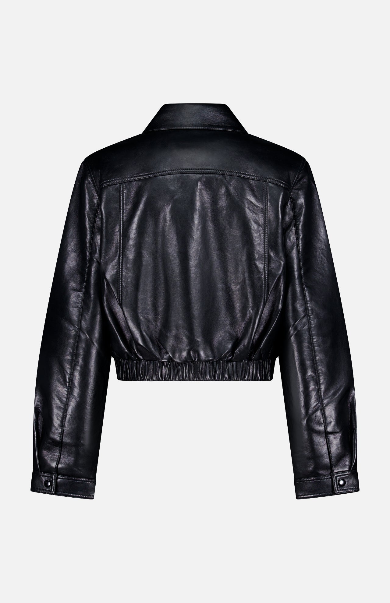 Part of the cool-girl starter kit, this black jacket is crafted from buttery recycled leather and boasts a modern, cropped silhouette. It’s sleek and sexy with clean lines, subtle seaming and a gathered hem. Let it add structure to relaxed denim or soften tailored separates. She's a showstopper.