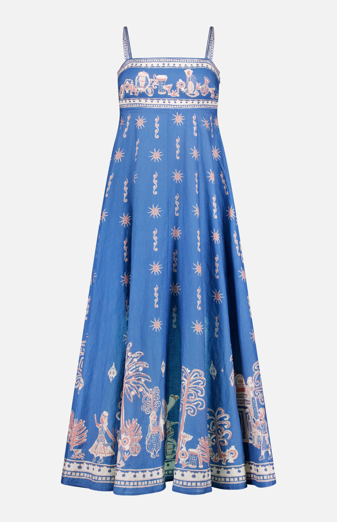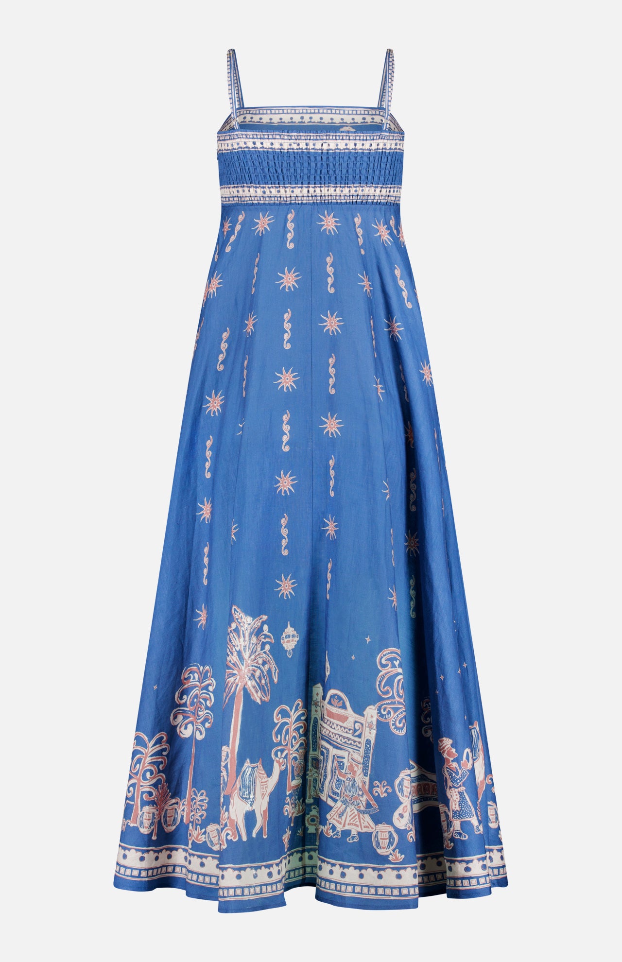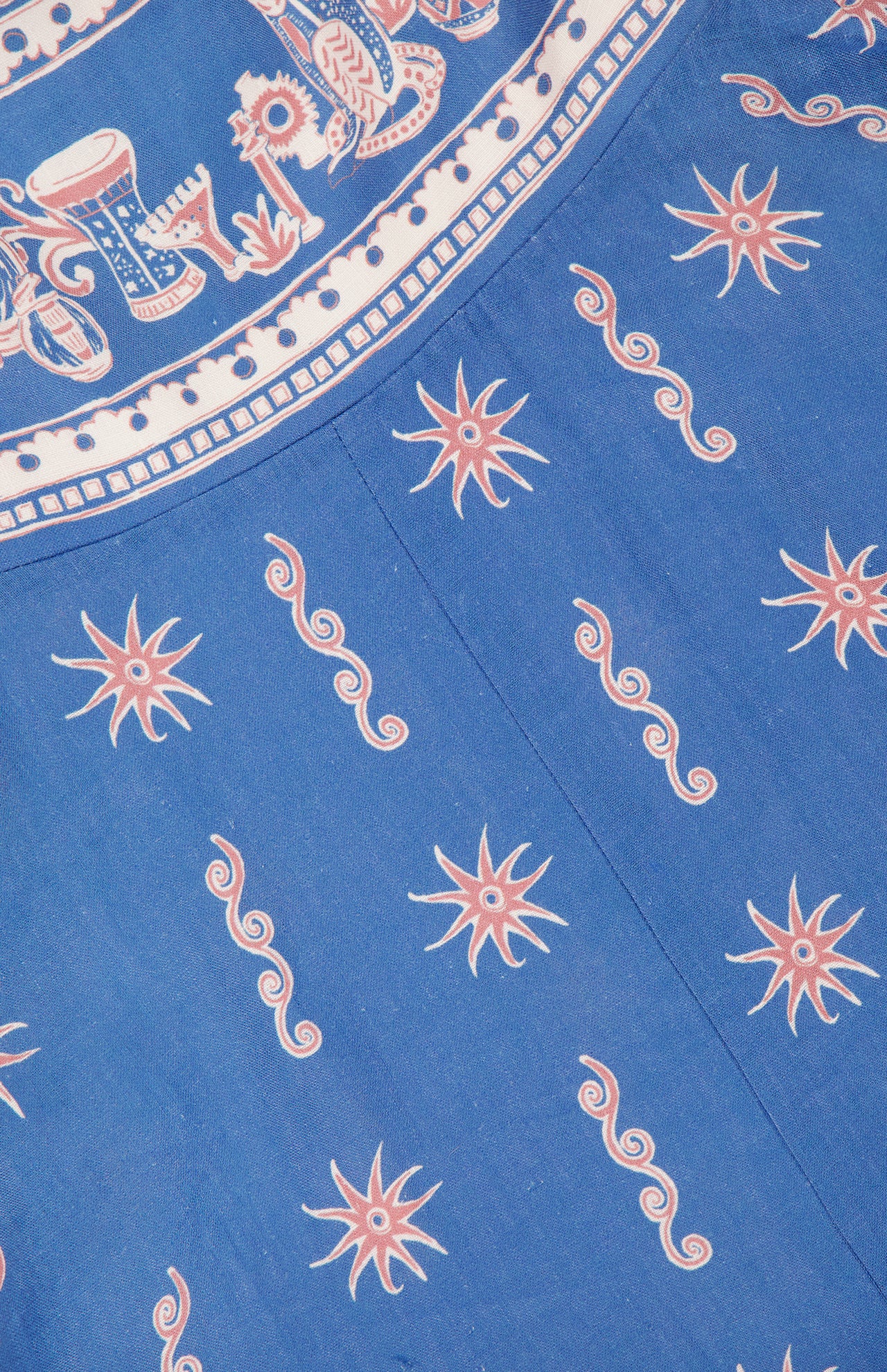 When vacationing, do it up. Pack this blue midi sundress for glamorous travel or for sunny days with nothing on the agenda. You’ll appreciate the adjustable straps and shirred back panel for a custom and comfortable fit. The intricate and exotic patterns look like a street scene with an artist selling their wares.