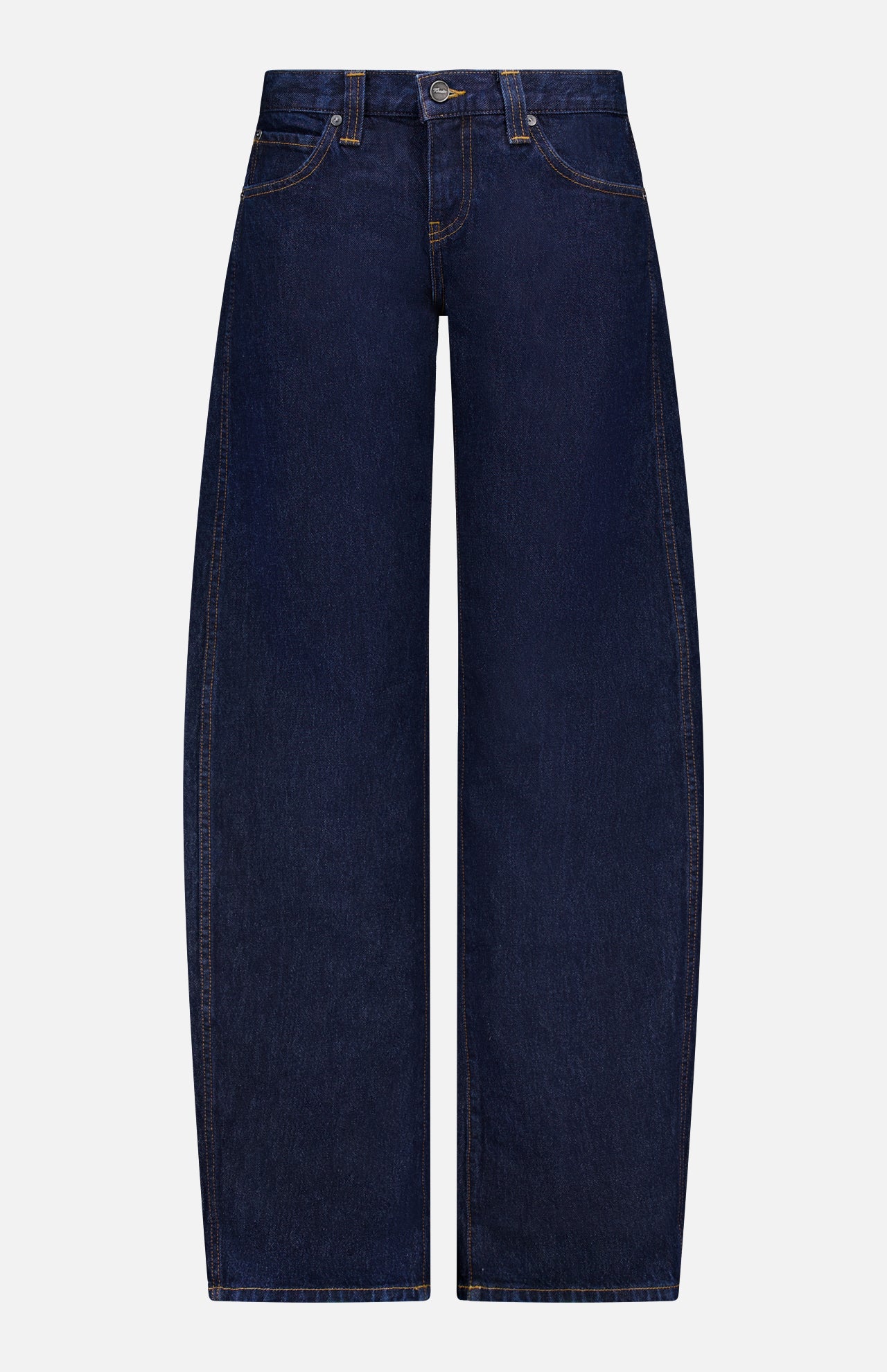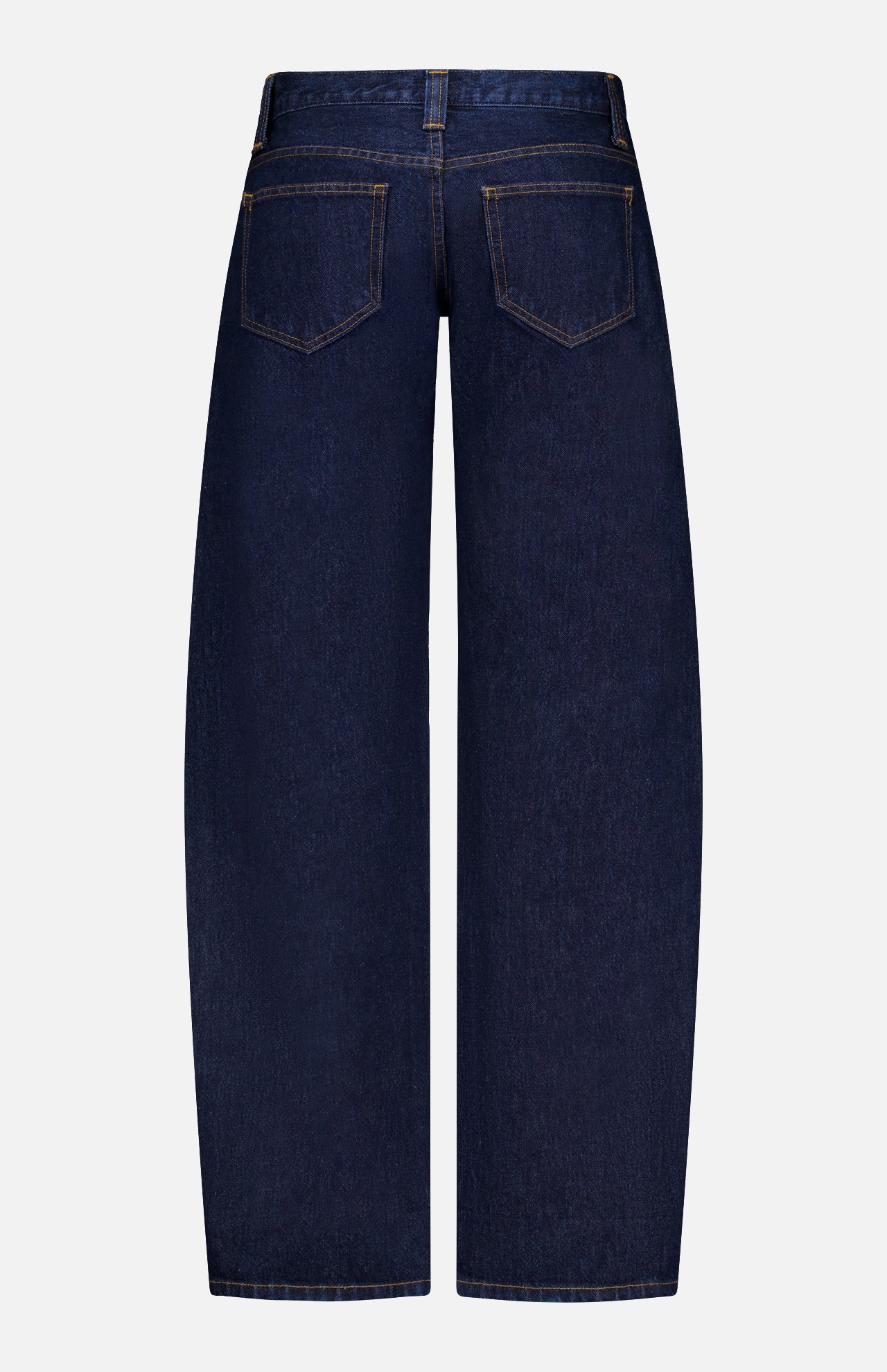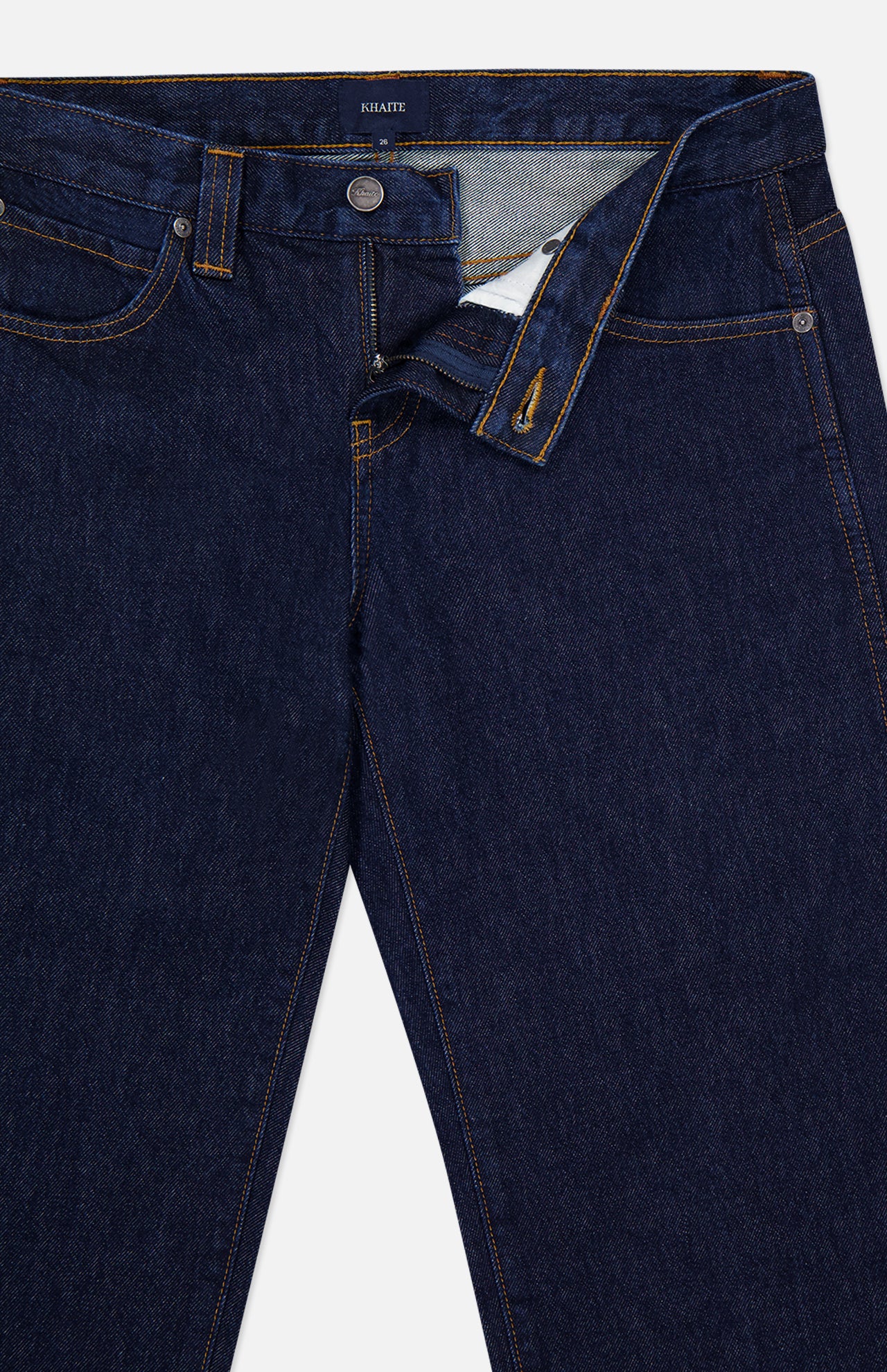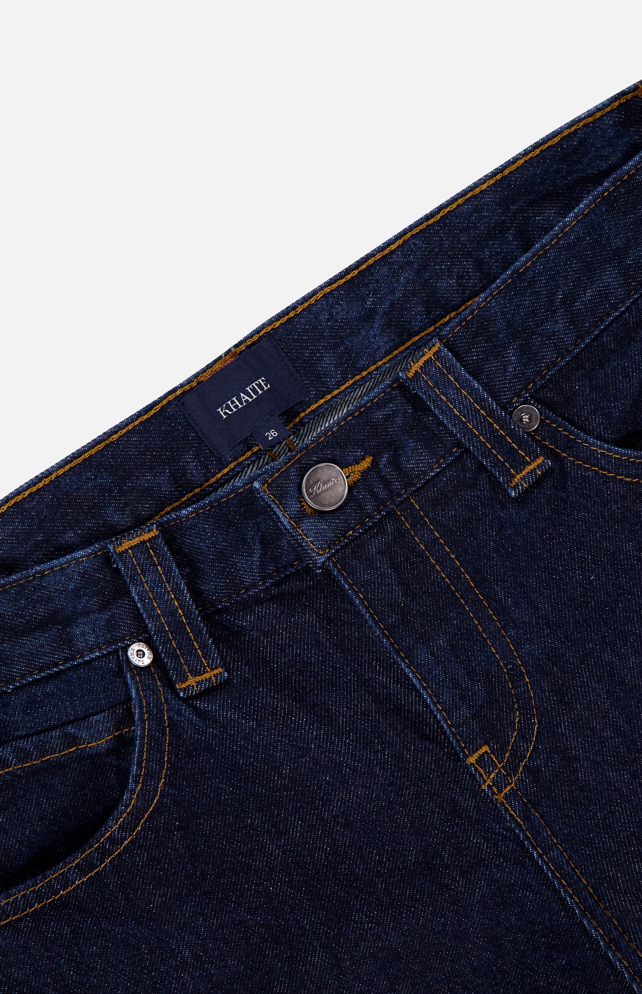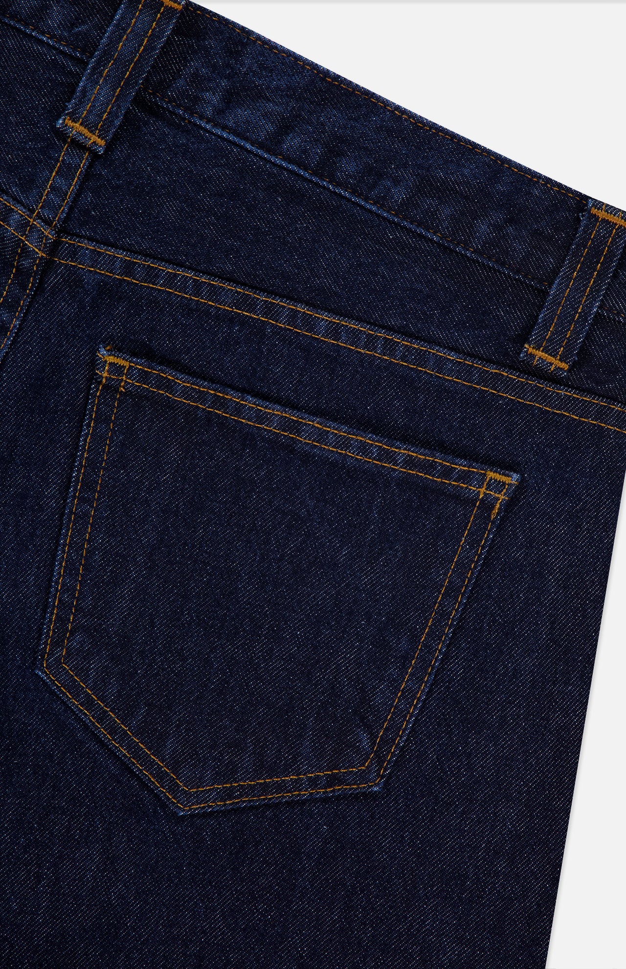 When only a minimalist wardrobe will do, these dark blue jeans are designed with a chic philosophy that’s instantly recognizable. A cuffed, low-rise style inspired by mid-century men's workwear, this option is designed to sit low on the hip. You’ll notice curved seams that create a bowed silhouette for a statement look. Each hand-finished pair has an embossed button of antiqued nickel.