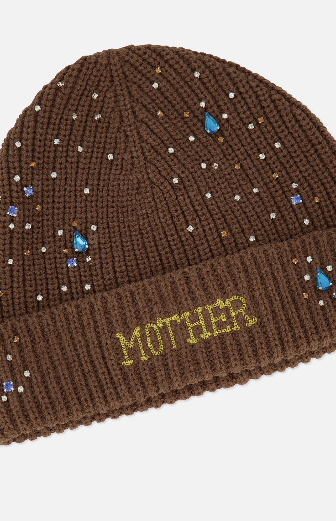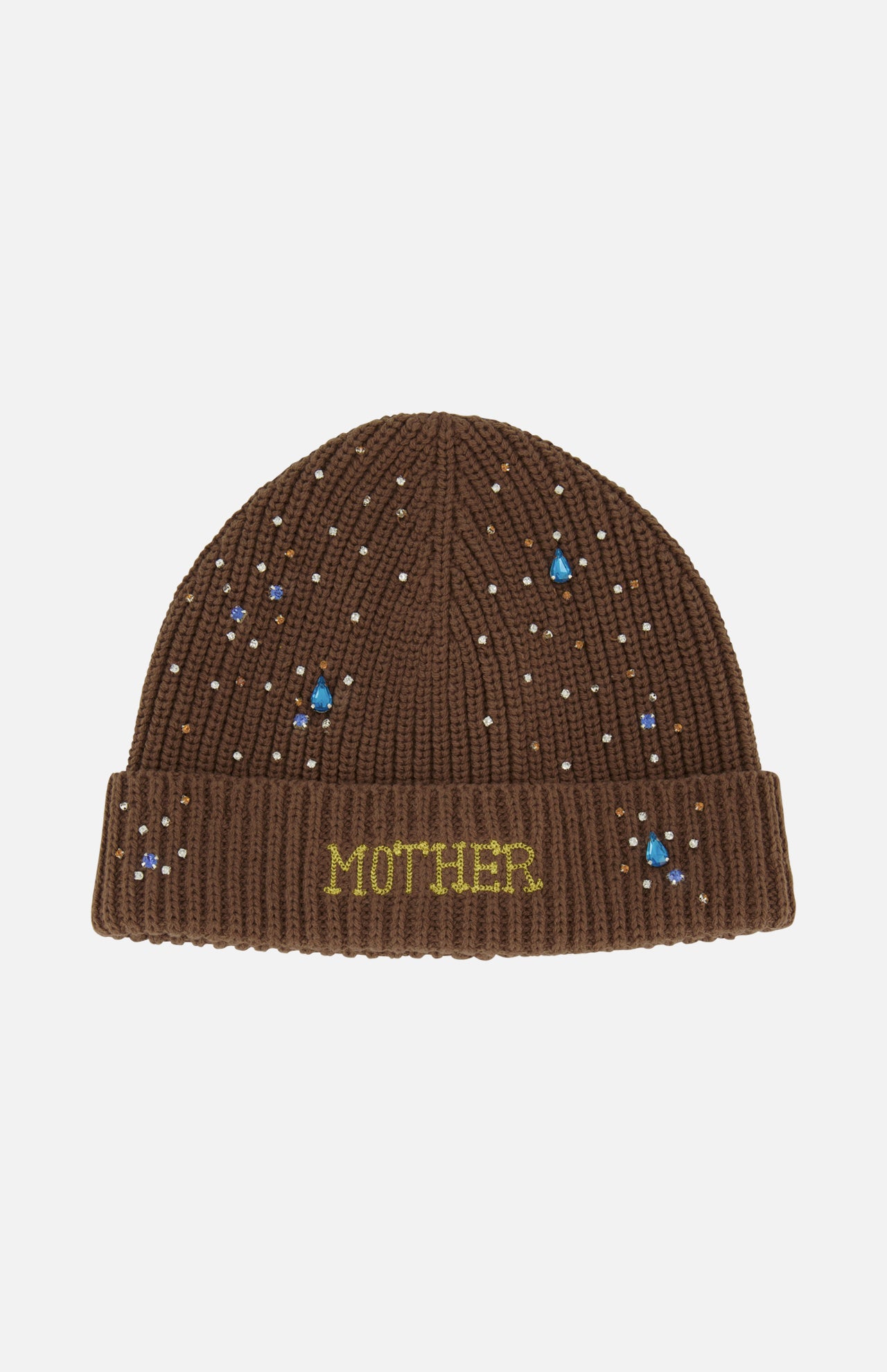 This chocolate brown ribbed beanie is designed with a folded hem and a cozy fit. It’s made from a cotton-blend with Mother embroidered in gold on the front. Beaded details throughout deliver shine and a quirky, artsy allure.