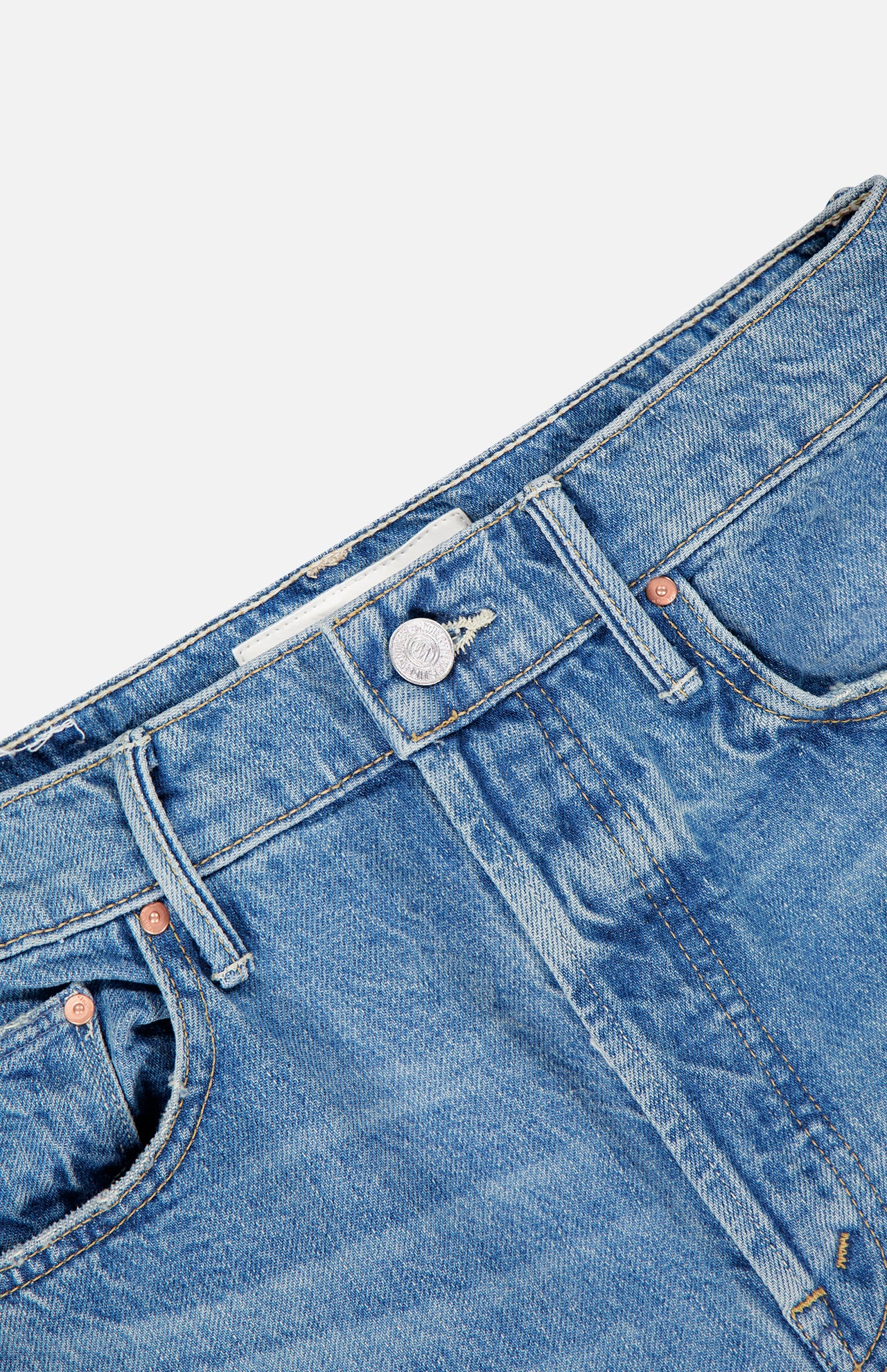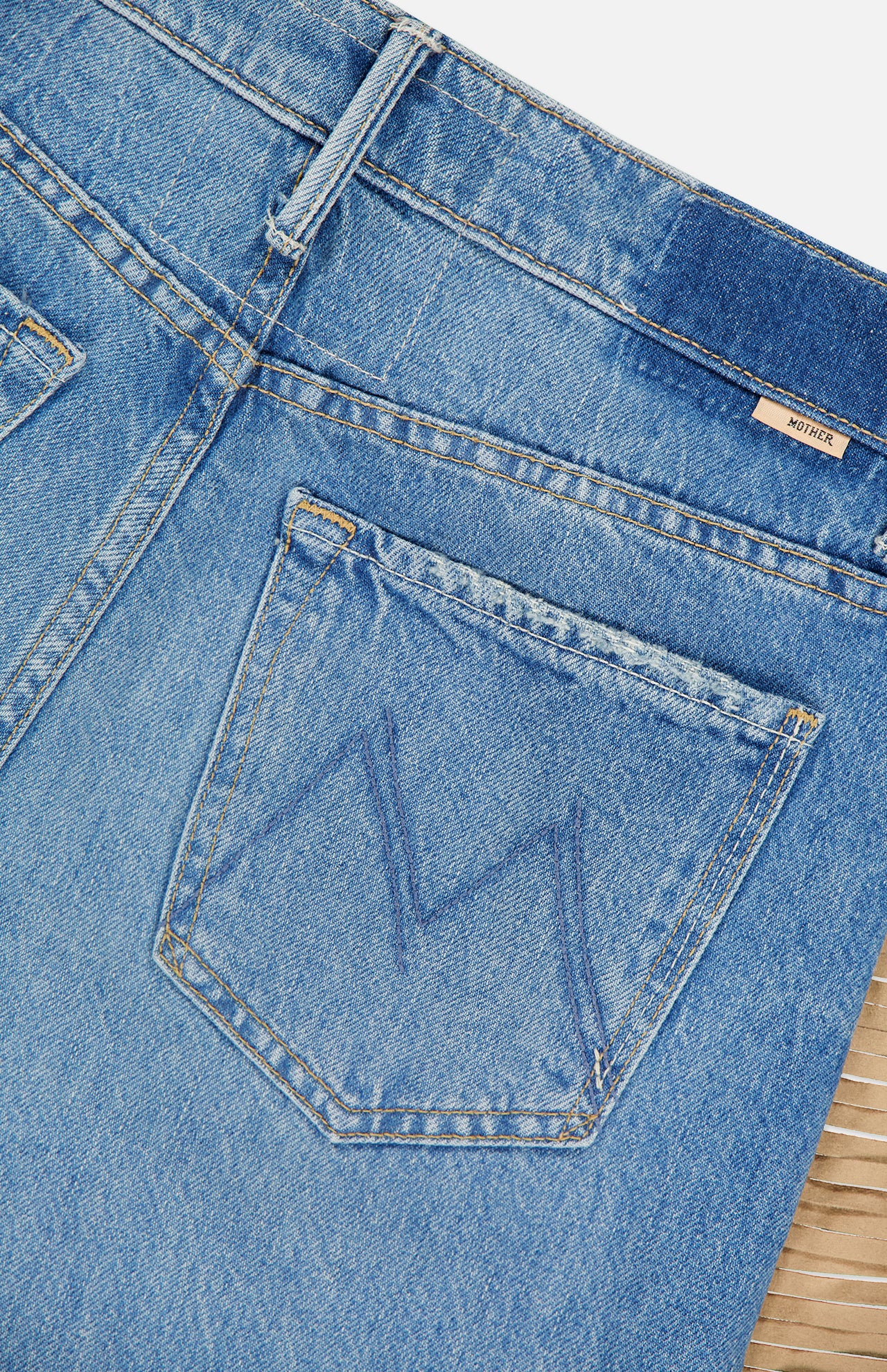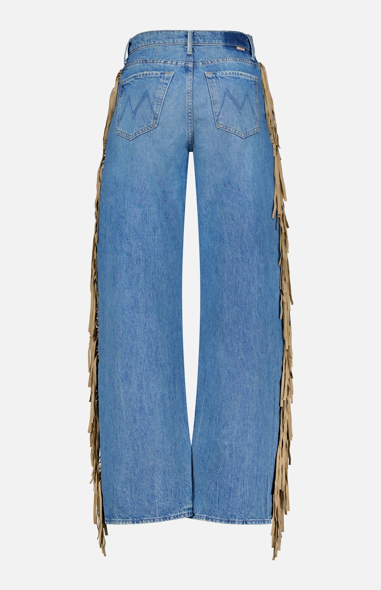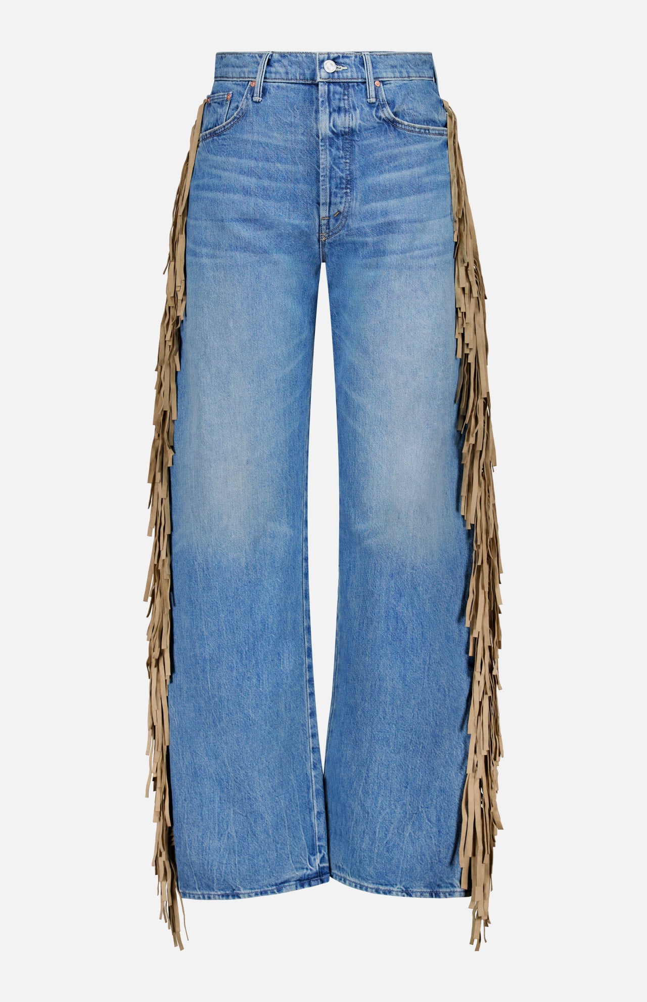 Giddy Up! This jean features a super high-waisted fit with a wide, curved leg. There’s a button fly closure and a long 32” inseam with a clean hem. Made from rigid denim, this style comes in a mid-blue wash with whiskering and fading at the knees. The signature detail comes in the faux-suede fringe down the outer seam.