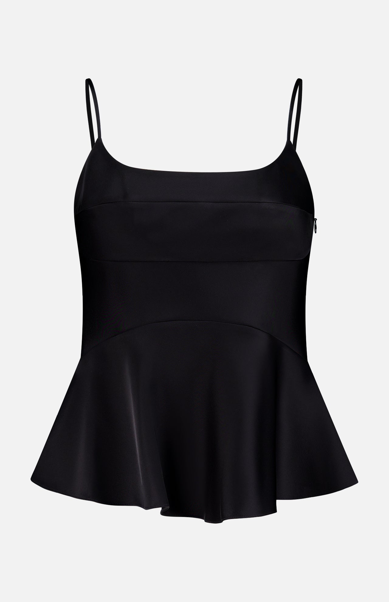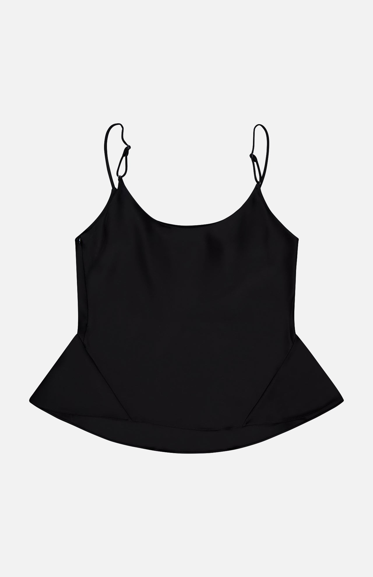 A simple classic, this black camisole is ultra-feminine and made for layering (but feel free to wear it solo). This satin top is accented with a flattering scoop neckline and sculpted seam details for a fitted shape. Pair with a black midi skirt and heels and you have an iconic party look that’s easy to assemble.