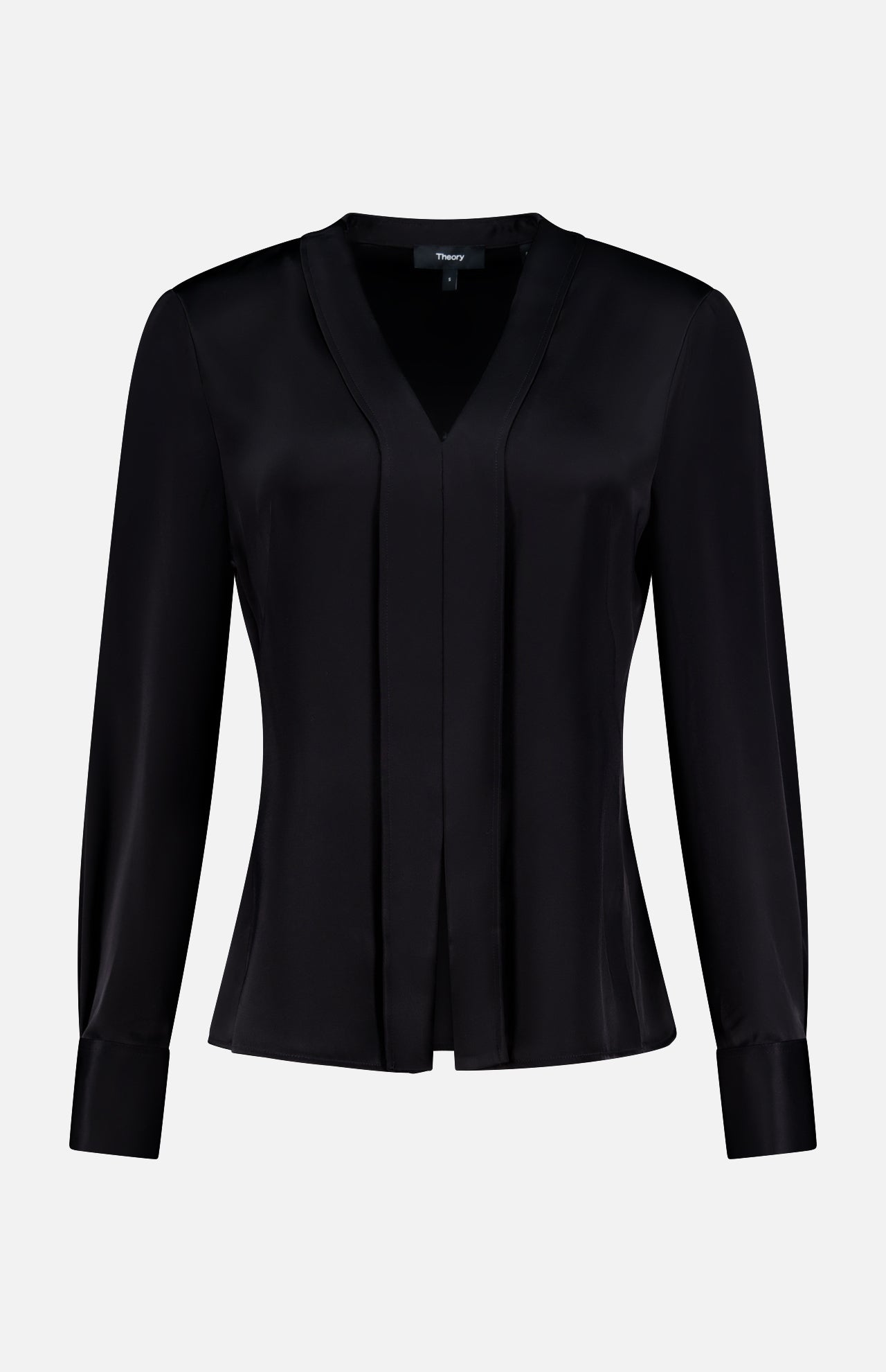 Look fancy with this black satin blouse that has major polish. It’s designed with a v-neckline and a binding detail at the neck and front seam. Streamlined and chic, this piece easily transitions from the office to after-hours parties.