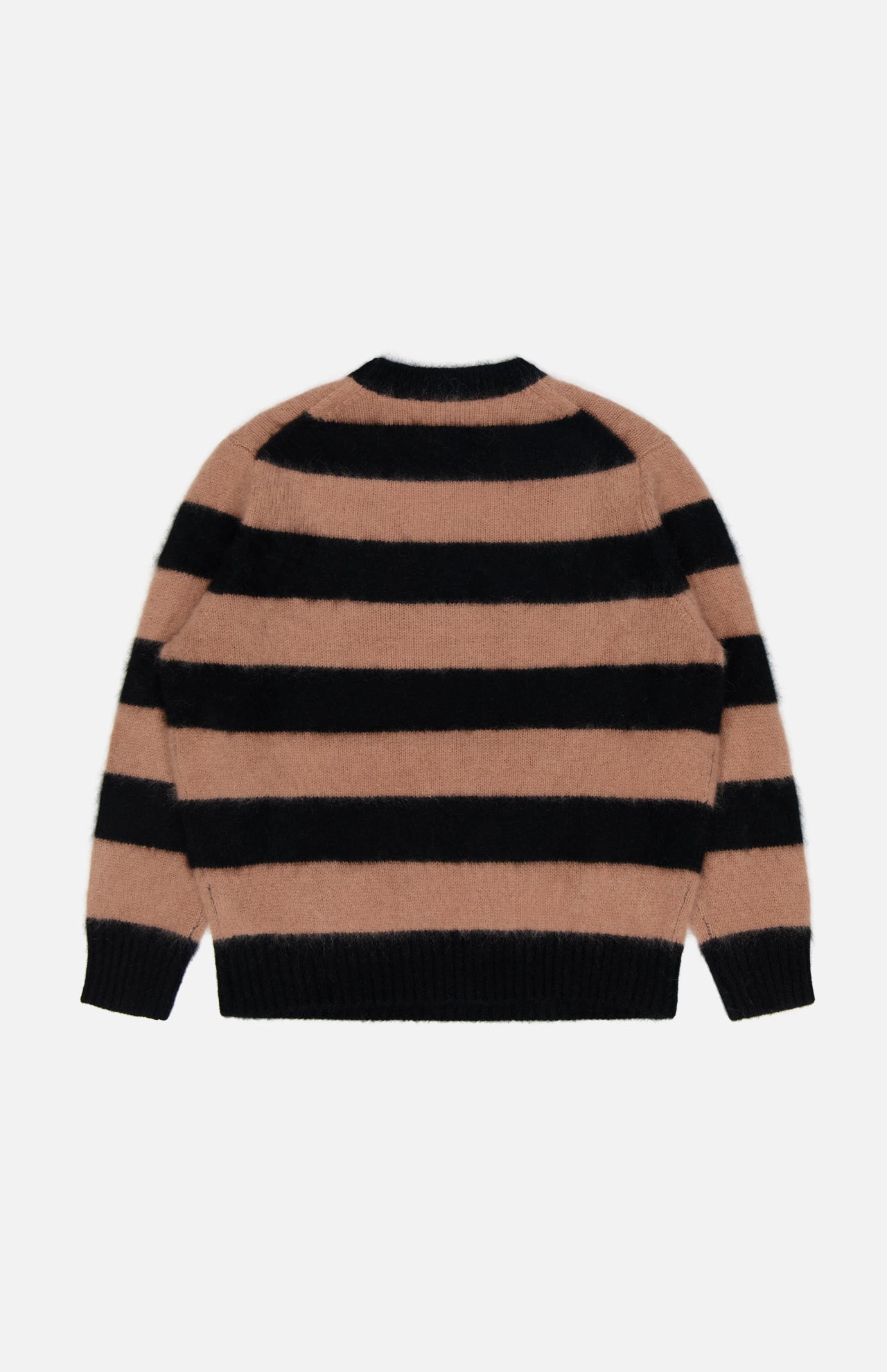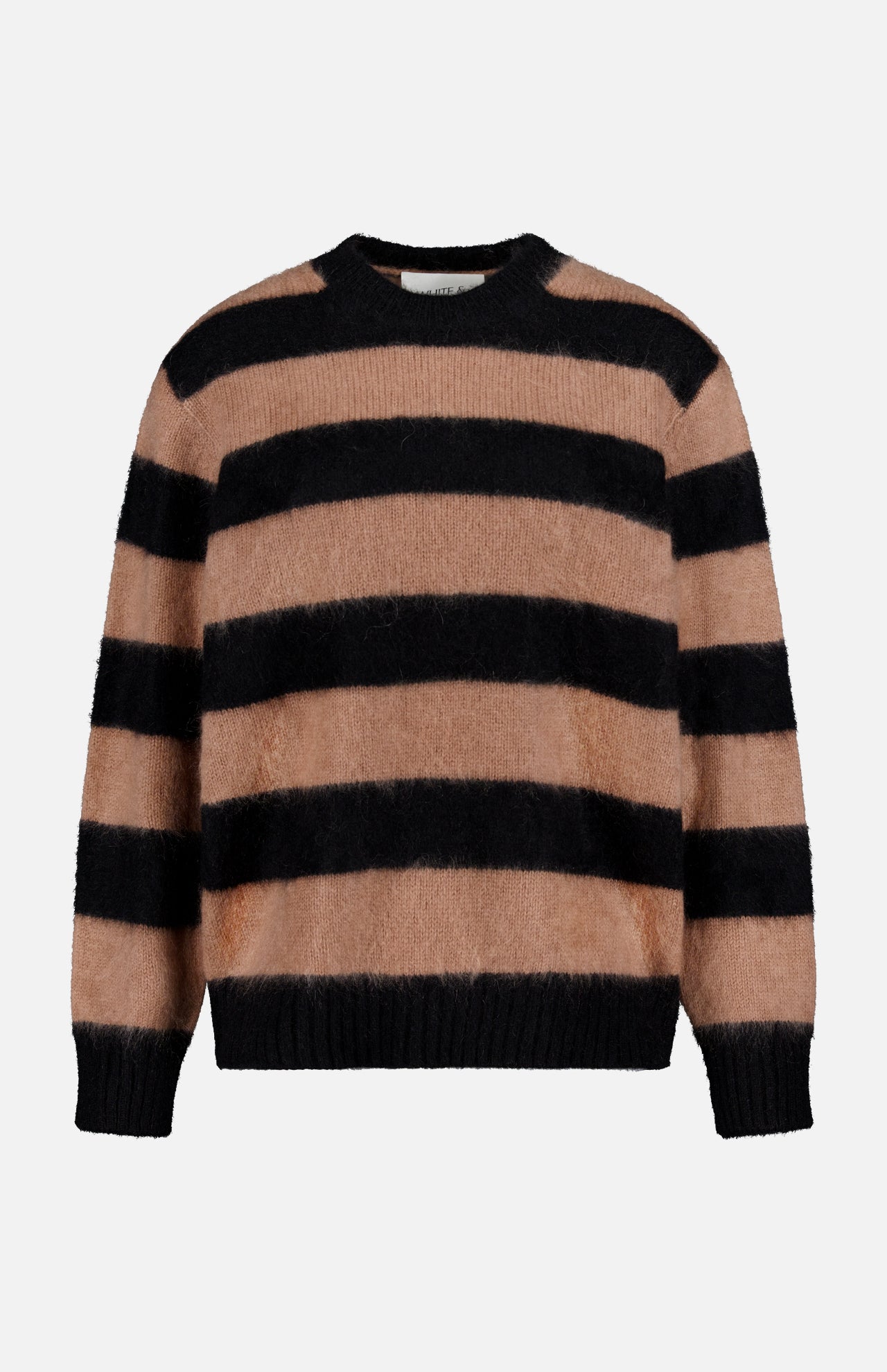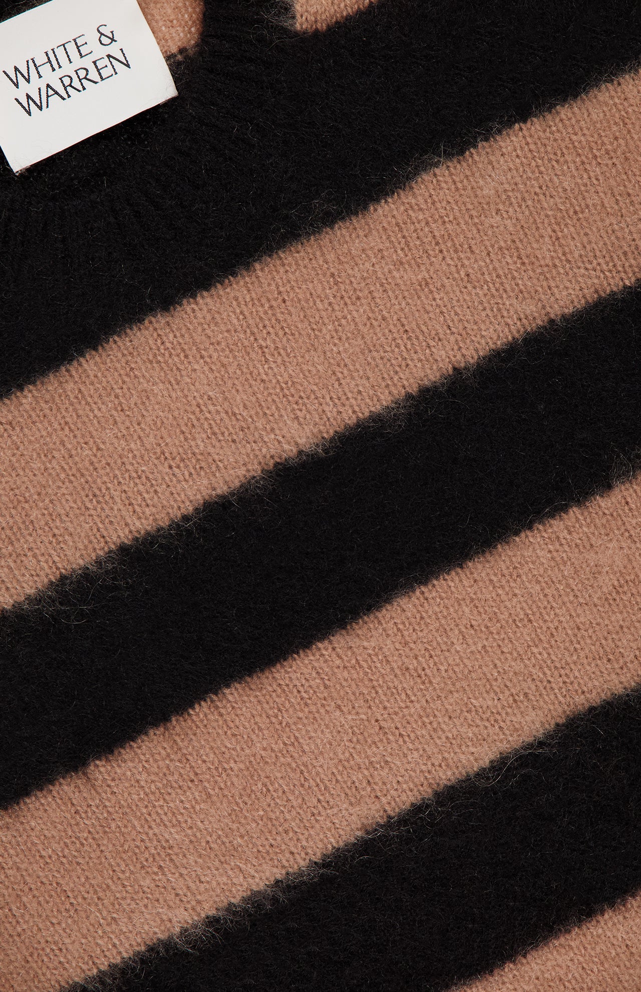 Assemble a cozy capsule wardrobe with this relaxed crew neck sweater. A desirable style, this pullover piece is crafted from 100% brushed cashmere for a luxuriously soft feel. Make a statement with bold and wide black and caramel stripes and style with denim on the weekends and trousers during office hours.