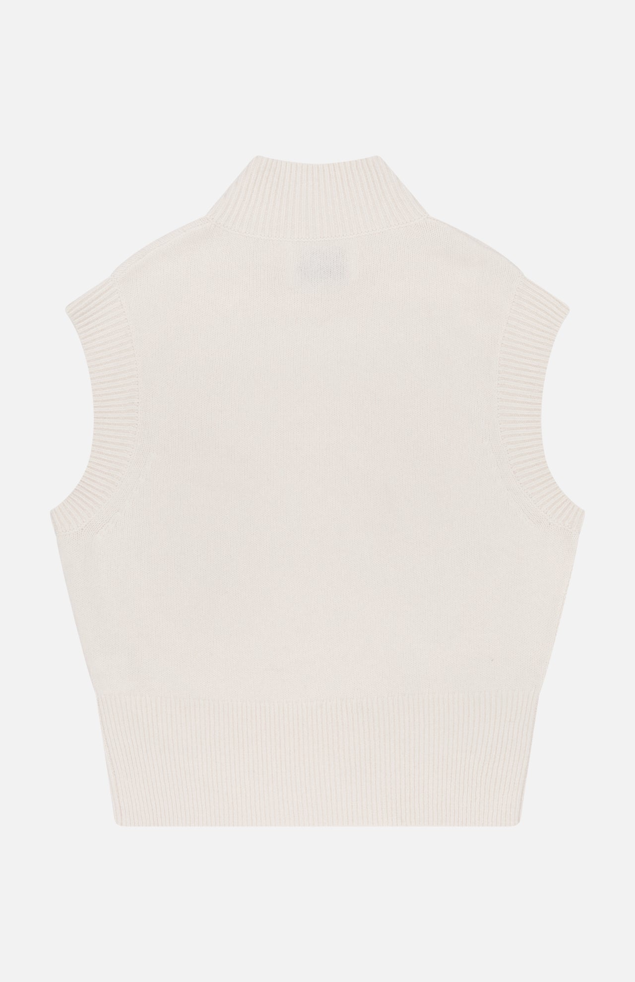 A wardrobe wonder, this sleeveless sweater comes in a soft, winter white hue for easy styling. The pure cashmere fabric offers warmth and a comfortable and soft wear. There’s a split mock neck detail and ribbed trims to finish off this chic and simplistic piece. Now, get to layering…