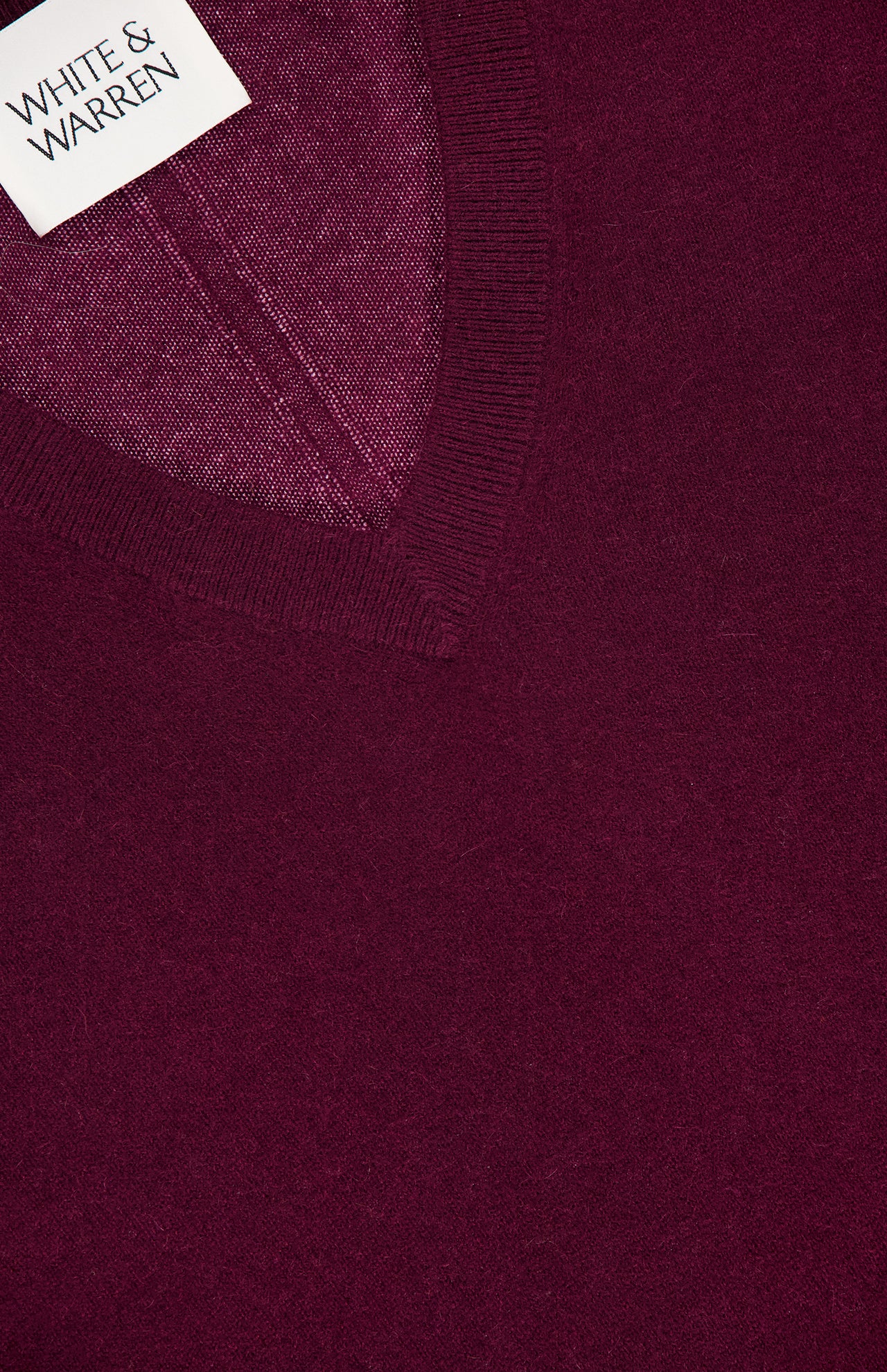 An effortless essential, this v-neck sweater comes in a rich sangria tone that’s made for fall and winter styling. Knit from 100% cashmere, this sweater is a flattering style that’s the definition of quiet luxury. This piece is relaxed with a longer length so size down for a slimmer fit.