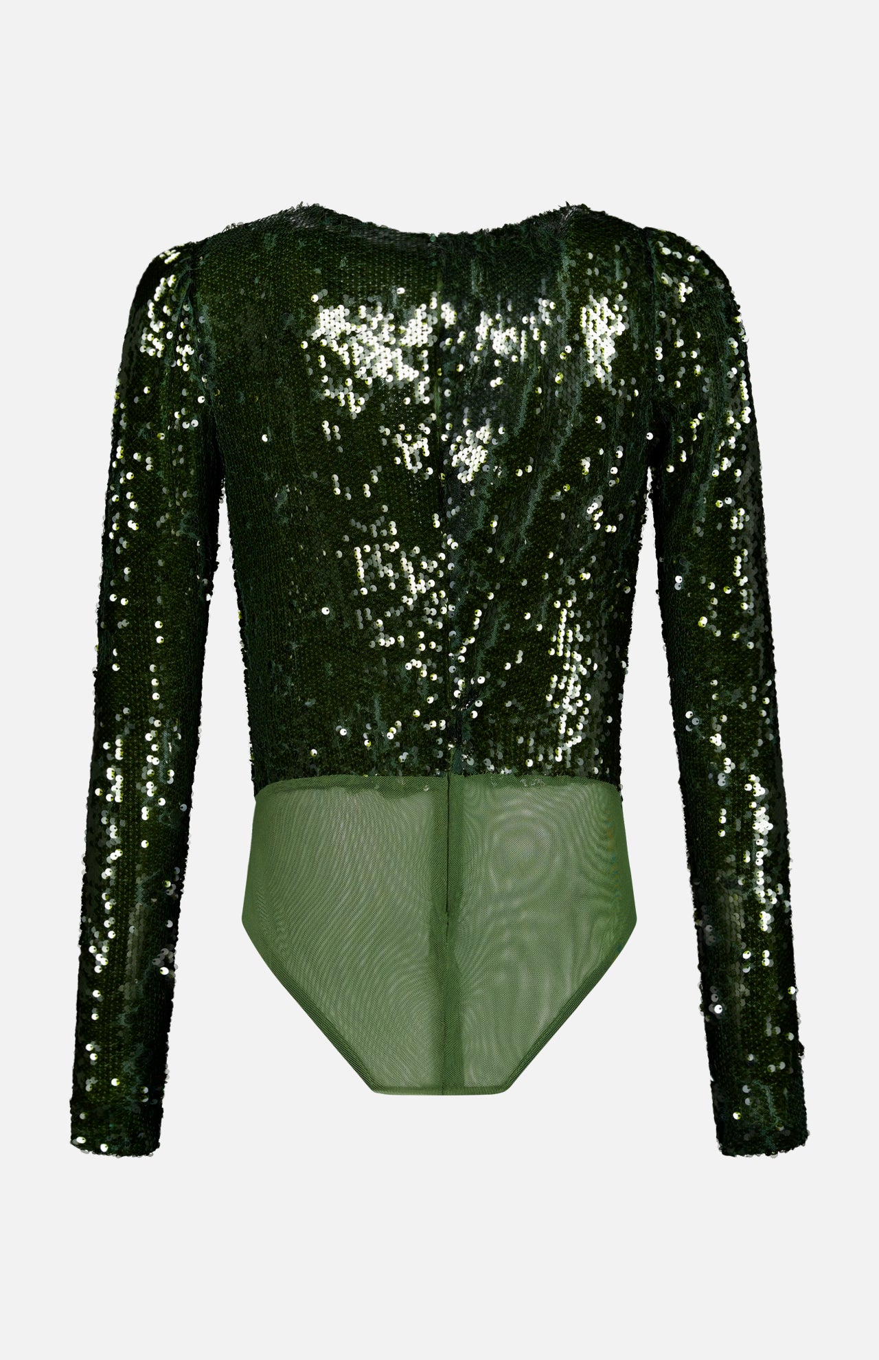 Emerald sequins? Sounds like a party. This green bodysuit is designed to seduce and shimmer in sequins. It’s the perfect piece to bring extra drama to special occasions. You can expect a plunging neckline and a sleek, barely-there panty.