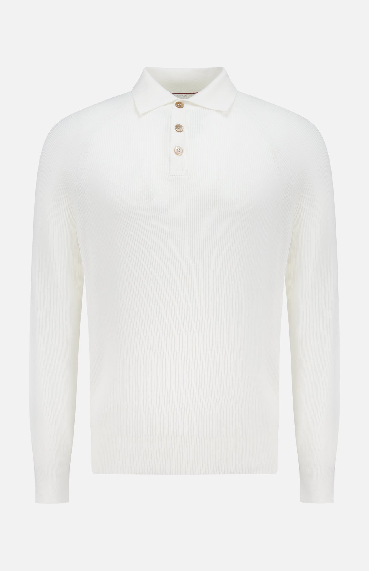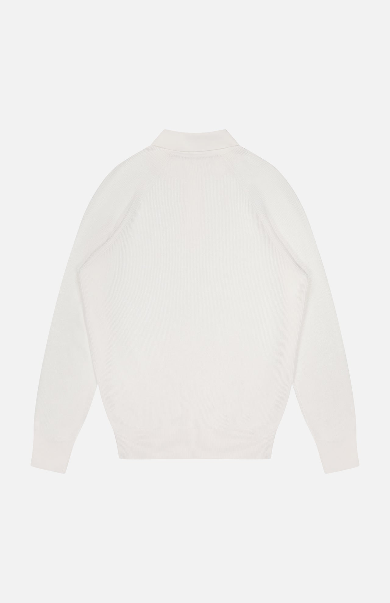 Casual and filled with a handsome charm, this white polo sweater is a refined essential that every man needs. Crafted of cotton, this long-sleeve polo has a signature collar and raglan sleeves with a classic English rib knit texture to give a traditional allure to a sporty silhouette. From denim to trousers, this top can do it all.