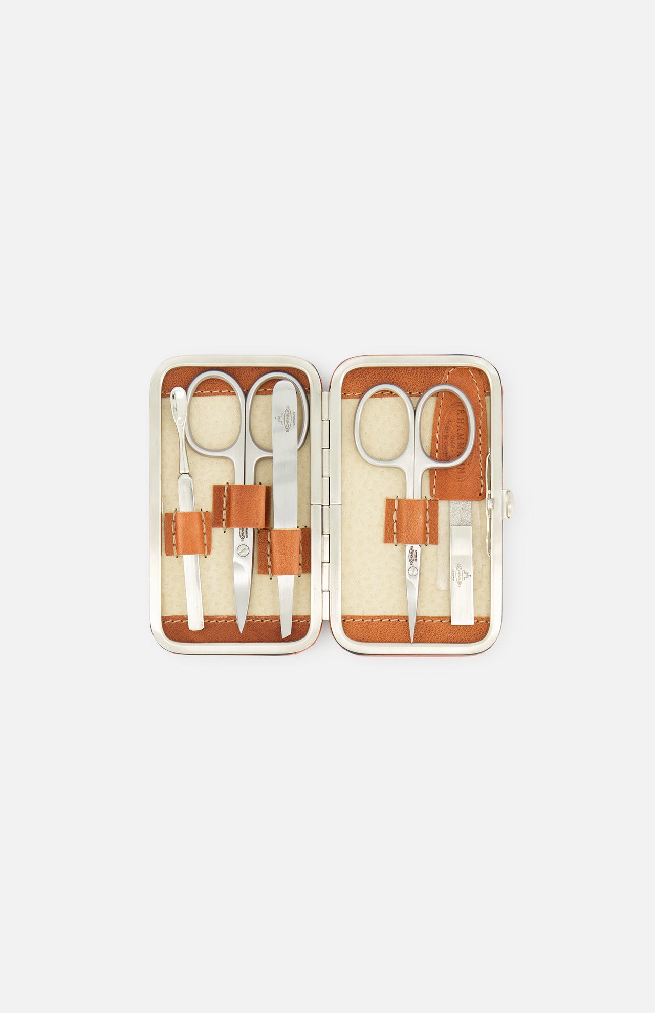 From Germany's oldest manufacturer of leather goods and travel accessories since 1864 comes this manicure set made from brown vegetable tanned American Bison leather which receives an antique look soon after using. The fine and precise closing metal frame makes the set very slim and easy to open and close. Set contains stainless steel utensils including a nail file, nail scissor, nail clipper, cuticle scissor and tweezer.