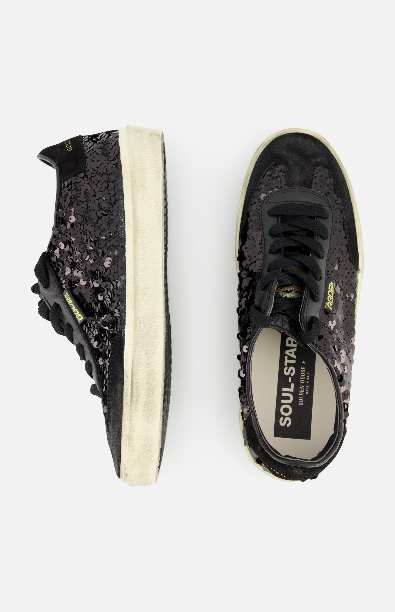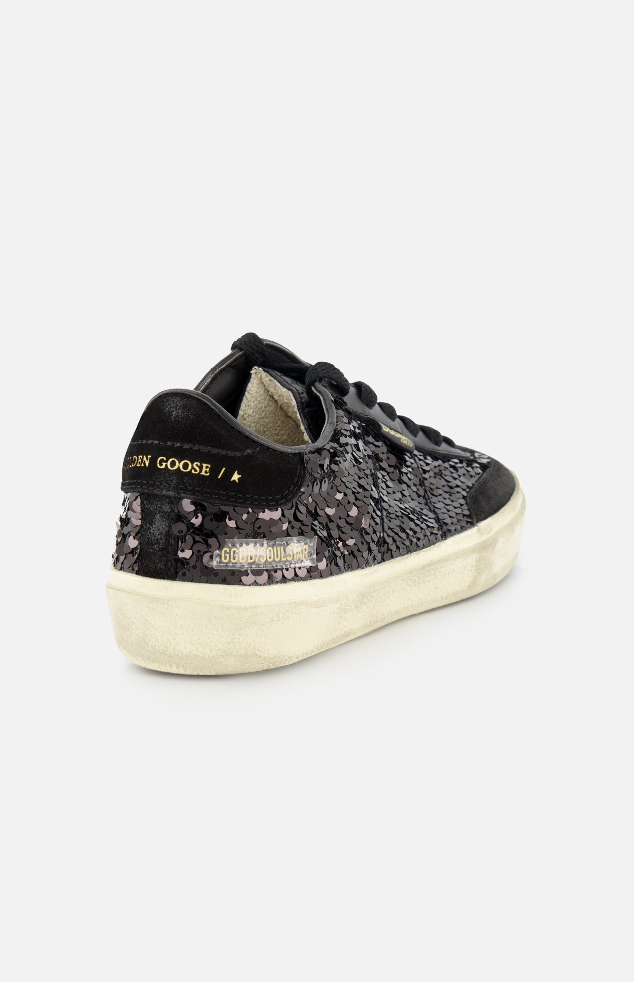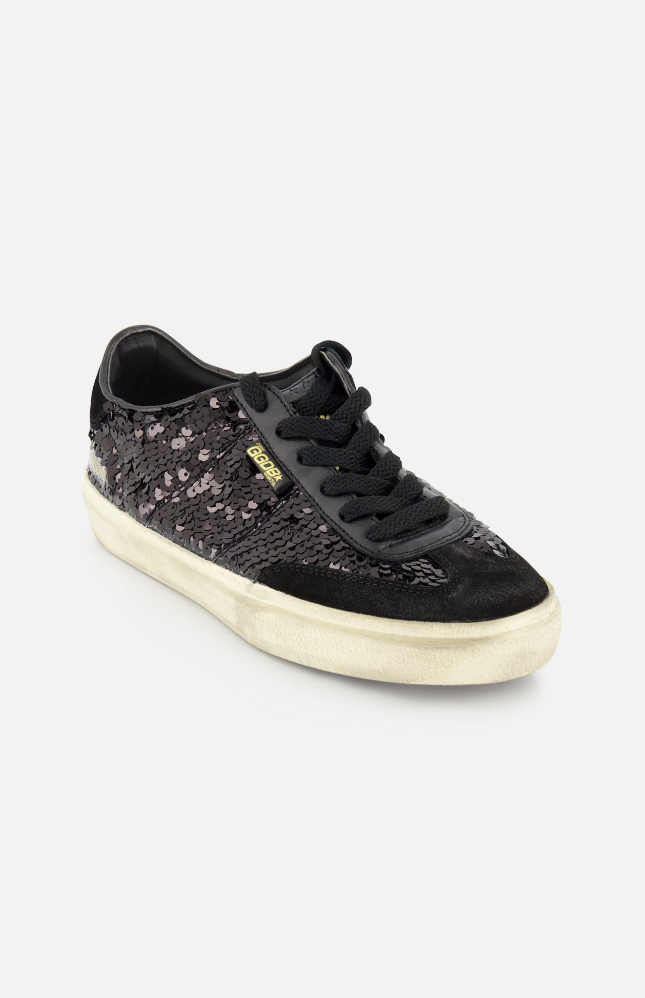 Light up the world with radiant sparkles. With 60s-inspiration, this black sequined sneaker has a leather tongue and a suede toe for a material mix thatās super cool. You can expect the usual Golden distressing and scuffed soles for that lived-in and laid-back vibe.Ā