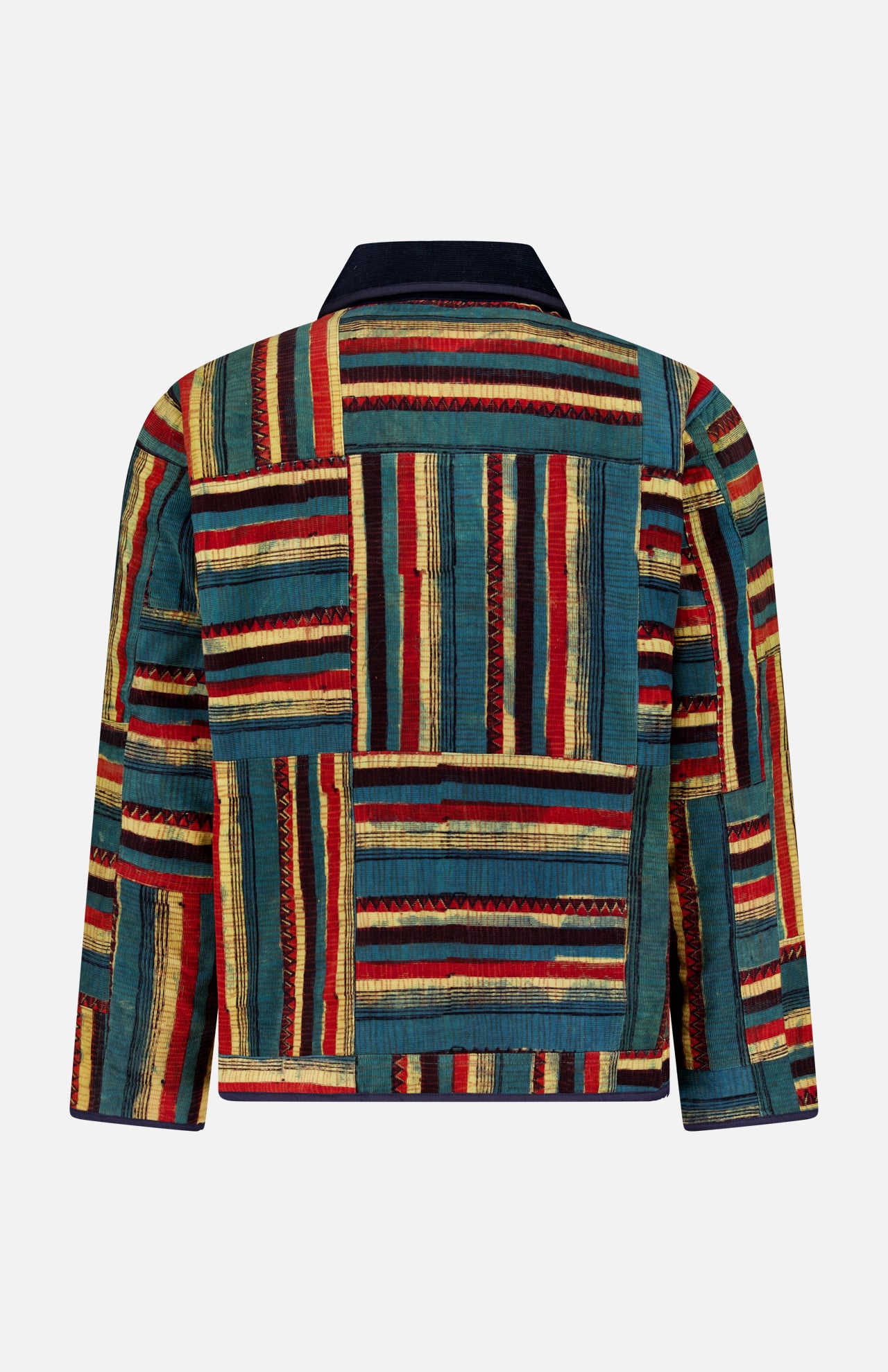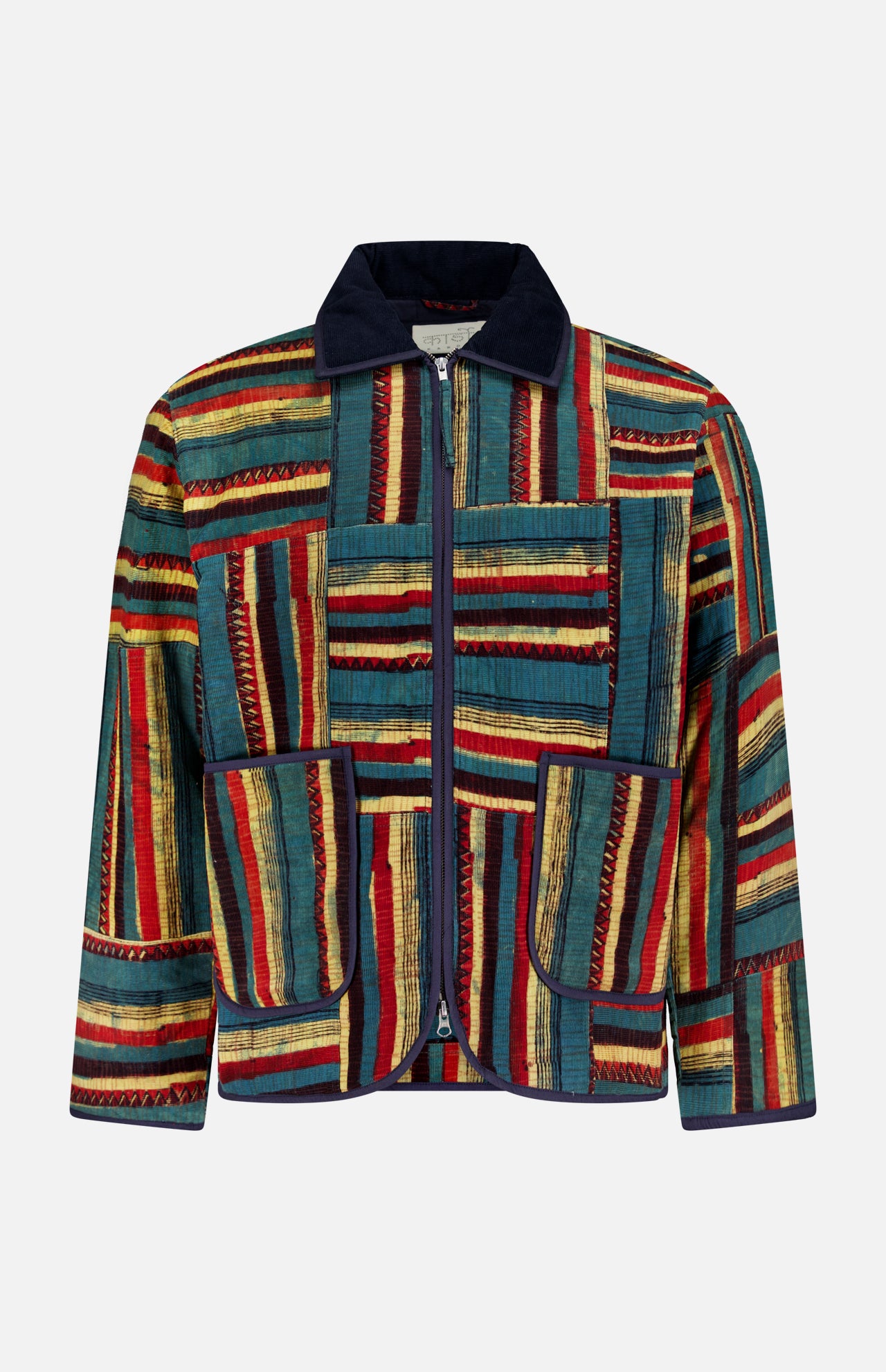 Artistic and filled with craftsmanship, this multicolored block print patchwork jacket is made by one tailor from beginning to end. This quilted jacket is attractive and easygoing and holds the outline of a classic military layer but shifts its posture. With an added corduroy collar and a touch more definition, this style is built to stand on its own—offering structure without bulk.