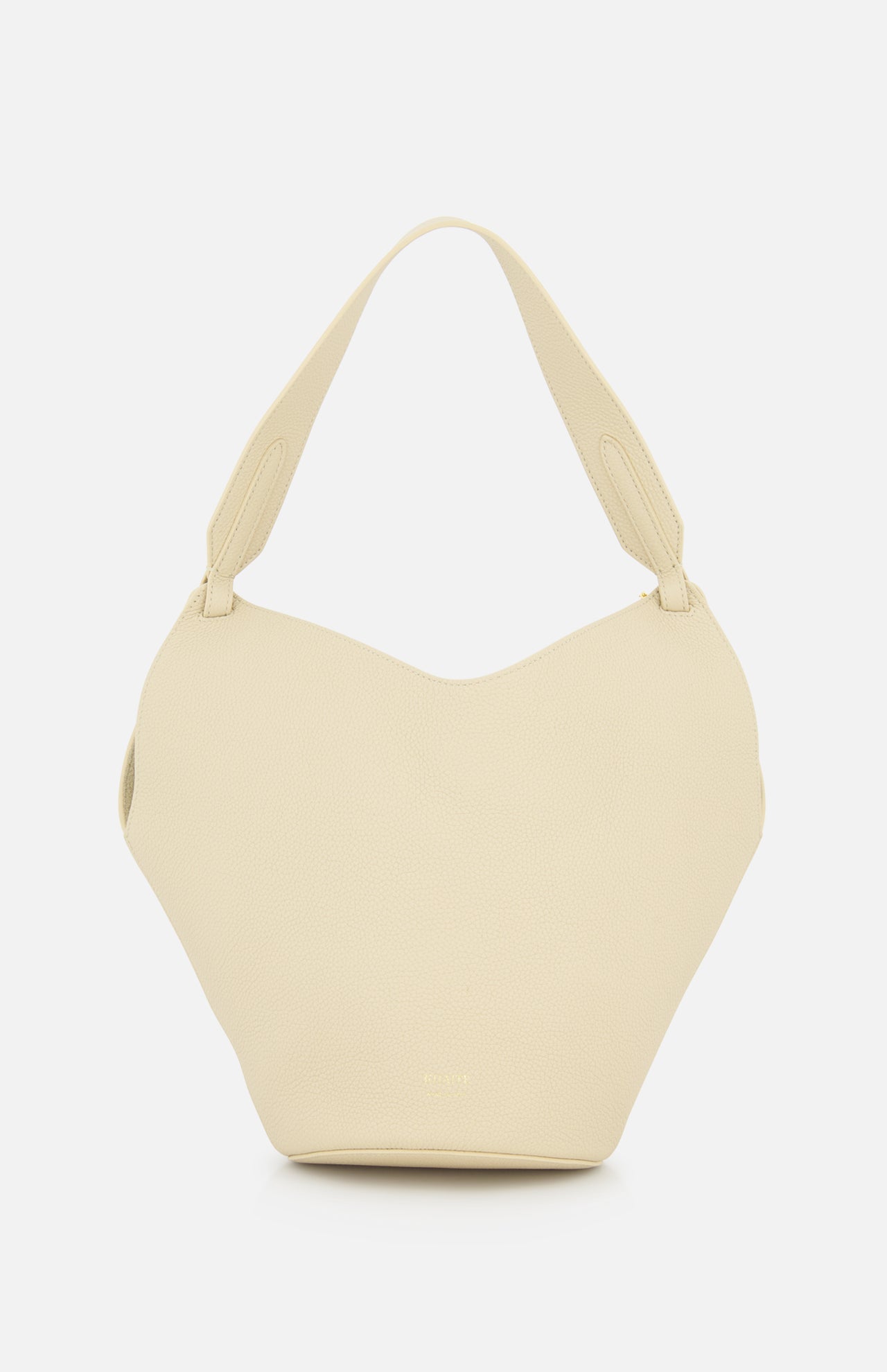 When only a minimalist wardrobe will do, this ivory tote bag is designed with a sharp philosophy that’s instantly recognizable. This scarf-inspired leather tote is crafted to be especially lightweight with a rounded base that catches everything you drop inside. The jewelry-like toggle closure at the interior is a darling touch.