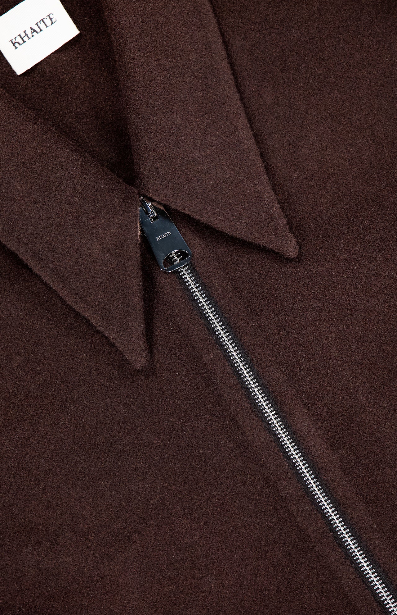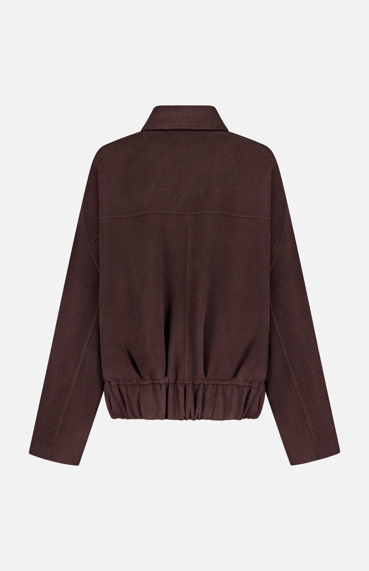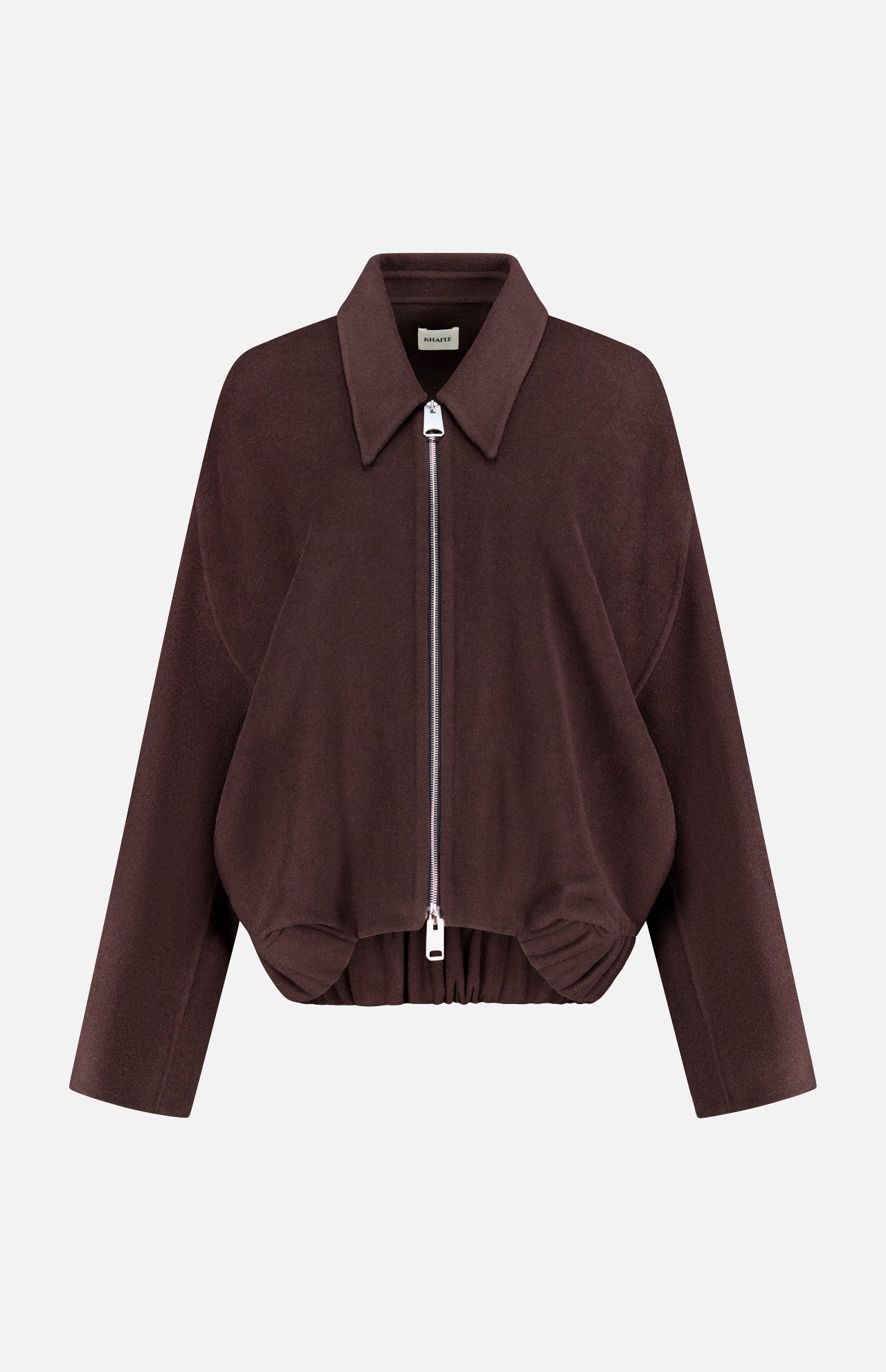 When only a minimalist wardrobe will do, this dark brown jacket is designed with a chic philosophy that’s instantly recognizable. Consider this style a sculptural yet stripped-down bomber in double-faced wool. You can expect a relaxed and rounded blouson silhouette with dropped shoulder seams and ruching at the elasticized hem. Highlighted details include an elongated collar and sleeves as well as a two-way zipper and practical side pockets.