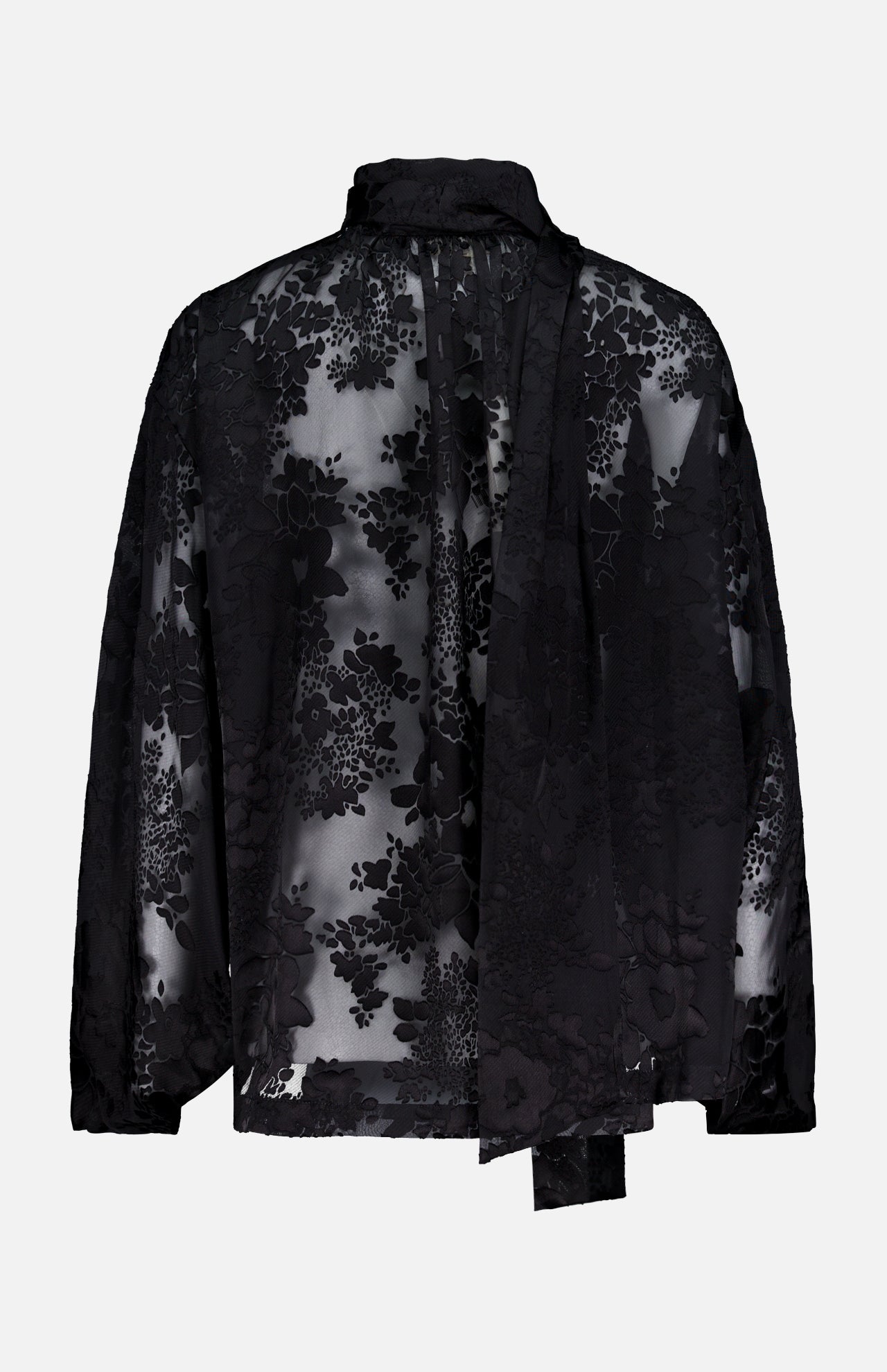 Enter into a dreamy realm of bohemian romance with this black blouse. Oversized and airy, this top is designed with flowy bishop sleeves and a scarf neck tie. It’s thoughtfully crafted in a burnout satin with a floral pattern and looks perfect when paired with slim jeans and sky-high heels for a balanced look.