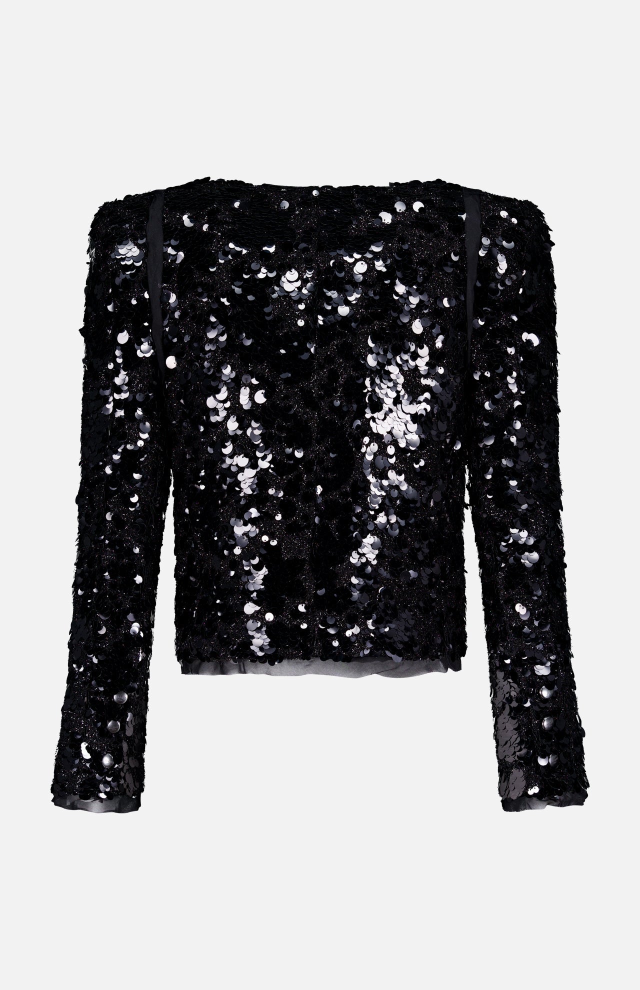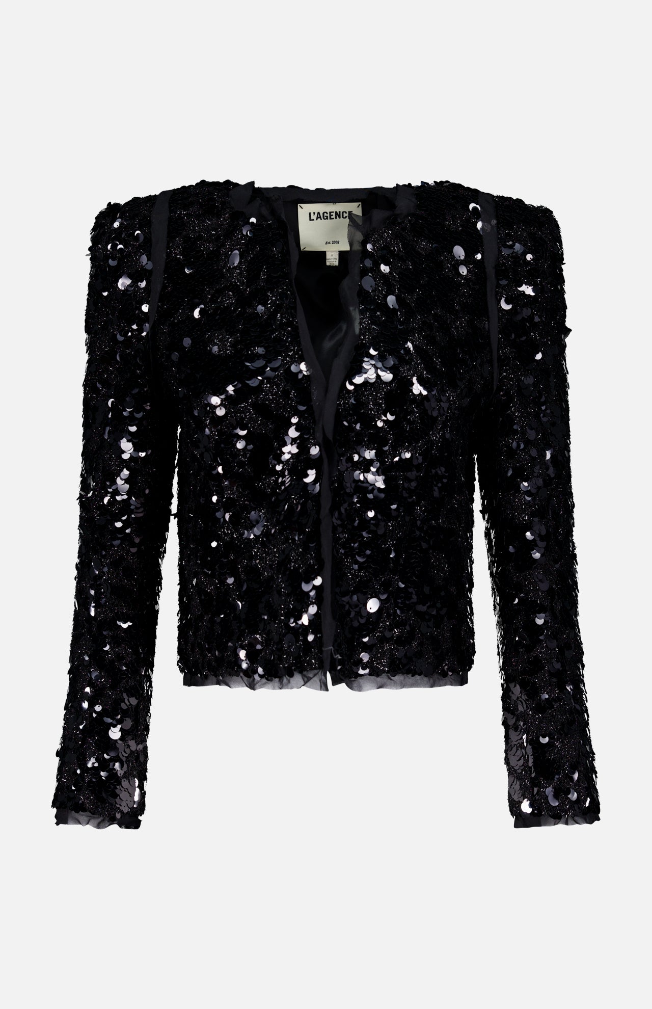 Everyone will want to know your story. Drenched in shimmering paillette sequins, this mesmerizing black jacket is designed for high-impact glamour. This look is all about metallic tweed with chiffon trims and pointed shoulders and a slightly cropped cut to create the ultimate night-out piece. However you style it, the sequins run the show.