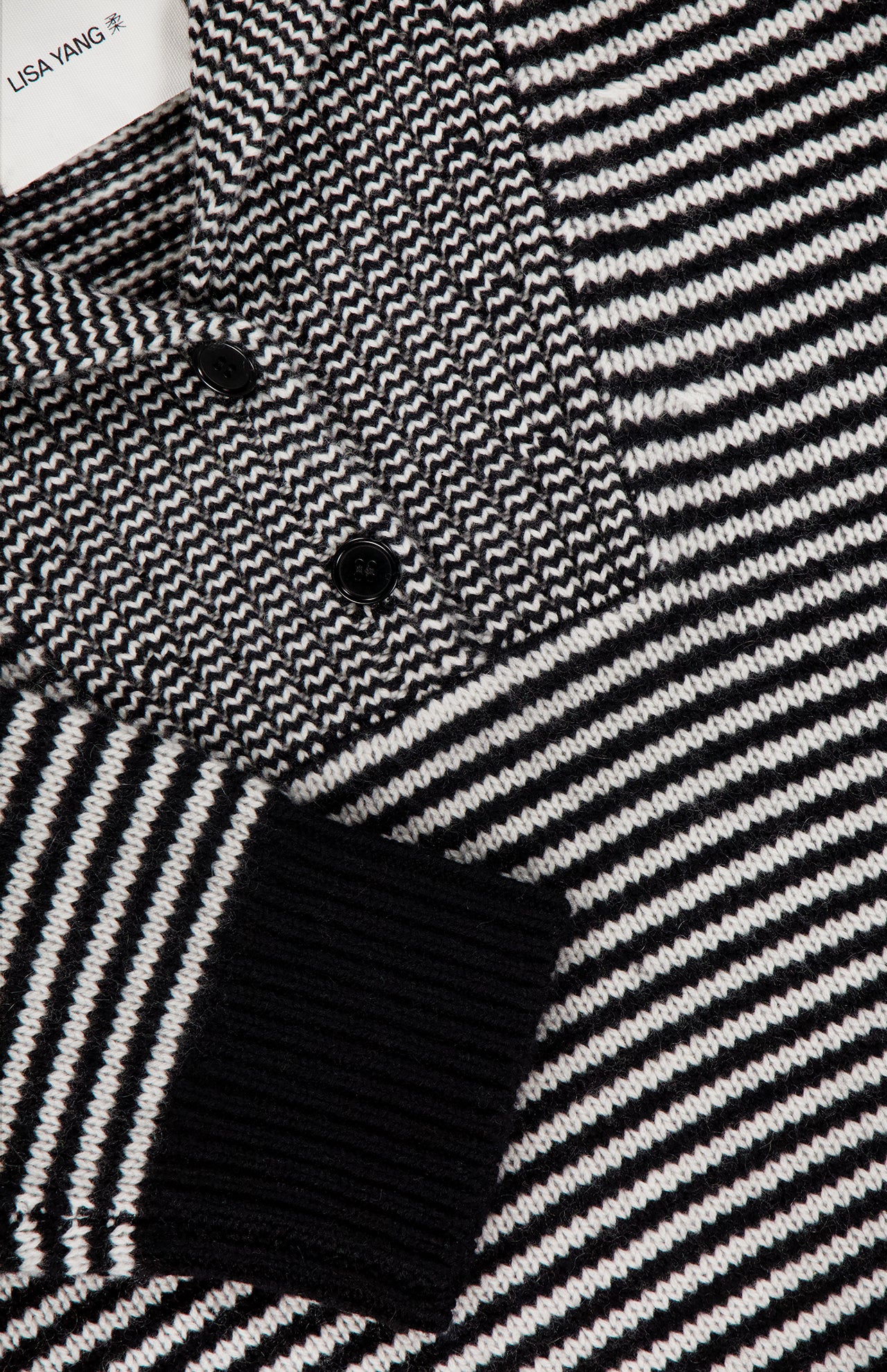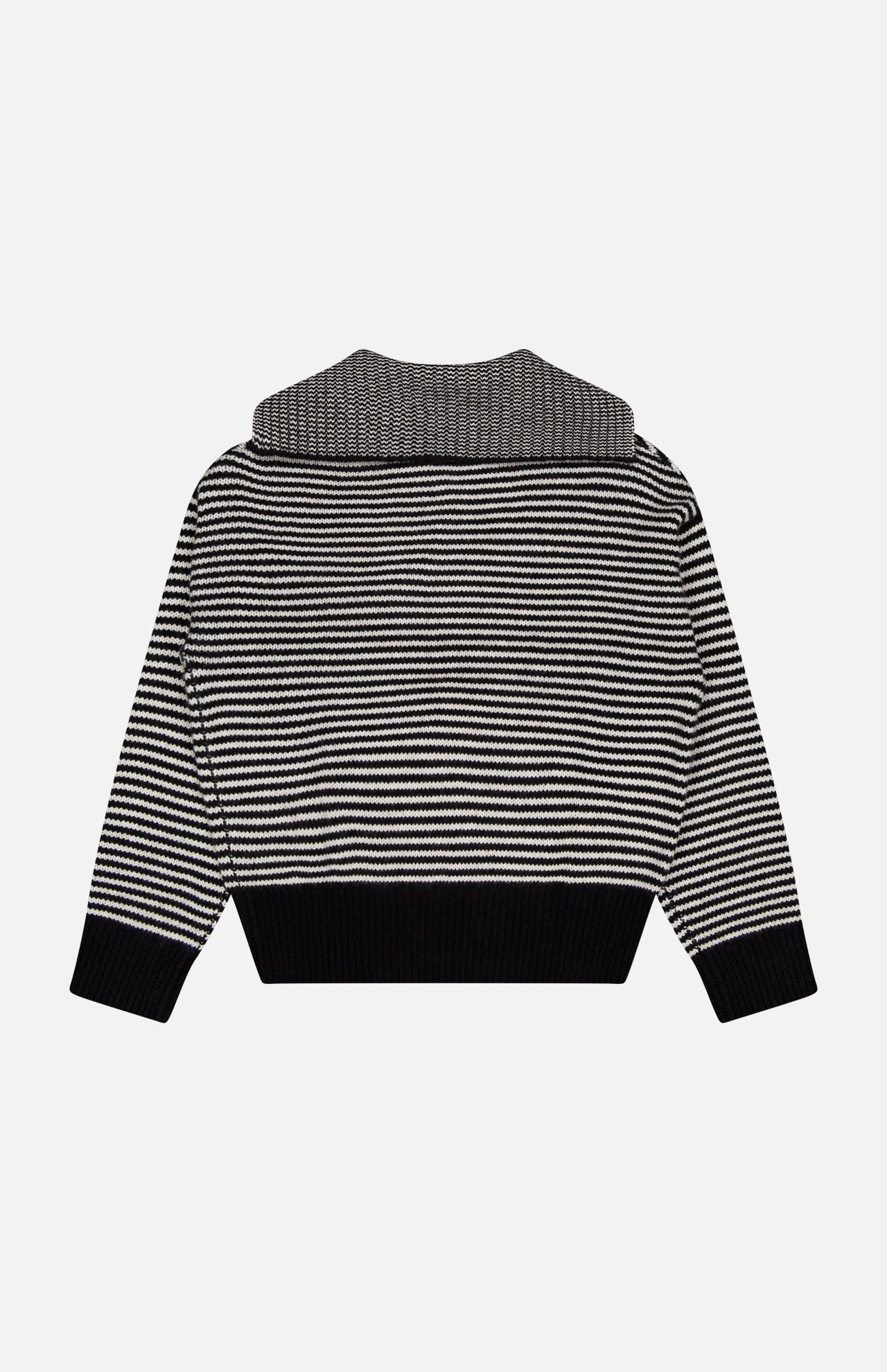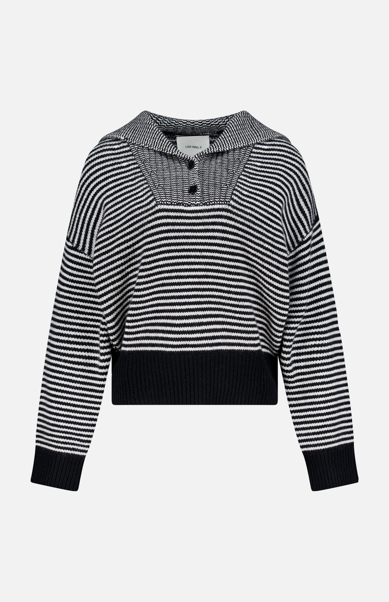 Chinese heritage coupled with a Scandinavian aesthetic define this slow luxury brand’s ethos making them an authority on cashmere. Designed with an unfussy silhouette, this black and cream sweater is elevated with stripes for classic sophistication. There’s a bibbed design at the shawl neckline with a button-front placket.