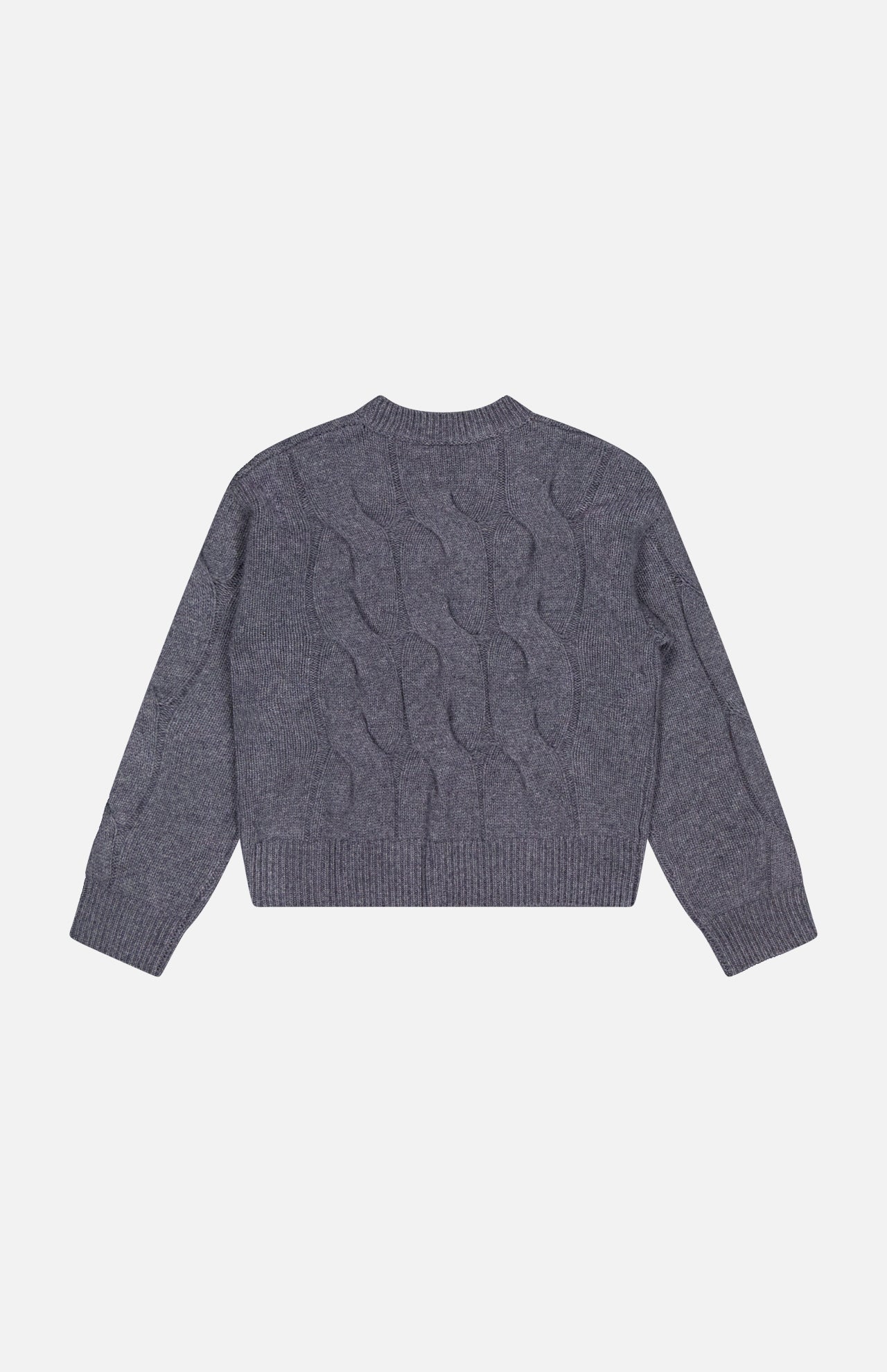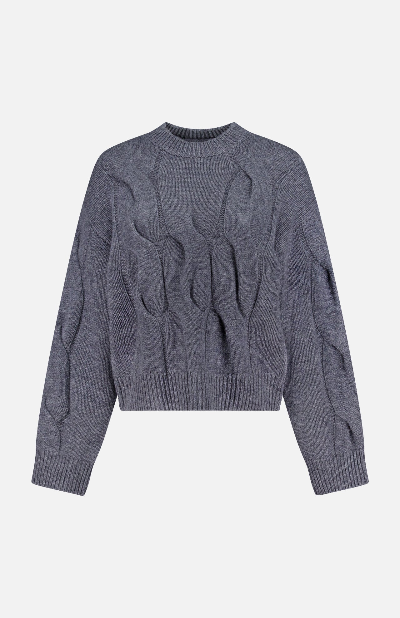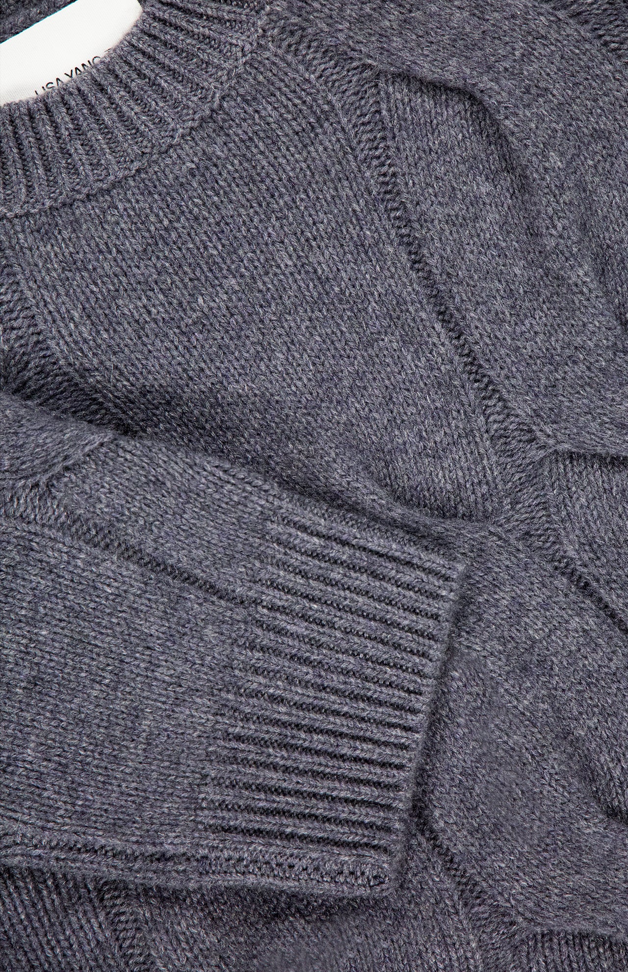 Chinese heritage coupled with a Scandinavian aesthetic define this slow luxury brand’s ethos making them an authority on cashmere. This charcoal sweater has sculpted textures and is crafted in heavy knit cashmere with cables in scaled-up proportions. You can expect a relaxed fit silhouette with a crew neck, dropped shoulders, full-length sleeves and ribbed trims throughout.