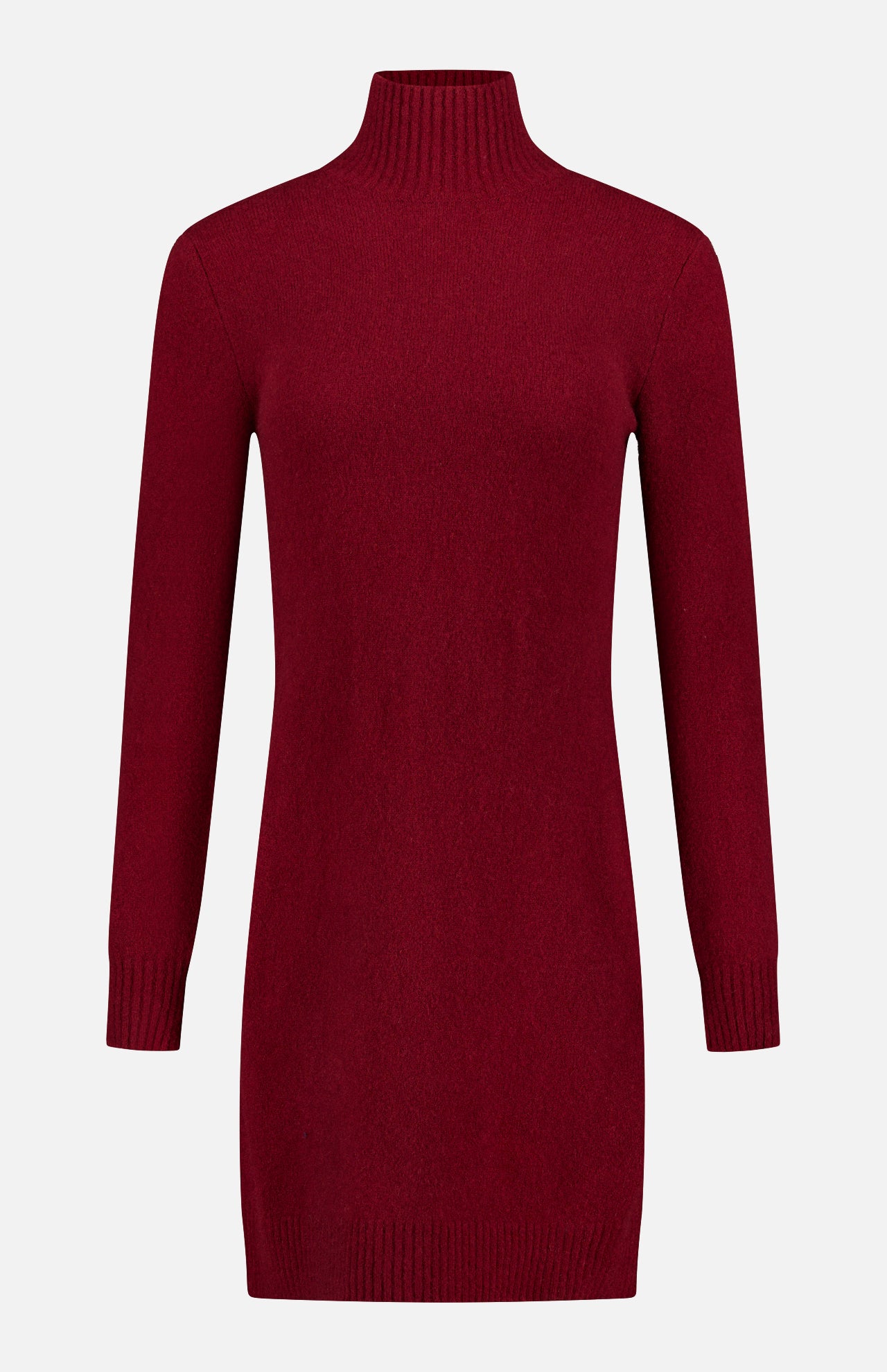 Get a daily dose of elegance and comfort when you wear this raspberry colored sweater dress. This mini dress is knit from a brushed cashmere-blend for added softness in a turtleneck silhouette with long sleeves. Style with tall leather boots and a suede hobo bag for simplistic sophistication.