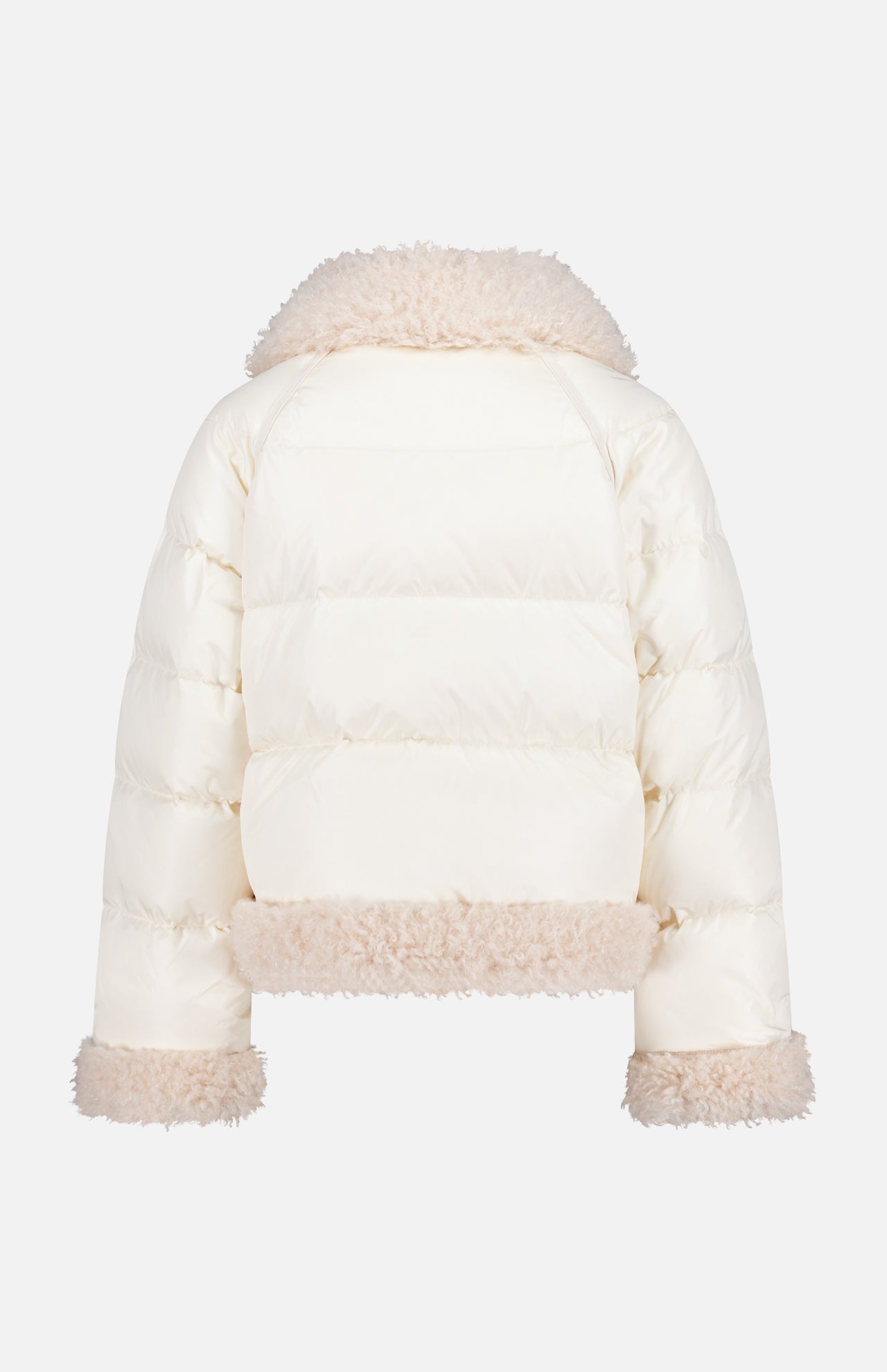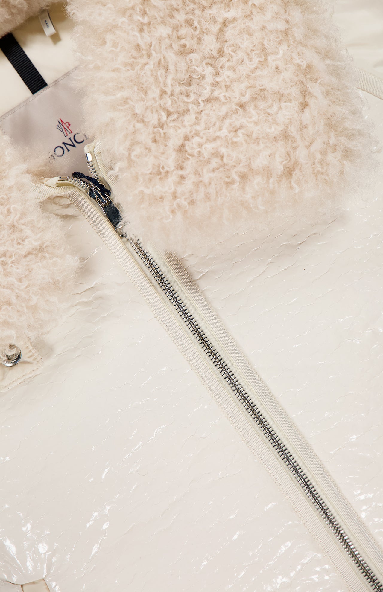 Guided by the motto, “born in the mountains, living in the city,” Moncler infuses outerwear with high-performance attributes for life’s everyday expeditions. This white jacket has a tactile twist in a shorter silhouette. This down-filled puffer is crafted from nylon while a plush teddy collar and patent-effect front add textural depth.