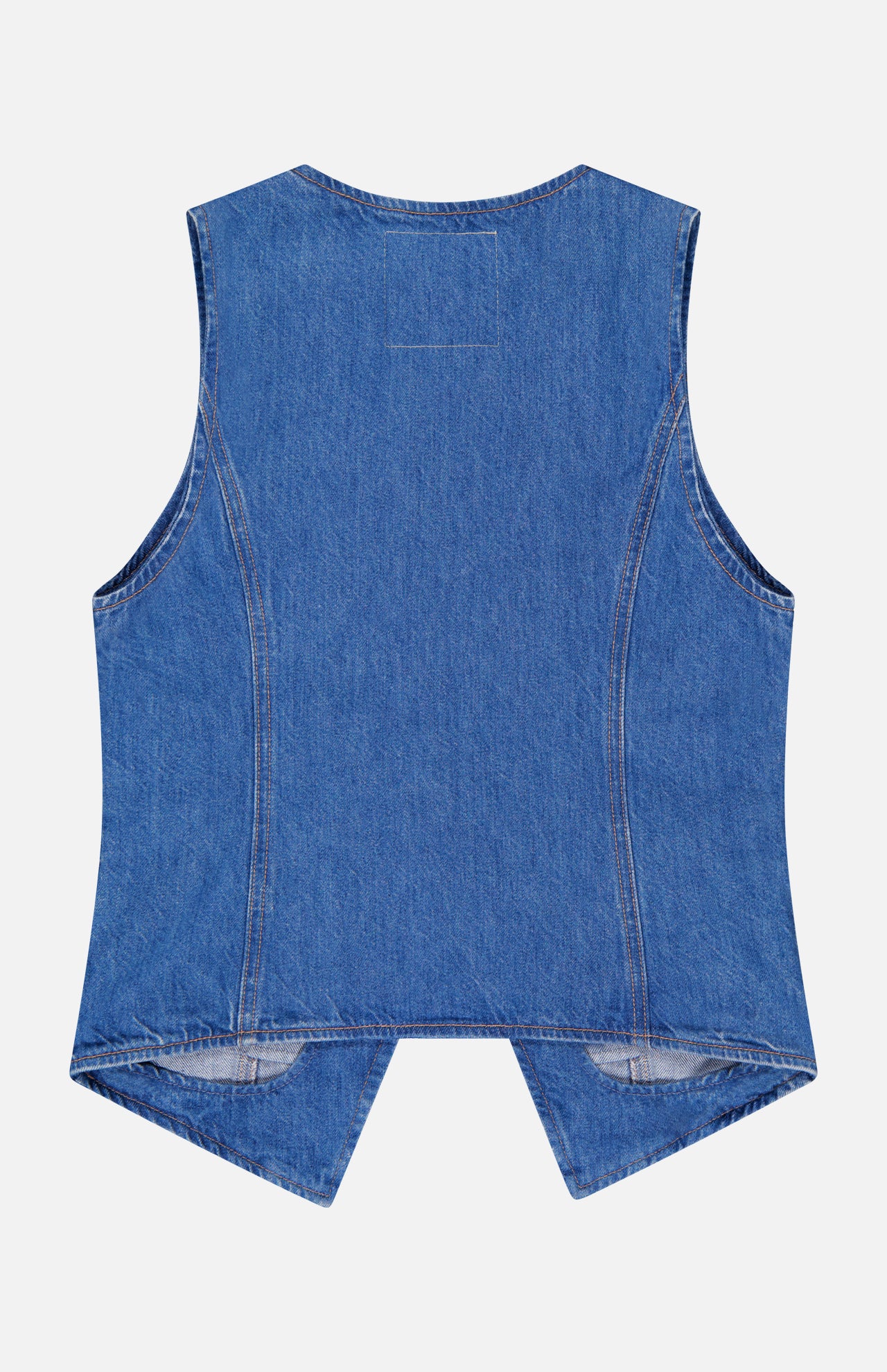 Give a girl the right top and she can take on the world. This denim option is designed with a crew neck, buttons down the front, slit pockets and angled seams. It's made from rigid denim in a mid-blue wash with subtle fading and silver hardware. Style with black denim, a vintage neck scarf and oversized sunglasses for a look everyone will remember (and then try to copy).