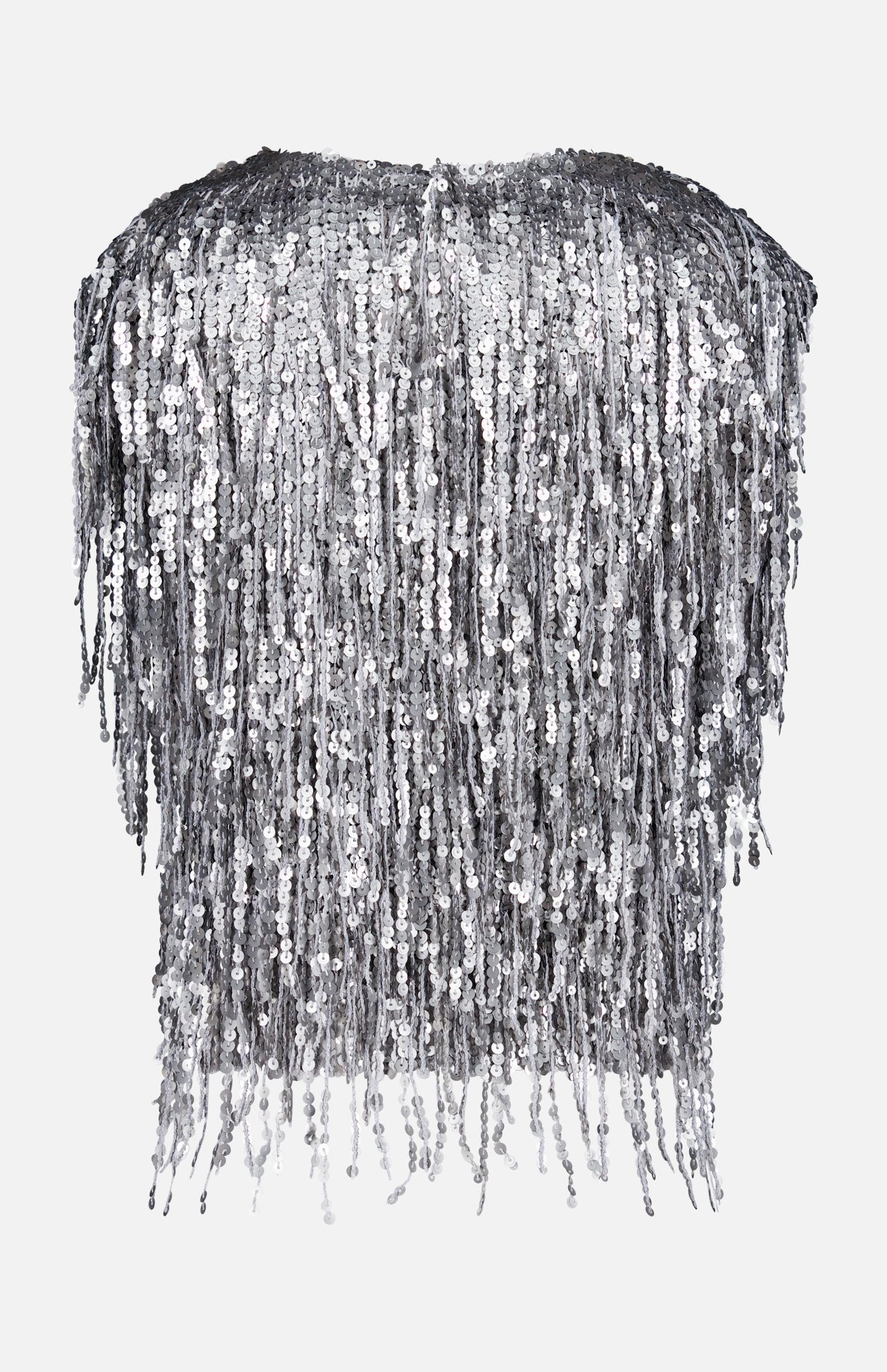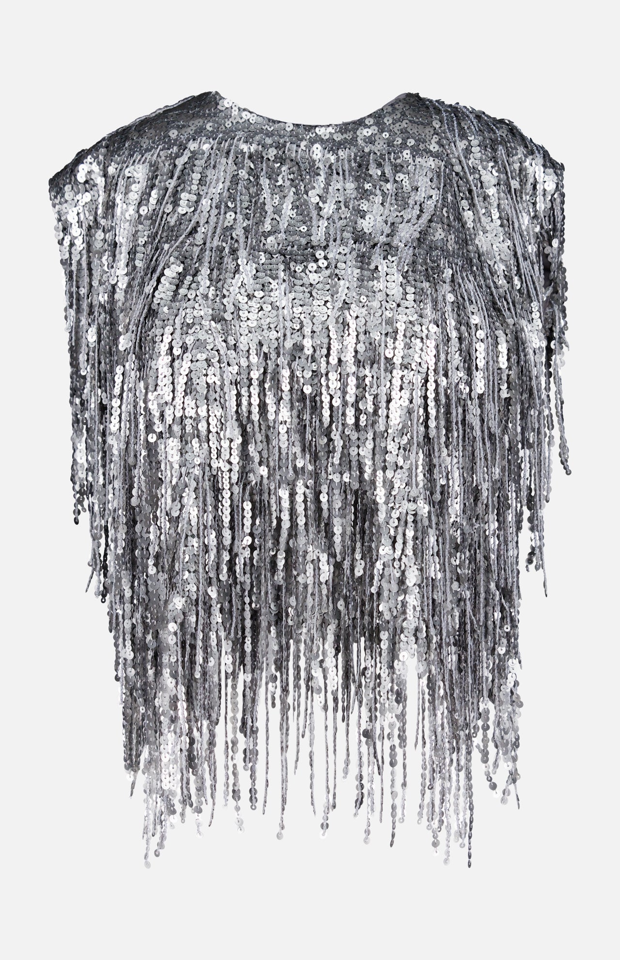 Sequin fringe means this is a very important party piece. This classic shell top has capped sleeves and falls around the hips with a tassled, dazzling effect in silver. Dress it down with denim or dress it up with a black midi skirt. Consider wearing this piece over a crisp white shirt for a cool party look that works for festive yet formal cocktail parties.
