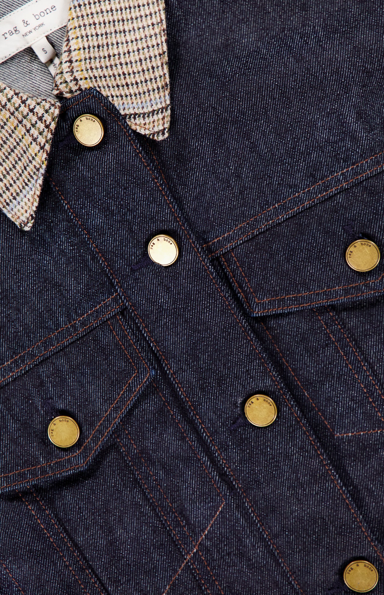 This denim jacket’s inky dark wash has a statement collar and sewn-down cuffs in an Italian-milled heritage wool plaid. It stands in stark contrast to the dark denim and offers a playful touch with a cropped fit. Wear it with tailored trousers or similarly colored jeans for a twist on double denim. It’s traditional with a bit of attitude.