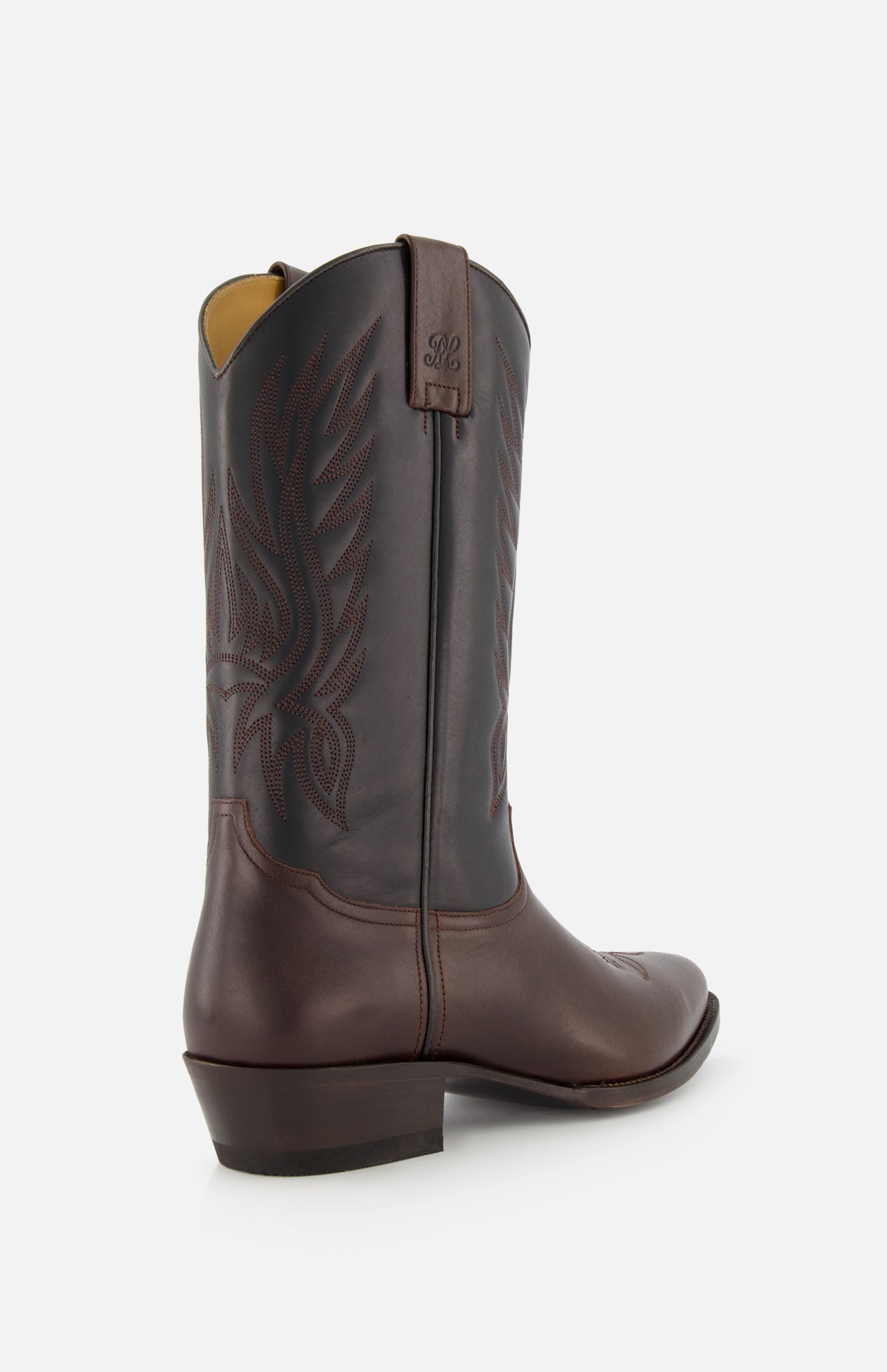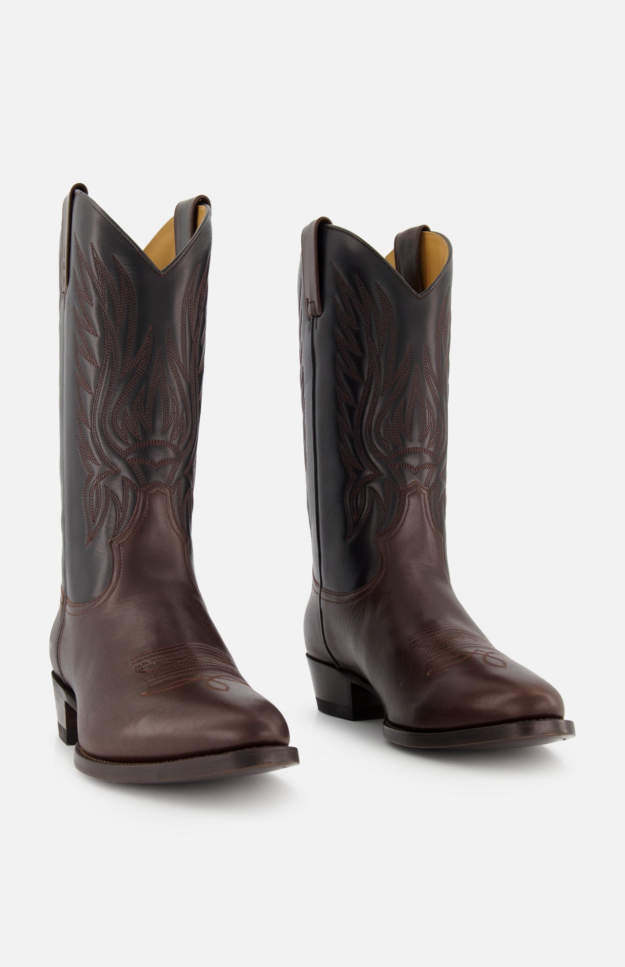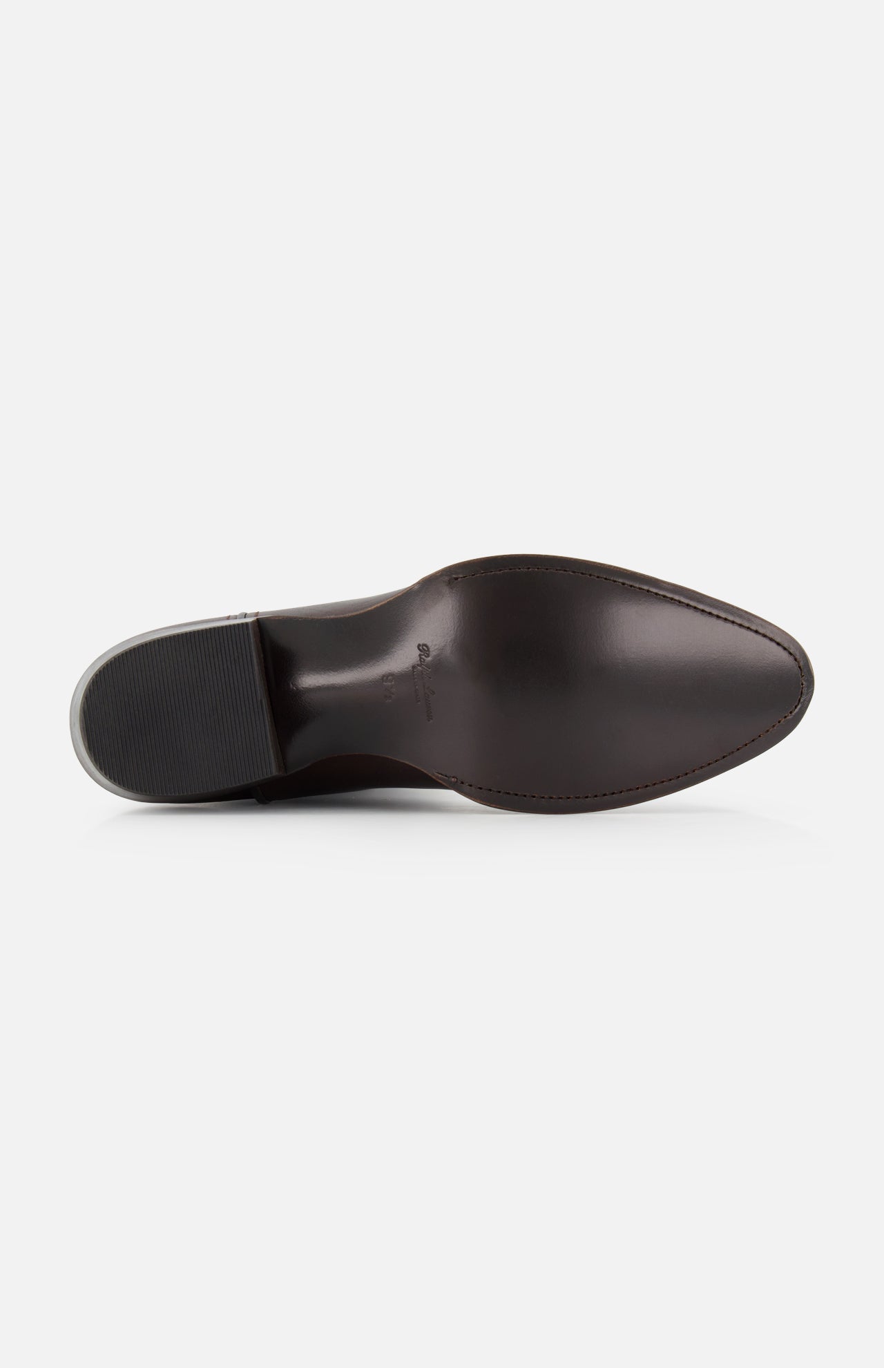 Expertly crafted with dark brown vegetable-tanned leather, this boot’s timeless silhouette is accented with Western-inspired decorative stitching. Designed with a curved topline and an almond-shaped toe, it’s finished with a luxurious calfskin lining and side pull tabs. Don’t miss the Ralph Lauren script embossed on the pull tabs for a special touch.