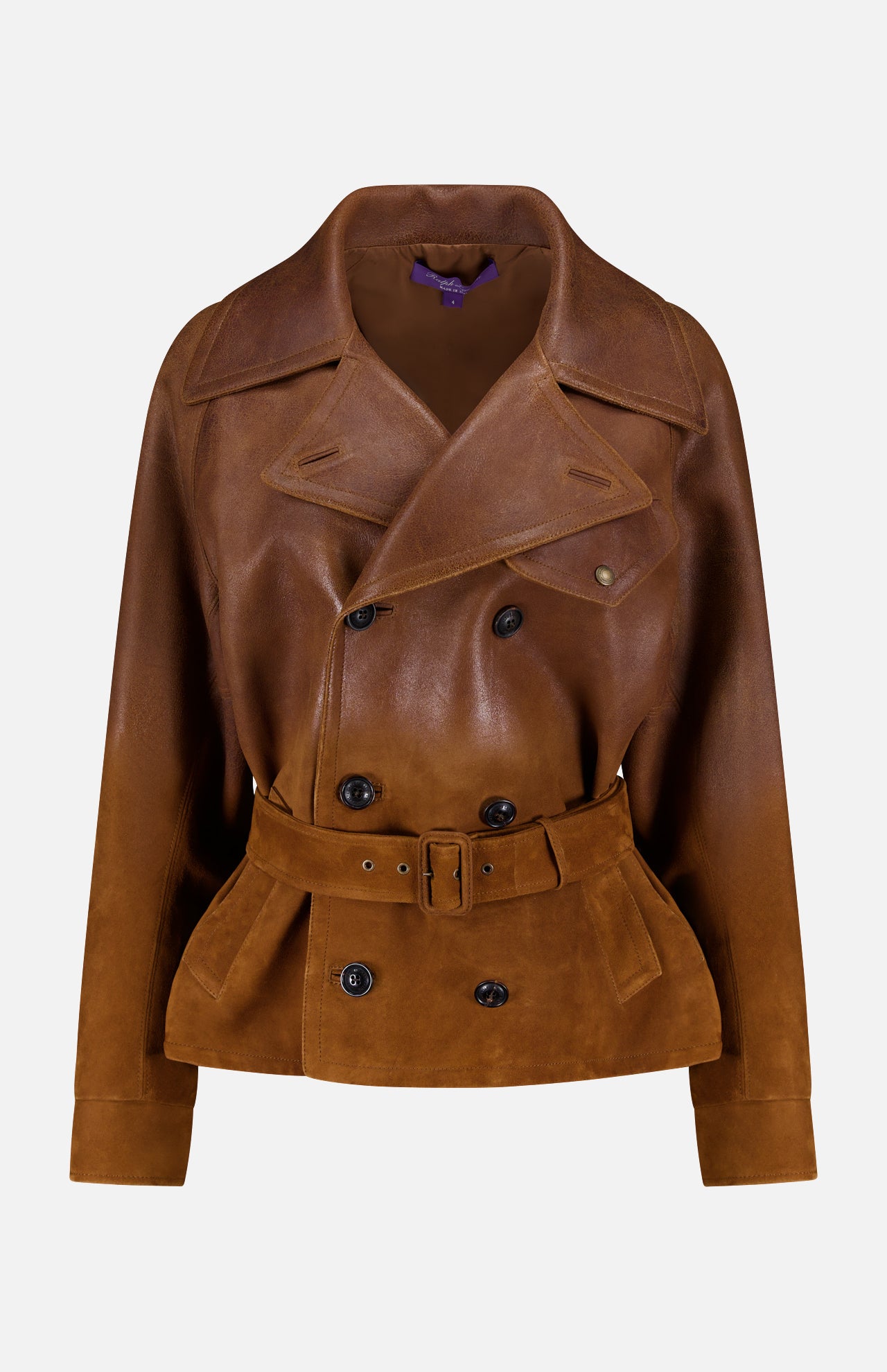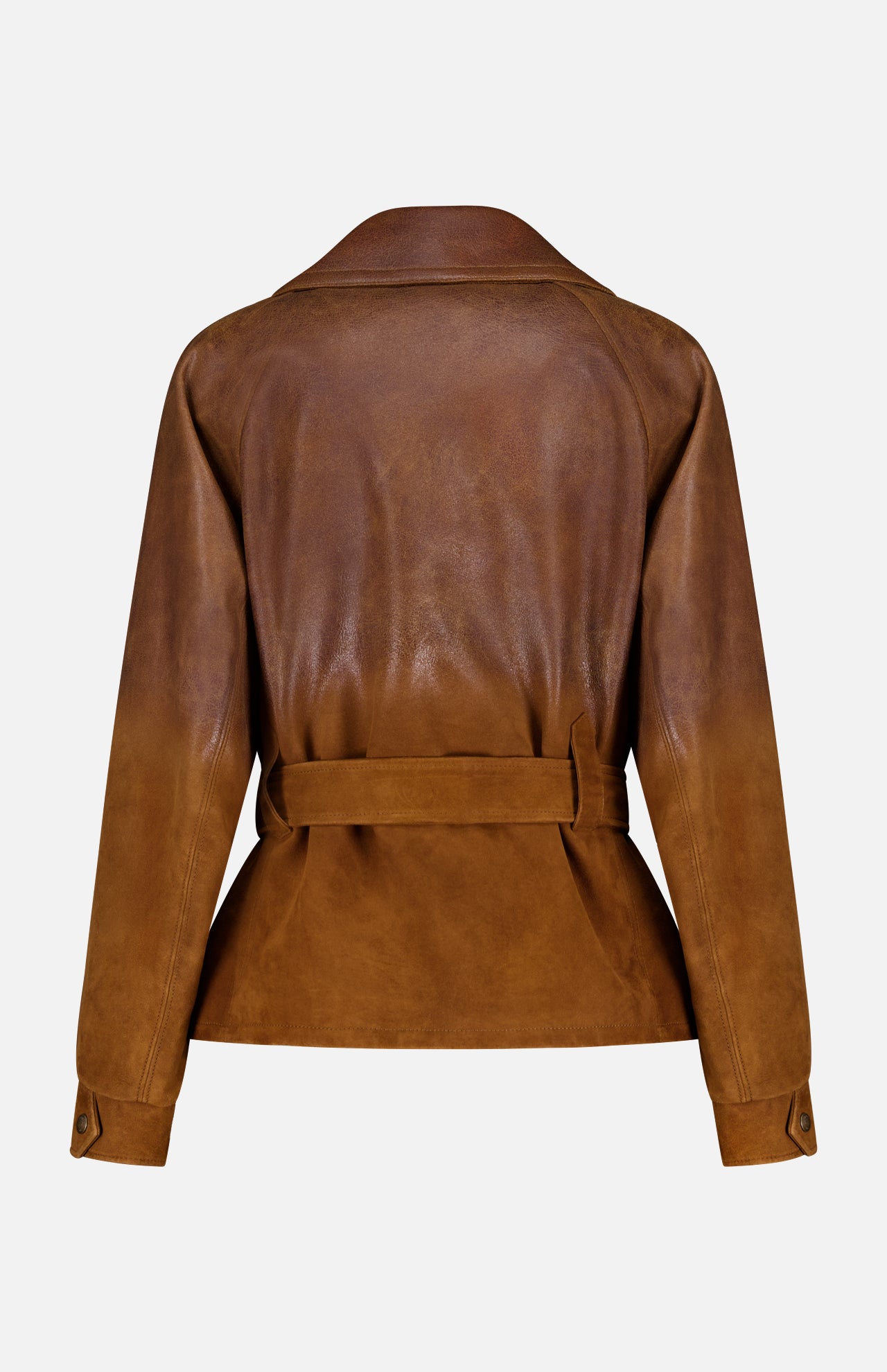 A revamped rendition of the traditional moto jacket, this brown option is a masterpiece of fine luxury and craftsmanship for those who seek timeless elegance. Made from soft, premium lambskin leather, this style is handmade with a suede nappa treatment, resulting in a gentle dégradé effect that makes each individual jacket truly unique. The glossy nappa leather upper body beautifully complements the supple suede lower body, creating a beautiful contrast in textures that emphasizes the quality and refinement of the leather. Tailored for a flattering fit with soft, structured lines, you’ll notice classic moto details, including a belted waist and oversize lapels.