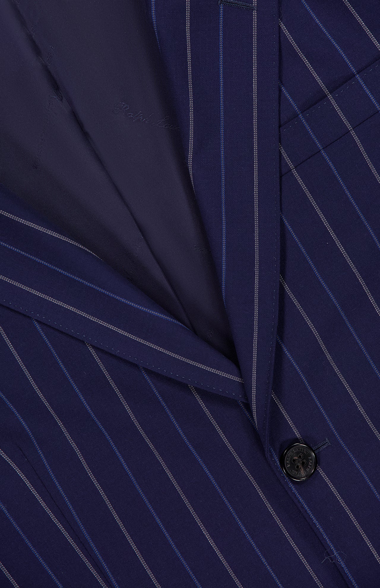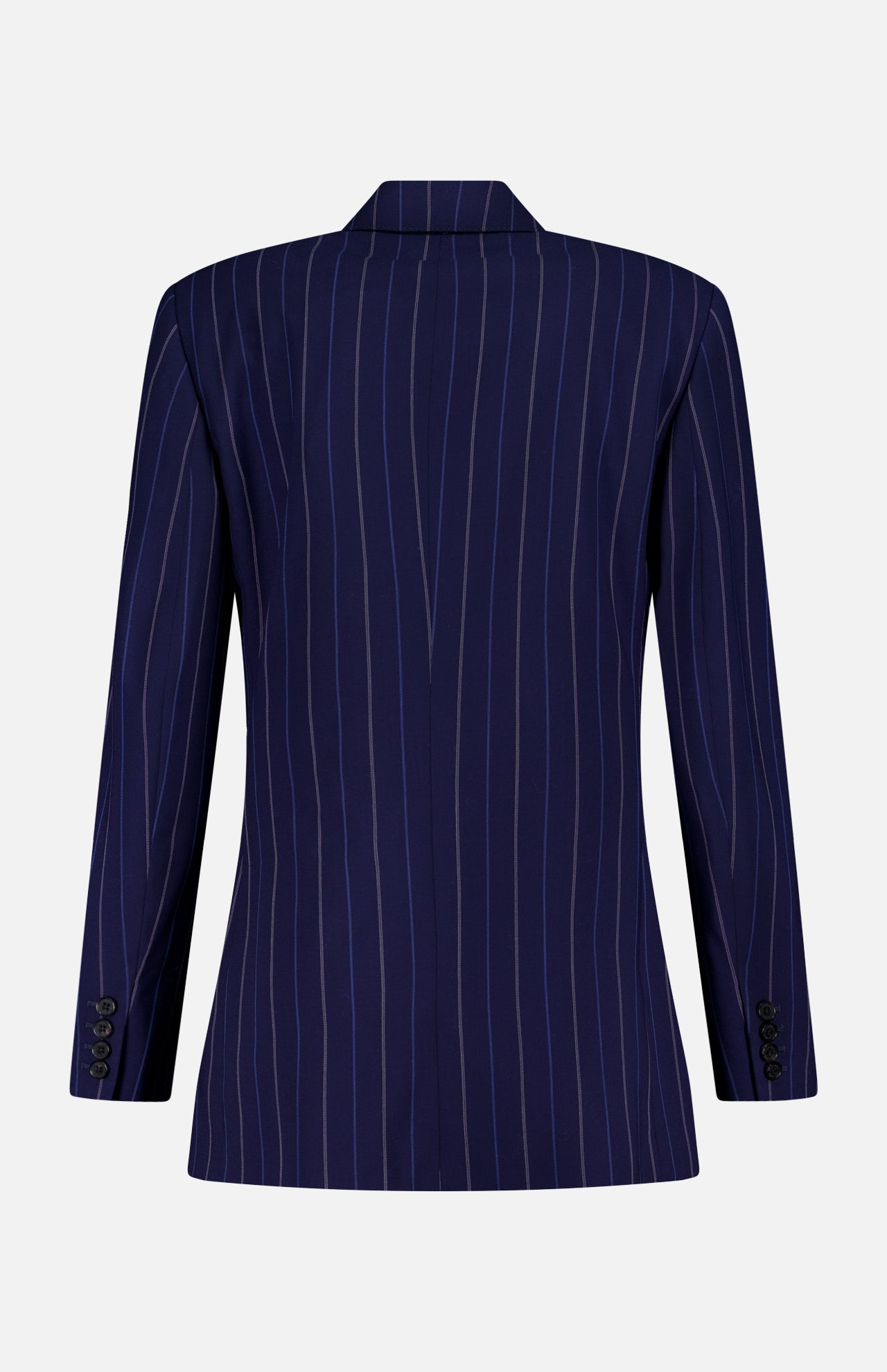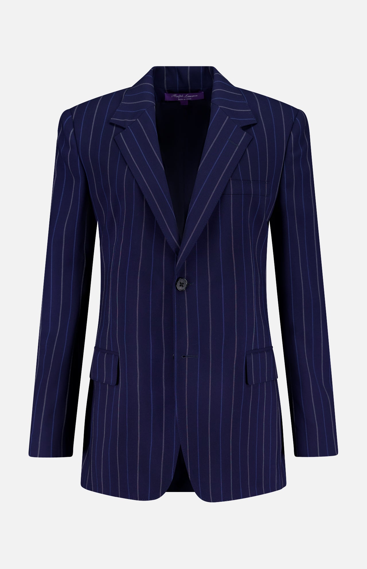 Modeled after menswear, this single-breasted navy jacket is cut for a slightly relaxed fit and is traditionally tailored with waist darts, flapped pockets and slender notch lapels. Crafted in Italy, this timeless style is made with ultrafine wool crepe distinguished by its custom striped design. A powerful piece, this blazer can be dressed up or down to suit the occasion and the mood.