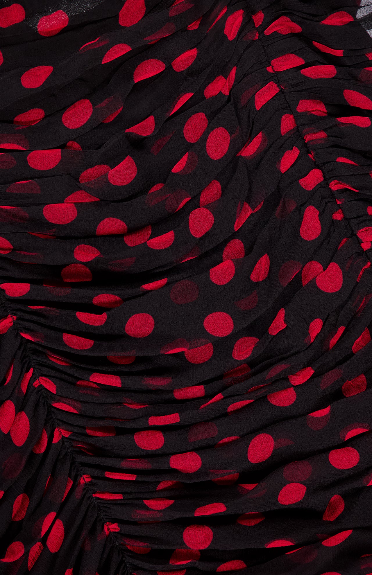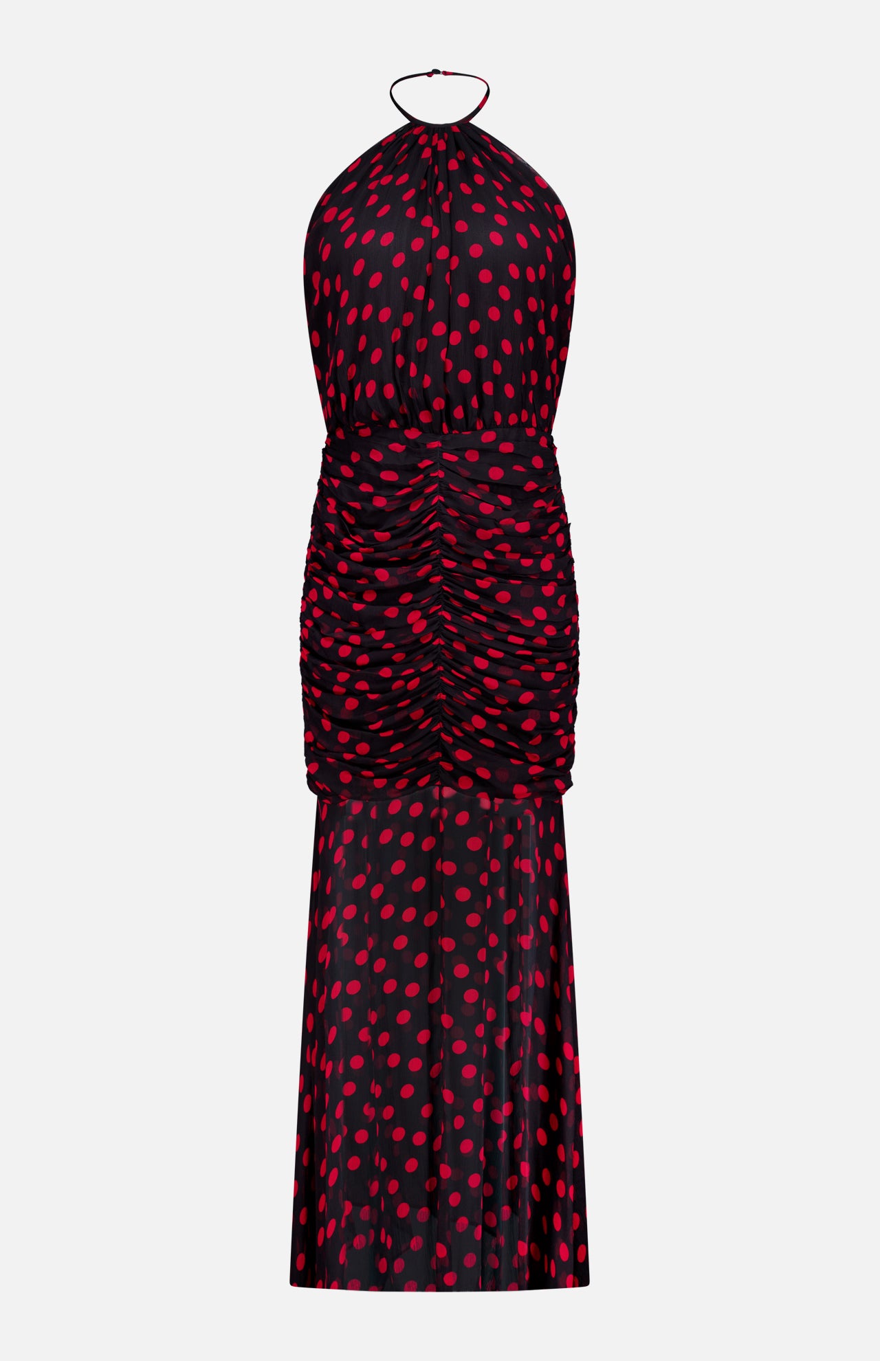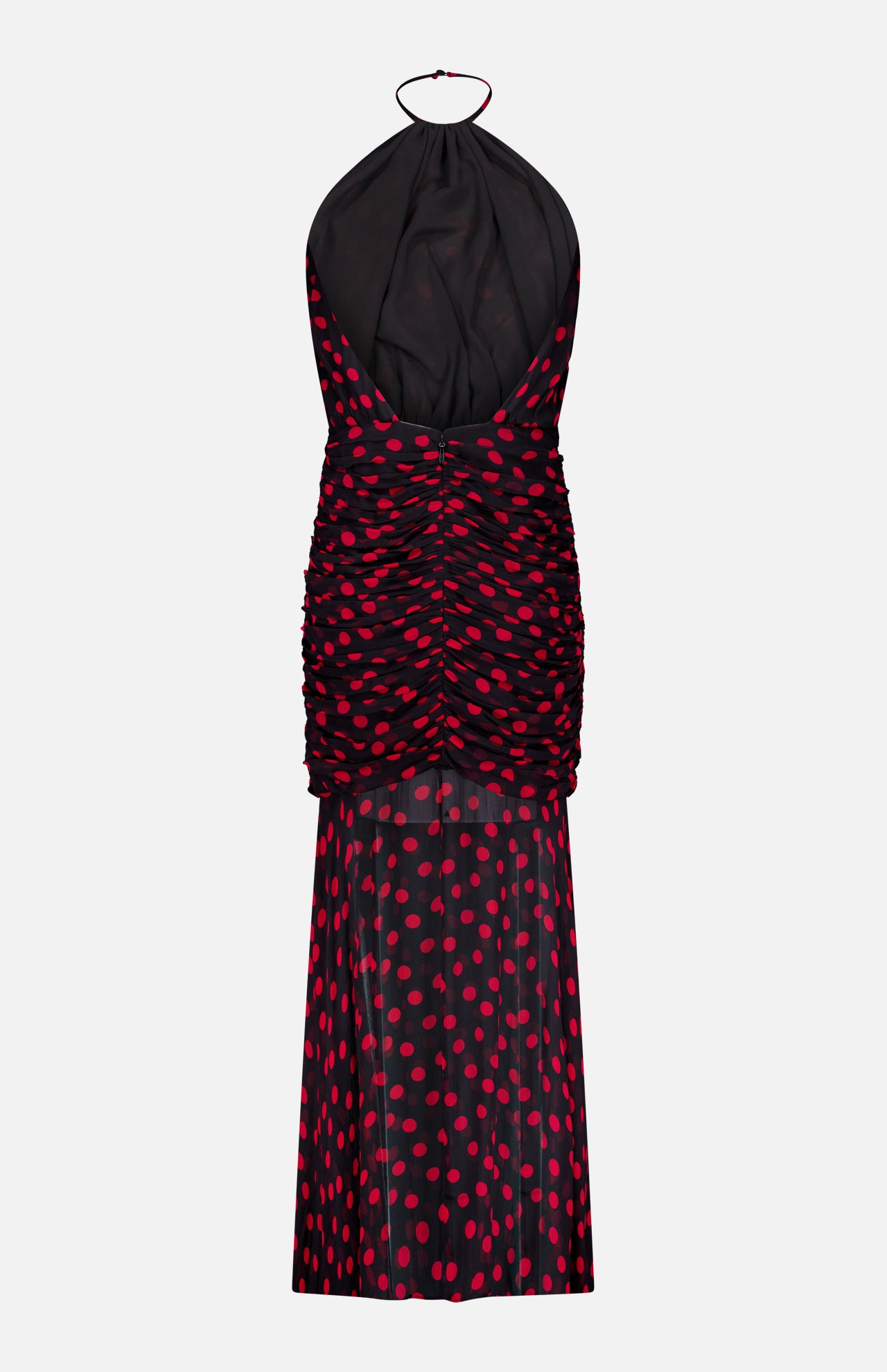 Polka dots start the party. This black maxi dress has a playful print in bold red dots for maximum visual impact. Formal occasions are fun with this sleeveless, halter neck option that has shirring at the midsection, a sexy open back and a sheer panel below the knees. Add black heels and wear your hair up to show off that neckline.