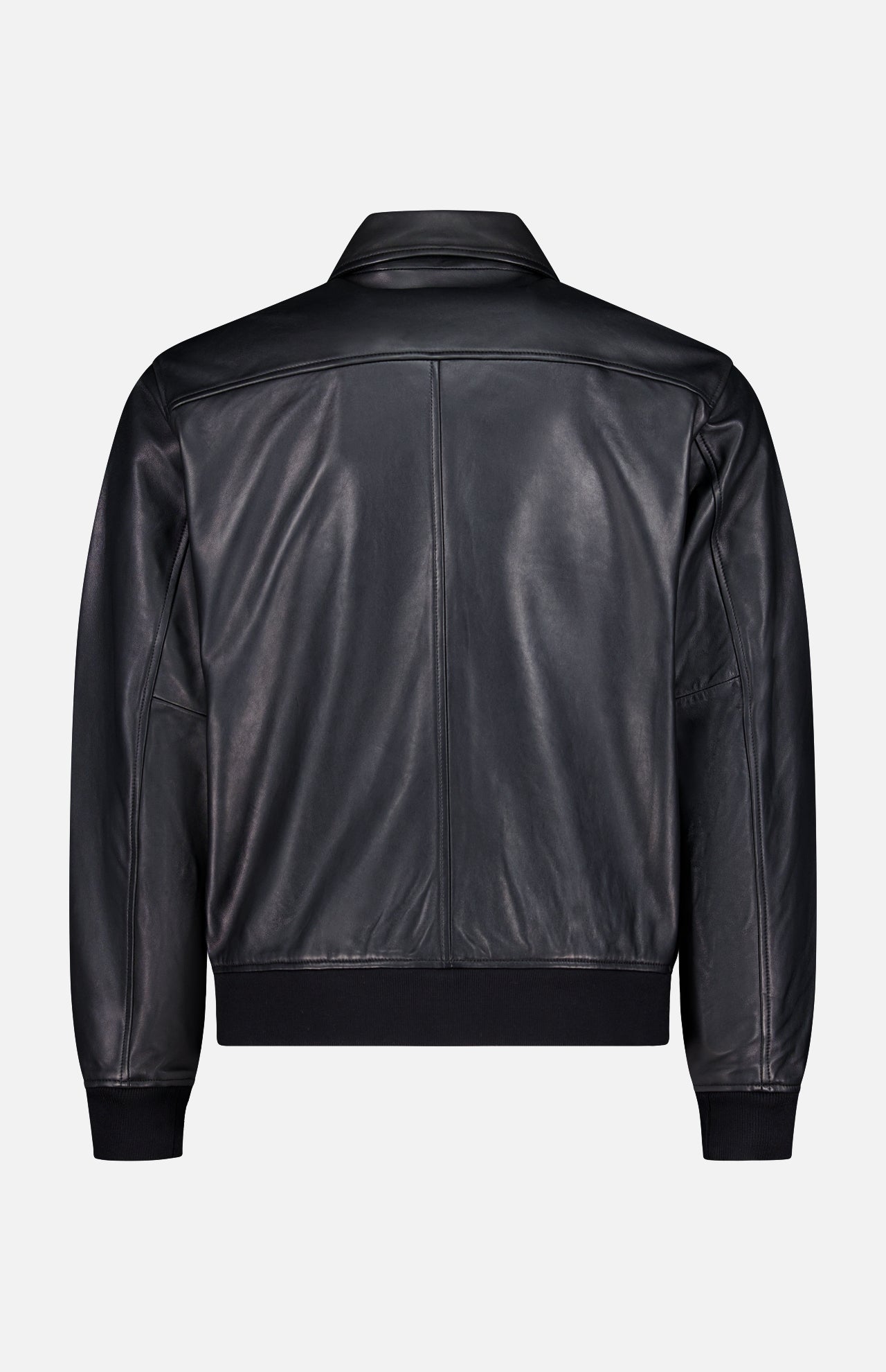 Elegance from all angles. This black leather blouson jacket is detailed with a spread collar, zip pockets and ribbed trims. It’s constructed in a standard fit with slightly dropped shoulders for added ease. The premium lamb leather delivers a smooth, luxurious feel. Styling is easy, the compliments are endless.