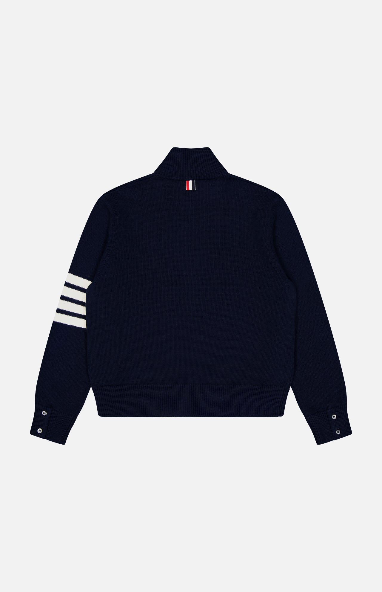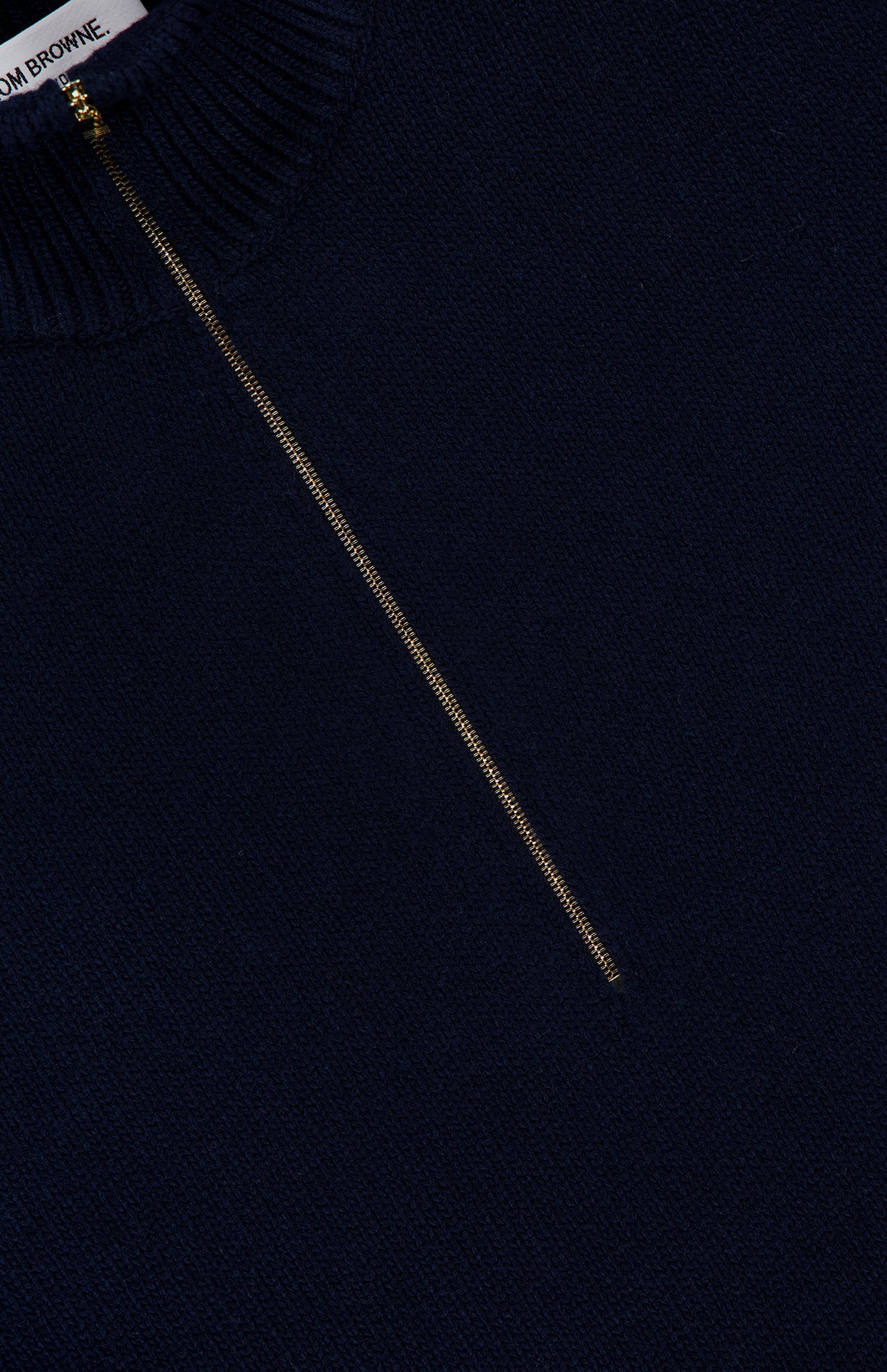 This navy knit top boasts quality craftsmanship and a true American sensibility to create an everyday uniform for the modern man. Simplify your closet with this funnel neck sweater with a zip neckline and the brand’s recognizable 4-bar stripe motif at the sleeve. Handsome details show up with grosgrain ribbon at the button cuffs and at the back neck. This is an easy choice for casual Fridays.