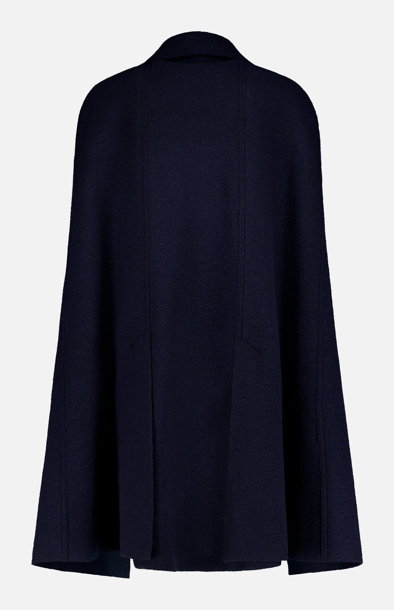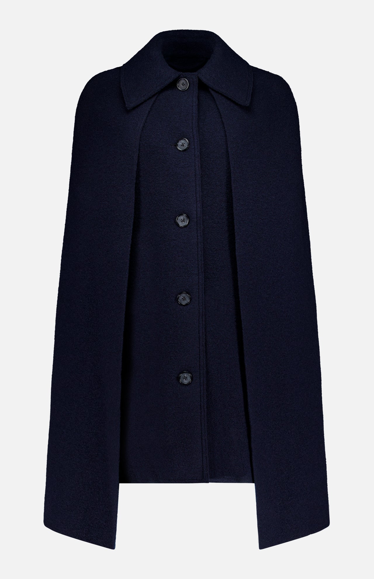 Shake up your outerwear routine. This navy cape coat is something different–a cool and chic silhouette that’s very elegant and fashion-forward. It’s crafted from a warm wool boucle finished with raw edges and long cape sleeves. There’s a spread collar and a simple, single-breasted design. Nights out feel even more special with this piece.
